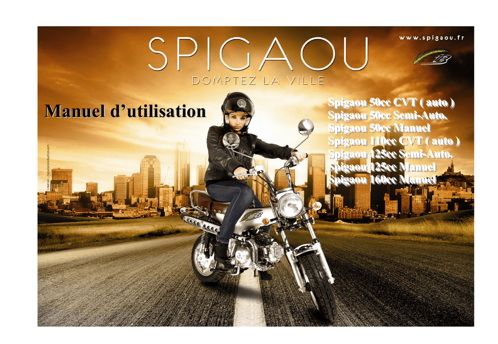 SSppiiggaaoouu 5500cccc C CV VTT (( aauuttoo )) SSppiiggaaoouu 5500cccc SSeem Auuttoo.. mii--A SSppiiggaaoouu 5500cccc M Maannuueell SSppiiggaaoouu 111100cccc C CV VTT (( aauuttoo )) SSppiiggaaoouu 112255cccc SSeem mii--A Auuttoo.. SSppiiggaaoouu 112255cccc M Maannuueell SSppiiggaaoouu 116600cccc M Maannuueell Manuel d’utilisation SPIGAOU -1- www.spigaou.fr Table des matières INFORMATIONS IMPORTANTES.................................................................................... - 4 DANGER : Lorsque l’intégrité physique du conducteur pet être affecté. Le non respect de cette consigne peut engendrer de graves blessures............................................................ - 5 AVERTISSEMENT : quand le non respect de cette consigne peut engendrer des dommages mécaniques. Cet avertissement concerne exclusivement l’intégrité mécanique de votre moto................................................................................................................................... - 5 NOTA : est une consigne informative concernant la maintenance et le nettoyage de votre machine. Elle a pour but de simplifier certaines exécutions ............................................. - 5 INFORMATIONS CONSOMMATEUR.............................................................................. - 8 Modification ...................................................................................................................... - 9 Repliage du guidon............................................................................................................ - 9 Localisation du numéro de série (Cadre et Moteur)........................................................ - 11 Notes personnelles............................................................................................................... - 12 IMPLANTATION............................................................................................................... - 15 INSTRUMENTATION, BOUTONS & MANETTES ....................................................... - 16 Clé, contacteur d’allumage.............................................................................................. - 16 Cadran, instrumentation .................................................................................................. - 17 Poignée guidon gauche.................................................................................................... - 18 Poignée guidon droite...................................................................................................... - 20 (13) Poignée d’accélérateur............................................................................................. - 21 SPIGAOU -2www.spigaou.fr (14) Verrou de selle ......................................................................................................... - 22 (15) Remplissage du réservoir d’essence ........................................................................ - 22 (16) Robinet d’essence .................................................................................................... - 23 Kick Starter...................................................................................................................... - 25 Pédale de frein arrière...................................................................................................... - 25 Sélecteur de vitesse à pied............................................................................................... - 26 Naiman/Verrouillage de la colonne de direction............................................................. - 28 Carburant & huile moteur :.................................................................................................. - 29 Rodage................................................................................................................................. - 31 Précaution avant le départ ................................................................................................... - 34 Premiers tours de roue ......................................................................................................... - 49 - SPIGAOU -3- www.spigaou.fr INFORMATIONS IMPORTANTES Les 1000 premiers kilomètres sont les plus importants pour la pérennité de votre moto. Un pré rodage de 100 Km à l’issu duquel une vidange vous est demandé, garantira encore une meilleure longévité de votre moteur. La fiabilité et la performance de votre moto sont tenues par la manière dont vous effectuez votre rodage. Afin de connaître le meilleur moyen de parfaire votre rodage, referez-vous au chapitre « rodage » Compulsez ce manuel attentivement, vous y trouverez toutes les informations liées au bon fonctionnement de votre moto. Si toutefois, vous ne trouveriez réponses à vos questions dans ce présent manuel, consultez le site www.james-b.fr et adressez vous au service technique dans la rubrique contact. Pour une meilleure compréhension dans la lecture de ce manuel, trois niveaux d’avertissement sont mis en place afin de mesurer l’importance des informations communiquées : • DANGER • AVERTISSEMENT • NOTA. SPIGAOU -4- www.spigaou.fr DANGER : Lorsque l’intégrité physique du conducteur pet être affecté. Le non respect de cette consigne peut engendrer de graves blessures. AVERTISSEMENT : quand le non respect de cette consigne peut engendrer des dommages mécaniques. Cet avertissement concerne exclusivement l’intégrité mécanique de votre moto. NOTA : est une consigne informative concernant la maintenance et le nettoyage de votre machine. Elle a pour but de simplifier certaines exécutions SPIGAOU -5- www.spigaou.fr INFORMATIONS CONSOMMATEUR Conseil pour l’installation d’accessoires Il y a une large gamme d’accessoires destinée aux propriétaires de SPIGAOU élaboré par SPIGAOU Une mauvaise combinaison dans le montage des accessoires peut nuire à la bonne conduite de la moto. Nous vous conseillons le