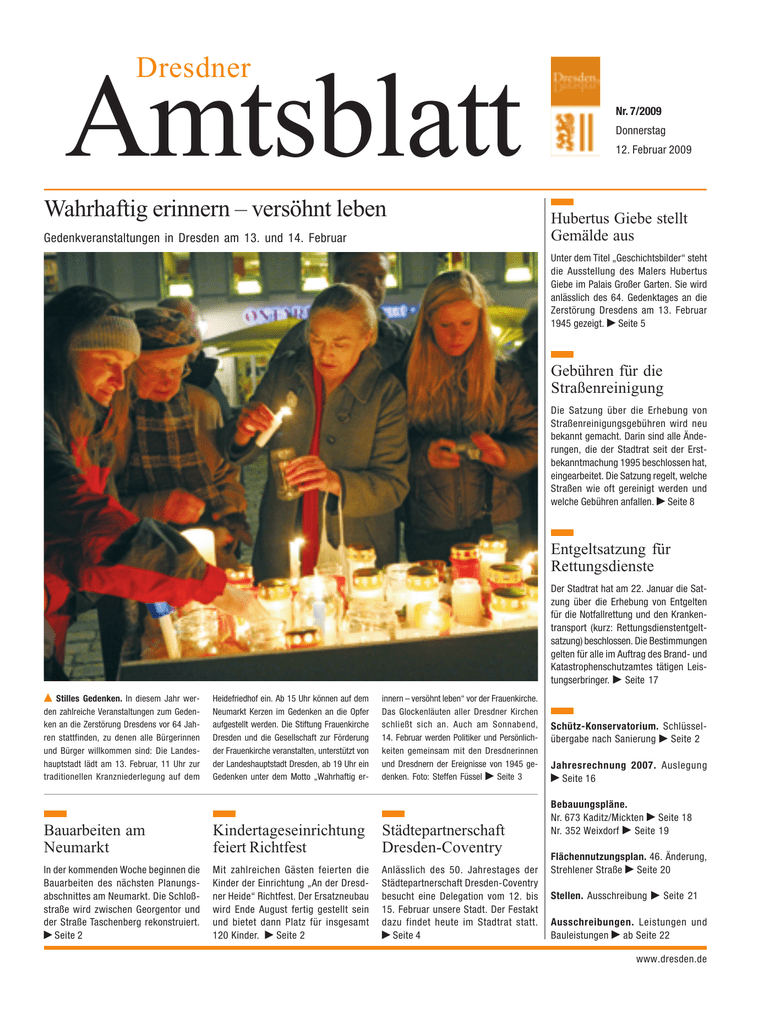 Dresdner Amtsblatt Wahrhaftig erinnern – versöhnt leben Gedenkveranstaltungen in Dresden am 13. und 14. Februar Nr. 7/2009 Donnerstag 12. Februar 2009 Hubertus Giebe stellt Gemälde aus Unter dem Titel „Geschichtsbilder“ steht die Ausstellung des Malers Hubertus Giebe im Palais Großer Garten. Sie wird anlässlich des 64. Gedenktages an die Zerstörung Dresdens am 13. Februar 1945 gezeigt. Seite 5 Gebühren für die Straßenreinigung Die Satzung über die Erhebung von Straßenreinigungsgebühren wird neu bekannt gemacht. Darin sind alle Änderungen, die der Stadtrat seit der Erstbekanntmachung 1995 beschlossen hat, eingearbeitet. Die Satzung regelt, welche Straßen wie oft gereinigt werden und welche Gebühren anfallen. Seite 8 Entgeltsatzung für Rettungsdienste Der Stadtrat hat am 22. Januar die Satzung über die Erhebung von Entgelten für die Notfallrettung und den Krankentransport (kurz: Rettungsdienstentgeltsatzung) beschlossen. Die Bestimmungen gelten für alle im Auftrag des Brand- und Katastrophenschutzamtes tätigen LeisSeite 17 tungserbringer. Stilles Gedenken. In diesem Jahr werden zahlreiche Veranstaltungen zum Gedenken an die Zerstörung Dresdens vor 64 Jahren stattfinden, zu denen alle Bürgerinnen und Bürger willkommen sind: Die Landeshauptstadt lädt am 13. Februar, 11 Uhr zur traditionellen Kranzniederlegung auf dem Heidefriedhof ein. Ab 15 Uhr können auf dem Neumarkt Kerzen im Gedenken an die Opfer aufgestellt werden. Die Stiftung Frauenkirche Dresden und die Gesellschaft zur Förderung der Frauenkirche veranstalten, unterstützt von der Landeshauptstadt Dresden, ab 19 Uhr ein Gedenken unter dem Motto „Wahrhaftig er- innern – versöhnt leben“ vor der Frauenkirche. Das Glockenläuten aller Dresdner Kirchen schließt sich an. Auch am Sonnabend, 14. Februar werden Politiker und Persönlichkeiten gemeinsam mit den Dresdnerinnen und Dresdnern der Ereignisse von 1945 gedenken. Foto: Steffen Füssel Seite 3 Bauarbeiten am Neumarkt Kindertageseinrichtung feiert Richtfest Städtepartnerschaft Dresden-Coventry In der kommenden Woche beginnen die Bauarbeiten des nächsten Planungsabschnittes am Neumarkt. Die Schloßstraße wird zwischen Georgentor und der Straße Taschenberg rekonstruiert. Seite 2 Mit zahlreichen Gästen feierten die Kinder der Einrichtung „An der Dresdner Heide“ Richtfest. Der Ersatzneubau wird Ende August fertig gestellt sein und bietet dann Platz für insgesamt Seite 2 120 Kinder. Anlässlich des 50. Jahrestages der Städtepartnerschaft Dresden-Coventry besucht eine Delegation vom 12. bis 15. Februar unsere Stadt. Der Festakt dazu findet heute im Stadtrat statt. Seite 4 Schütz-Konservatorium. Schlüsselübergabe nach Sanierung Seite 2 Jahresrechnung 2007. Auslegung Seite 16 Bebauungspläne. Nr. 673 Kaditz/Mickten Seite 18 Seite 19 Nr. 352 Weixdorf Flächennutzungsplan. 46. Änderung, Strehlener Straße Seite 20 Stellen. Ausschreibung Seite 21 Ausschreibungen. Leistungen und Bauleistungen ab Seite 22 www.dresden.de 2 Bauarbeiten am Neumarkt gehen weiter Der nächste Planungsabschnitt am Neumarkt wird voraussichtlich ab 16. Februar begonnen. Auftraggeber ist das Straßen- und Tiefbauamt der Stadt Dresden. Die Bauarbeiter rekonstruieren die Schloßstraße zwischen Georgentor und der Straße Taschenberg sowie das Kanzleigäßchen. Von der Straße Taschenberg bis zur Anbindung an die Wilsdruffer Straße wird im Zuge der Schloßstraße eine bisher nicht vorhandene Fahrbahn angelegt. Die Schössergasse, die Sporergasse und die Rosmaringasse werden neu angelegt. Die Fahrbahnen aller Straßen werden mit etwa 2120 Quadratmeter Großpflaster befestigt, die Gehbahnen erhalten insgesamt 3795 Quadratmeter Granitplattenbeläge, jeweils nach historischem Vorbild. Die neue öffentliche Beleuchtungsanlage im Zuge der Schloßstraße erhält historische Kandelaber. Auf der östlichen Seite der Schloßstraße in Höhe des Kulturpalastes und auf der Südseite der Rosmaringasse werden Straßenbäume gepflanzt. Die Stadtentwässerung Dresden GmbH, die DREWAG Stadtwerke GmbH und die Deutsche Telekom AG sanieren zeitgleich die Anlagen der Ver- und Entsorgung bzw. stellen diese neu her. Im Einzelnen erfolgen eine Neuverlegung von Fernwärme- und Fernkälteleitungen, die Auswechselung von Trinkwasserleitungen, die Umverlegung des Hausanschlusses des Kulturpalastes, die Neu- und Umverlegung von Strom- und Fernmeldekabeln sowie die Umbindung des Abwasserkanales in der Schloßstraße. Im gesamten Bauzeitraum vom 16. Februar bis zum 30. Juli 2010 kommt es zu Beeinträchtigungen im Fußgängerverkehr. Der öffentliche Parkplatz hinter dem Kulturpalast wird eingezogen. Die Kosten betragen etwa 1 991 000 Euro für den Straßenbau und für die Beleuchtungsanlagen. Rathaus-Turmuhr wird repariert Die Zeiger der Rathaus-Turmuhr stehen seit kurzem auf der 12 Uhr-Ausgangsposition. Am elektrischen Zeigerantriebswerk aus dem Jahr 1952 ist ein Schaden entstanden. Nun müssen der Steuerungsmotor und das Getriebe repariert werden. Dazu sind Spezialanfertigungen nötig. Es lässt sich noch nicht genau abschätzen, wann die Uhr wieder läuft. 12. Februar 2009/Nr. 7 Richtfest in der Kindertagesstätte „An der Dresdner Heide“ Am 6. Februar feierten die Kinder der Kindertagesstätte „An der Dresdner Heide“ mit Sozialbürgermeister Martin Seidel, Eltern, Architekten, Baufirmen und anderen zahlreichen Gästen das Richtfest des neuen Gebäudes. Das baulich verschlissene und asbestbelastete Altgebäude auf der Radeberger Straße 92 wird durch einen zweigeschossigen Neubau ersetzt. Der Ersatzneubau bietet Platz für 120 Kinder, davon 45 Krippenplätze und 75 Kindergartenplätze. Es entsteht ein sowohl kompaktes als auch kindgerecht gegliedertes, freundliches und lichtdurchflutetes Haus. Ende August soll die Kindertageseinrichtung fertig gestellt sein. Im Juli und August 2008 wurde das alte Gebäude abgerissen. Im Stein auf Stein. Die Kinder hatten gemeinsam mit Sozialbürgermeister Marti