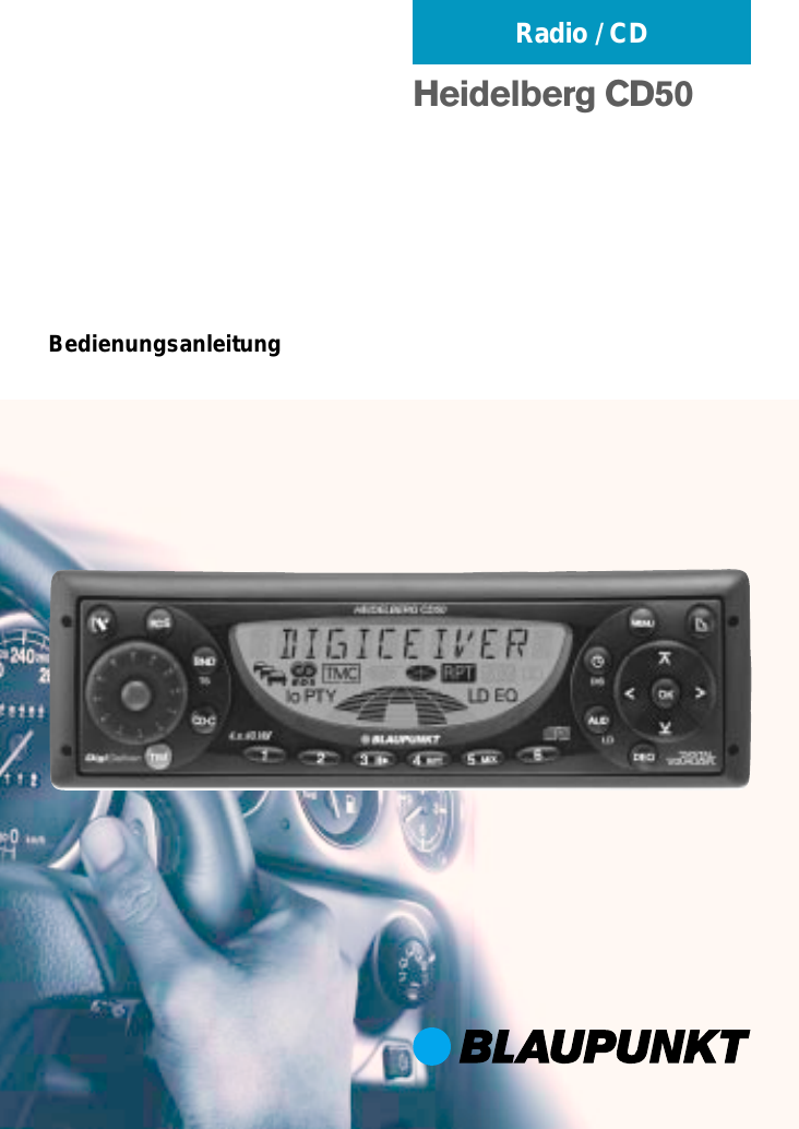 Radio / CD Heidelberg CD50 Bedienungsanleitung Bitte aufklappen Open here Ouvrir s.v.p. Aprite la pagina Hier openslaan a.u.b. Öppna Por favor, abrir Favor abrir 2 NEDERLANDS 5 16 15 7 14 13 8 12 11 10 SVENSKA 3 ESPAÑOL 1 9 ITALIANO 4 PORTUGUÊS 2 FRANÇAIS 6 3 ENGLISH DEUTSCH BEDIENELEMENTE 1 2 3 4 5 6 7 8 9 : ; < = > ? 4 -Taste, zum Entriegeln des Release-Panels Lautstärkeregler Taste, zum Ein-/Ausschalten des Gerätes, Stummschaltung (Mute) des Gerätes RDS-Taste, RDS Komfortfunktion ein-/ausschalten. Anzeige von Lauftexten wählen. BND-Taste, Wahl der FM-Speicherebenen und der Wellenbereiche MW und LW TS, startet die TravelstoreFunktion Display -Taste, zum Anzeigen der Uhrzeit im Display DIS, Display-Inhalte wechseln MENU-Taste, Aufrufen des Menüs für die Grundeinstellungen. -Taste, zum Öffnen des FlipRelease-Panels Pfeiltastenblock OK-Taste, zum Bestätigen von Menüeinträgen und Starten der Scan-Funktion DEQ-Taste, zum Ein-/Ausschalten des Equalizer AUD-Taste, Bässe, Höhen, Balance und Fader einstellen LD, zum Ein-/Ausschalten der Loudness-Funktion Tastenblock 1 - 6 CD•C-Taste, Quellenwahl zwischen Radio, CD und CD-Changer (wenn angeschlossen) @ TIM-Taste, zum Ein-/Ausschalten der Verkehrsfunkbereitschaft und der TIM-Funktion (Traffic Information Memory) Radiobetrieb einschalten ............... 10 RDS-Komfortfunktion (AF, REG) .... 10 Wellenbereich/Speicherebene wählen .......................................... 11 Sender einstellen ........................... 11 Empfindlichkeit des Sendersuchlaufs einstellen ............ 12 Sender speichern .......................... 12 Sender automatisch speichern ....... 12 Gespeicherte Sender abrufen ....... 12 Empfangbare Sender anspielen ..... 12 Anspielzeit einstellen ..................... 13 Programm-Typ (PTY) ..................... 13 Radioempfang optimieren .............. 14 Anzeige von Lauftexten wählen ...... 15 Verkehrsfunk .......................... 15 Traffic Information Memo (TIM) ....................................... 16 CD-Betrieb ............................. 17 CD-Betrieb starten ........................ 17 Titel wählen ................................... 17 Schneller Suchlauf (hörbar) ........... 17 Clock - Uhrzeit ....................... 22 Klang und Lautstärkeverhältnis ............... 24 Loudness ein-/ausschalten ... 24 Equalizer ................................ 25 Einstellhinweise ............................. 25 Equalizer ein-/ausschalten ............. 25 Equalizer einstellen ........................ 25 Einstellhilfe für den Equalizer ......... 26 Pegelanzeige einstellen ................. 27 Externe Audioquellen ............. 27 TMC für dynamische Navigationssysteme ............... 28 Technische Daten .................. 28 Einbauanleitung ................... 210 5 ENGLISH FRANÇAIS ITALIANO Radiobetrieb ........................... 10 CD-Changer-Betrieb starten .......... 19 CD wählen .................................... 19 Titel wählen ................................... 19 Schneller Suchlauf (hörbar) ........... 19 Anzeige wechseln ......................... 19 Einzelne Titel oder ganze CDs wiederholt abspielen ...................... 20 Titel in zufälliger Reihenfolge abspielen ....................................... 20 Alle Titel aller CDs anspielen ......... 20 Wiedergabe unterbrechen ............. 21 CDs benennen .............................. 21 NEDERLANDS Einschaltlautstärke einstellen ........... 9 Stummschaltung (Mute) ................... 9 Telefon-Audio/Navigation-Audio ....... 9 Lautstärke für Bestätigungston einstellen ....................................... 10 CD-Changer-Betrieb .............. 19 SVENSKA Abnehmbares Bedienteil ......... 7 Ein-/Ausschalten ..................... 8 Lautstärke regeln ..................... 9 Zufallswiedergabe der Titel ............ 17 Titel anspielen ............................... 17 Titel wiederholen ........................... 18 Wiedergabe unterbrechen ............. 18 Anzeige wechseln ......................... 18 Verkehrsdurchsage im CD-Betrieb .. 18 CDs benennen .............................. 18 CD entnehmen .............................. 19 ESPAÑOL Verkehrssicherheit ........................... 6 Einbau ............................................. 6 Zubehör .......................................... 6 Gewährleistung ............................... 6 Internationale Telefoninfo ................. 6 PORTUGUÊS Wichtige Hinweise .................... 6 DEUTSCH INHALTSVERZEICHNIS WICHTIGE HINWEISE Wichtige Hinweise Bevor Sie Ihr Autoradio in Betrieb nehmen, lesen Sie diese Anleitung sorgfältig und machen Sie sich mit dem Gerät vertraut. Bewahren Sie diese Anleitung für spätere Fragen im Auto auf. Verkehrssicherheit Die Verkehrssicherheit ist oberstes Gebot. Bedienen Sie Ihr Autoradiogerät nur, wenn es die Verkehrslage zuläßt. Machen Sie sich vor Fahrtantritt mit dem Gerät vertraut. Akustische Warnsignale der Polizei, Feuerwehr und von Rettungsdiensten müssen im Fahrzeug rechtzeitig wahrgenommen werden können. Hören Sie deshalb während der Fahrt Ihr Programm in angemessener Lautstärke. Einbau Wenn Sie Ihr Autoradiogerät selbst einbauen möchten, lesen Sie die Einbauund Anschlußhinweise am Ende der Anleitung. Zubehör Benutzen Sie nur von Blaupunkt zugelassenes Zubehör. Fernbedienung Mit der optionalen Fernbedienung RC 08 können Sie die Grundfunktionen Ihres Autoradiogerätes sicher und bequem vom Lenkrad aus ansteuern. Amplifier Alle Blaupunkt-Amplifier können verwendet werden. 6 CD-Wechsler (Changer) Es können folgende Blaupunkt-CDChanger angeschlossen werden: CDC A 06, CDC A 08, CDC A 072 und IDC A 09. Über ein Adapterkabel (Blaupunkt-Nr: 7 607 889 093) können auch die CDChanger CDC A 05 und CDC A 071 angeschlossen werden. Gewährleistung Der Umfang der Gewährleistung richtet sich nach den gesetzlichen Bestimmungen innerhalb des Landes, in dem das Gerät gekauft wurde. Ungeachtet der gesetzlichen Bestimmungen gewährt Blaupunkt zw