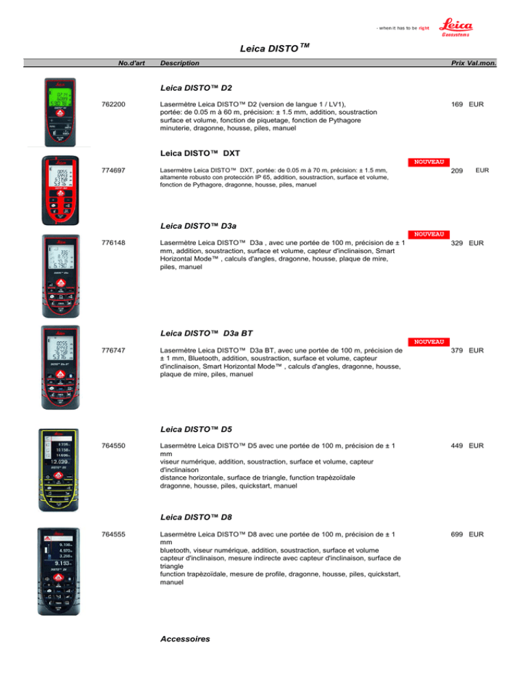 Description No.d'art Prix Val.mon. Leica DISTO TM No.d'art Description Prix Val.mon. Leica DISTO™ D2 762200 Lasermètre Leica DISTO™ D2 (version de langue 1 / LV1), portée: de 0.05 m à 60 m, précision: ± 1.5 mm, addition, soustraction surface et volume, fonction de piquetage, fonction de Pythagore minuterie, dragonne, housse, piles, manuel 169 EUR Leica DISTO™ DXT NOUVEAU 774697 Lasermètre Leica DISTO™ DXT, portée: de 0.05 m à 70 m, précision: ± 1.5 mm, altamente robusto con protección IP 65, addition, soustraction, surface et volume, fonction de Pythagore, dragonne, housse, piles, manuel 209 EUR Leica DISTO™ D3a NOUVEAU 776148 Lasermètre Leica DISTO™ D3a , avec une portée de 100 m, précision de ± 1 mm, addition, soustraction, surface et volume, capteur d'inclinaison, Smart Horizontal Mode™ , calculs d'angles, dragonne, housse, plaque de mire, piles, manuel 329 EUR Leica DISTO™ D3a BT NOUVEAU 776747 Lasermètre Leica DISTO™ D3a BT, avec une portée de 100 m, précision de ± 1 mm, Bluetooth, addition, soustraction, surface et volume, capteur d'inclinaison, Smart Horizontal Mode™ , calculs d'angles, dragonne, housse, plaque de mire, piles, manuel 379 EUR Leica DISTO™ D5 764550 Lasermètre Leica DISTO™ D5 avec une portée de 100 m, précision de ± 1 mm viseur numérique, addition, soustraction, surface et volume, capteur d'inclinaison distance horizontale, surface de triangle, function trapèzoïdale dragonne, housse, piles, quickstart, manuel 449 EUR Leica DISTO™ D8 764555 Lasermètre Leica DISTO™ D8 avec une portée de 100 m, précision de ± 1 mm bluetooth, viseur numérique, addition, soustraction, surface et volume capteur d'inclinaison, mesure indirecte avec capteur d'inclinaison, surface de triangle function trapèzoïdale, mesure de profile, dragonne, housse, piles, quickstart, manuel Accessoires 699 EUR Description No.d'art Prix Val.mon. Leica DISTO TM No.d'art 723777 780117 Description Prix Val.mon. Lunettes laser GLB10. Lunettes à verre rouge pour une meilleure visibilité (jusqu'à env. 10-15 m) du point laser dans des pièces claires et à l'exterieur. 20 EUR 49 EUR GLB30 3 in 1: Lunettes spéciales visibilité laser, Lunettes de sécurité, Lunettes de soleil NOUVEAU 667169 Sacoche noire. Protection contre la poussière et les secousses pour DISTO, surtout modèles DISTO plus. Avec poches supplémentaires pour le manuel d'utilisation et 35 EUR 723774 Jeu de plaques cible GZM27, à fixer avec de la pâte à modeler. Pour activités artisanales, par ex. aménagements de magasins. Dimensions plaque cible :73x98mm/1147x98mm. 29 EUR 723385 Plaques de mire GZM26, (format A4) 210 x 297mm 25 EUR 758184 Plaque de mire - Accessoire pour le Leica DlSTO™ D3 8 EUR 766560 Plaque de mire enfichable (197mm x 274 mm) A utiliser lors de la prise de repére au sol 25 EUR Description No.d'art Prix Val.mon. Leica DISTO TM No.d'art Description Prix Val.mon. 739200 Support de bras pour ordinateur de poche Leica DISTO plus. 38 EUR 757938 Trépied Leica TRI 100. Trépied professionnel permettant un ajustement précis sans difficulté. 72 EUR 769459 LSA 360 Adaptateur pour Leica DISTO D3, D5 et D8, à utiliser avec des cannes GPS avec des diamètres compris entre 11 et 35 mm, ou avec le Leica TRI 100 69 EUR 739801 Piece pour ccinpartiment des piles Leica DISTO™A5 13 EUR 751318 Pièce pour compartiment des piles Leica DISTO™ A6 14 EUR 739794 Pièce finale pour compartiment des piles Leica DISTO™ A8 15 EUR 739789 Clip de fixation noir pour compartiment des piles Leica DISTO™ A5 3 EUR 739838 Pièce pour compartiment des piles Leica DISTO™ A3 8 EUR 750710 Pièce pour compartiment des piles Leica DISTO™ A2 8 EUR 740802 Pièce finale pour Leica DISTO™ Classic5a 8 EUR 732571 Pièce finale pour Leica DISTO™ Classic5 8 EUR 738183 Pièce finale pour Leica DISTO™ Plus 8 EUR 732568 Pièce finale pour Leica DISTO™ Pro4 (à appui orientable) 8 EUR 732569 Pièce finale pour Leica DISTO™ Pro4 (à languette) 8 EUR Description No.d'art Prix Val.mon. Leica DISTO TM No.d'art Description Prix Val.mon. 726557 Adaptateur pour Leica DISTO™ Pro4 1/4" / 2 x M4 11 EUR 732567 Pièce finale pour Leica DISTO™ Classic4 8 EUR 732566 Pièce finale pour Leica DISTO™ Lite 4 8 EUR 733404 Pièce finale pour Leica DISTO™ Classic 3 8 EUR 732573 Clip pour compartiment à piles Leica DISTO™ Lite 5/ Classic 5/ Plus/ A5 3 EUR 722496 Lemo couvercle pour Disto Pro 3 EUR 732572 Clip pour compartiment des piles Leica DISTO™ Pro4a 3 EUR 760209 Couvercle pour compartiment des piles Leica DISTO™ D2 12 EUR 758162 Couvercle pour compartiment des piles Leica DISTO™ D3 10 EUR 765348 Couvercle pour compartiment des piles Leica DISTO™ D5, D8 10 EUR 732574 Dragonne pour DISTO Lite 5/ Classic 5/ Plus/ A3 / A5 7 EUR 760143 Dragonne pour DISTO D2/ D3/ D5/ D8 7 EUR 743347 Housse pour Leica DISTO™ A5, A6, A8 11 EUR 762198 Housse pour Leica DISTO™ D2 13 EUR 758192 Housse pour Leica DISTO™ D3 13 EUR Description No.d'art Prix Val.mon. Leica DISTO TM No.d'art Description Prix Val.mon. 766558 Housse pour Leica DISTO™ D5 / D8 13 EUR 743346 Housse pour Leica DISTO™ A3 11 EUR 752827 Housse pour Leica DISTO™ A2 11 EUR 731499 Housse (textile) pour Leica DISTO™ Classic 5 et Plus. Se porte à la ceinture 11 EUR 731500 Housse (textile) pour Leica DISTO™ Lite 5. Se porte à la ceinture 11 EUR 667489 Housse (textile) pour Leica DISTO™ Classic 3 / 4 et Lite 3 / 4. Se porte à la ceinture 11 EUR 723342 Sacoche (textile) pour Leica DISTO™ Pro4. Se porte à la ceinture. 11 EUR 65 EUR ATTENTION PRODUIT EN PHASE OUT: DANS LA LIMITE DES STOCKS DISPONIBLES 782669 Chargeur pour 4 piles de type AA/ R5 rechargeables Description No.d'art Prix Val.mon. Gamme Leica Lino No.d'art Description Prix Euros Val.mon. 757225 Laser ligne Leica LINO L2, pour des lignes horizontales et verticales. Mode pulsion avec économie d'énergie, combiné à un détecteur pour des applications en extérieur