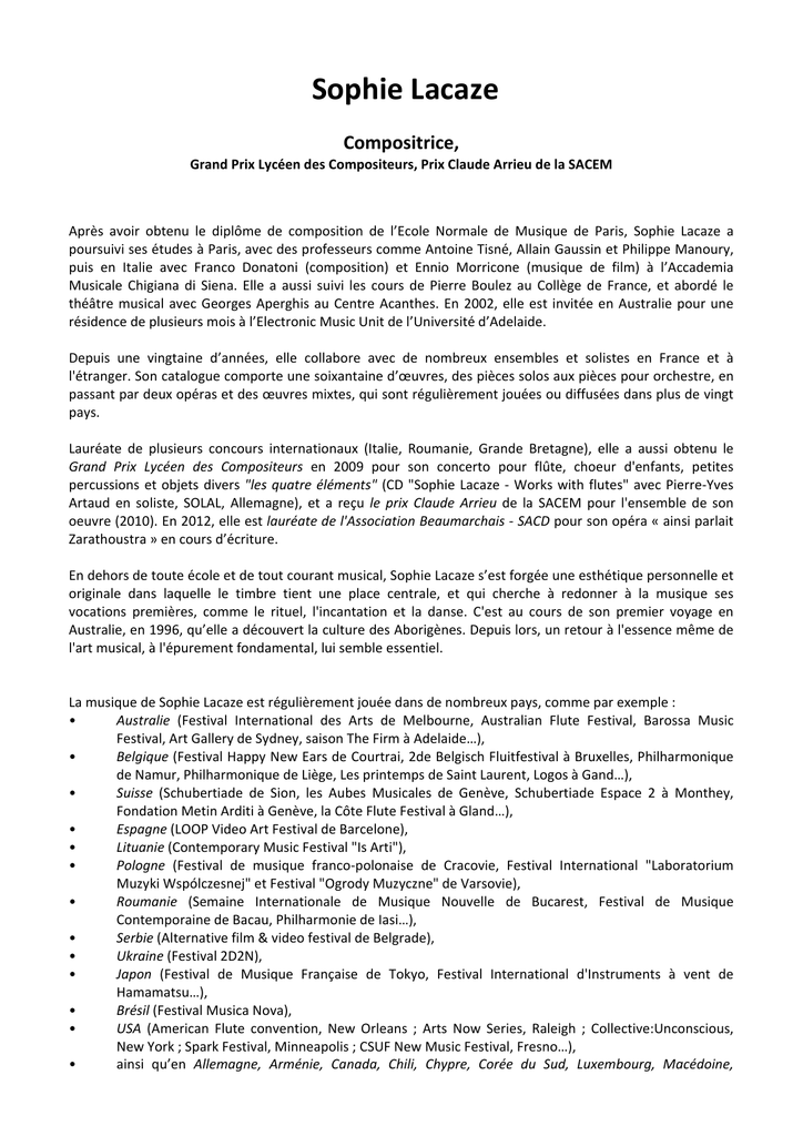 Sophie Lacaze Compositrice, Grand Prix Lycéen des Compositeurs, Prix Claude Arrieu de la SACEM Après avoir obtenu le diplôme de composition de l’Ecole Normale de Musique de Paris, Sophie Lacaze a poursuivi ses études à Paris, avec des professeurs comme Antoine Tisné, Allain Gaussin et Philippe Manoury, puis en Italie avec Franco Donatoni (composition) et Ennio Morricone (musique de film) à l’Accademia Musicale Chigiana di Siena. Elle a aussi suivi les cours de Pierre Boulez au Collège de France, et abordé le théâtre musical avec Georges Aperghis au Centre Acanthes. En 2002, elle est invitée en Australie pour une résidence de plusieurs mois à l’Electronic Music Unit de l’Université d’Adelaide. Depuis une vingtaine d’années, elle collabore avec de nombreux ensembles et solistes en France et à l'étranger. Son catalogue comporte une soixantaine d’œuvres, des pièces solos aux pièces pour orchestre, en passant par deux opéras et des œuvres mixtes, qui sont régulièrement jouées ou diffusées dans plus de vingt pays. Lauréate de plusieurs concours internationaux (Italie, Roumanie, Grande Bretagne), elle a aussi obtenu le Grand Prix Lycéen des Compositeurs en 2009 pour son concerto pour flûte, choeur d'enfants, petites percussions et objets divers "les quatre éléments" (CD "Sophie Lacaze ‐ Works with flutes" avec Pierre‐Yves Artaud en soliste, SOLAL, Allemagne), et a reçu le prix Claude Arrieu de la SACEM pour l'ensemble de son oeuvre (2010). En 2012, elle est lauréate de l'Association Beaumarchais ‐ SACD pour son opéra « ainsi parlait Zarathoustra » en cours d’écriture. En dehors de toute école et de tout courant musical, Sophie Lacaze s’est forgée une esthétique personnelle et originale dans laquelle le timbre tient une place centrale, et qui cherche à redonner à la musique ses vocations premières, comme le rituel, l'incantation et la danse. C'est au cours de son premier voyage en Australie, en 1996, qu’elle a découvert la culture des Aborigènes. Depuis lors, un retour à l'essence même de l'art musical, à l'épurement fondamental, lui semble essentiel. La musique de Sophie Lacaze est régulièrement jouée dans de nombreux pays, comme par exemple : • Australie (Festival International des Arts de Melbourne, Australian Flute Festival, Barossa Music Festival, Art Gallery de Sydney, saison The Firm à Adelaide…), • Belgique (Festival Happy New Ears de Courtrai, 2de Belgisch Fluitfestival à Bruxelles, Philharmonique de Namur, Philharmonique de Liège, Les printemps de Saint Laurent, Logos à Gand…), • Suisse (Schubertiade de Sion, les Aubes Musicales de Genève, Schubertiade Espace 2 à Monthey, Fondation Metin Arditi à Genève, la Côte Flute Festival à Gland…), • Espagne (LOOP Video Art Festival de Barcelone), • Lituanie (Contemporary Music Festival "Is Arti"), • Pologne (Festival de musique franco‐polonaise de Cracovie, Festival International "Laboratorium Muzyki Wspólczesnej" et Festival "Ogrody Muzyczne" de Varsovie), • Roumanie (Semaine Internationale de Musique Nouvelle de Bucarest, Festival de Musique Contemporaine de Bacau, Philharmonie de Iasi…), • Serbie (Alternative film & video festival de Belgrade), • Ukraine (Festival 2D2N), • Japon (Festival de Musique Française de Tokyo, Festival International d'Instruments à vent de Hamamatsu…), • Brésil (Festival Musica Nova), • USA (American Flute convention, New Orleans ; Arts Now Series, Raleigh ; Collective:Unconscious, New York ; Spark Festival, Minneapolis ; CSUF New Music Festival, Fresno…), • ainsi qu’en Allemagne, Arménie, Canada, Chili, Chypre, Corée du Sud, Luxembourg, Macédoine, • Pays‐Bas, Royaume‐Uni, Suède… et dans une trentaine de festivals et saisons musicales en France (comme par exemple le Festival de RadioFrance & Montpellier, les saisons de l'Opéra Orchestre National de Montpellier, de l'Orchestre National de Lyon, les 38e Rugissants, le Congrès mondial du saxophone SaxOpen, Festival "Aujourd'hui Musiques" à Perpignan, Festival de danse et des arts multiples de Marseille, Festival MIA, Journées nationales de l'électroacoustique, Le Son MiRé à Fabrezan, Musicora, Musique et Architecture à Angers, Musique Française en Provence, Piano à Mayenne, Printemps Musical d'Annecy, Rencontres Musicales ProQuartet de Fontainebleau, les Rencontres Contemporaines de Saint Privat d'Allier, Rencontres Internationales de Composition Musicale de Cergy‐Pontoise, saison de l'ensemble Itinéraire, Sons d'Automne à Annecy, les Vendredis baroques de Dardilly, ...) Parmi ses interprètes, on citera notamment • des orchestres : l’Orchestre Philharmonique de RadioFrance (dir. Pierre‐André Valade), I Solisti Veneti (dir. Claudio Scimone), l'Orchestre de Perpignan‐Méditerranée et la Camerata de France (dir. Daniel Tosi), l'Orchestre Philharmonique Mihail Jora de Bacau (dir. Ovidiu Balan), l'Orchestre de la Radio Roumaine (dir. Horia Andreescu), l'Orchestre de Flûtes Français (dir. Pierre‐Alain Biget, Paul Méfano, Joël Soichez), le Nouvel Orchestre de Chambre de Rouen (dir. Joachim Leroux), le Paris Mozart Orchestra (direction Claire Gibault), • des chœurs et ensembles vocaux : le choeur Calliope (dir. Régine Théodoresco), l'ensemble vocal Appoggiature (dir. Eliette Roche), l’ensemble Mora Vocis (dir. artistique Els Janssens‐Vanmunster), • des ensembles instrumentaux : le Quatuor Arcadie, le Trio à Cordes de Paris, le Quatuor Benaïm, le Trio 3D, Piano&Co, les ensembles Hélios, TM+, XASAX, le Quatuor Amarone (Allemagne), les quatuors de flûtes Hinémoa (Belgique) et Image (Italie), l'ensemble Tétraflûtes (Suisse), le Trio Aperto et l'ensemble Pro Contemporania (Roumanie), Le Kommandaria Sax Quartet (Chypre), le Canberra New Music Ensemble, NOW flute ensemble et Settembrini Trio (Australie), l’ensemble Antara (Chili)..., • des solistes : Pierre‐Yves Artaud, Natalie Dessay, 