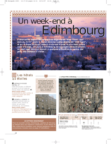 WE Escapade 2008 - 14-17:02-pages 14-21 15/11/07 12:01 Page 14 Un week-end à Edimbourg S'émerveiller devant les perspectives élégantes de "New Town" (qui date du XVIIIe siècle !), flaner dans les ruelles étroites de "Old Town", et sur le Royal Mile qui mène à Holyrood House, le plus beau palais royal d'Ecosse... Et puis, à Edimbourg, la campagne est toute proche : on peut loger dans un manoir à quelques kilomètres du centre, des golfs, des châteaux à visiter... Les hôtels 1/2 étoiles Le Royal Mile à Edimbourg. © www.britainonview.com De très agréables demeures, avec beaucoup de caractère sont également adaptées à la visite d'Edimbourg et de sa région, comme par exemple Dalhousie Castle ou Houstoun House : voir page 20 "Manoirs en Ecosse". 1 HERALD HOUSE HOTEL 2* Hôtel rénové dans un bâtiment de pierre, à 10 mn à pied de Princes Street. 45 chambres. P . Nous avons aimé : la proximité du plein centre, le restaurant assez rare dans cette catégorie. 2 ORWELL LODGE 2* Petit hôtel victorien dans un quartier calme, proche du centre, au sud-ouest d’Edimbourg. 10 chambres. Nous avons aimé : la taille de l’hébergement qui le rapproche d’un B&B et pourtant proche du centre. 1 Prix par personne en euro Selon hôtel choisi au départ de Paris SCOTTISH HOGMANAY Pour la nouvelle année, Edimbourg, capitale de l’Ecosse, se réfugie dans ses intérieurs chaleureux, et les dîners de fête respectent la tradition, avec danses gaéliques, kilts et cornemuses. Rendez-vous en page 37 (réveillons). 14 Hôtels 1/2 étoiles Herald House Hotel Orwell Lodge 1 Tarifs Week-End : 1er novembre au 31 mars Plan N° Week-end 2 nuits Nuit suppl. Supp. chambre indiv. par nuit 1 2 421 451 44 59 28 35 Ces tarifs ne sont pas valables pour Noël, Nouvel An et durant les matches de rugby (nous interroger). Par personne et par nuit : 1 Orwell Lodge : du dimanche au jeudi, réduction de 10 € - En novembre, février et mars, supplément de 5 € WE Escapade 2008 - 14-17:02-pages 14-21 15/11/07 12:01 Page 15 WEEK-END A EDIMBOURG EDIMBOURG : 262 km 2 13 11 8 6 3 15 4 9 12 10 14 5 7 1 2 Les hôtels 2/3 étoiles 3 FREDERICK HOUSE 6 HANOVER HOTEL 3* HOTEL 3* Au cœur de la ville, nouvel hôtel élégant et contemporain. 40 chambres. Pas de petitdéjeuner. Ouverte depuis Juin 98, cette townhouse est parfaitement située au centre d'Edimbourg, proche de nombreux restaurants. 43 chambres. P . Nous avons aimé : la qualité des équipements des chambres, le charme de l'ensemble. 4 JURY’S EDINBURGH INN HOTEL 3* Au centre, très proche du Royal Mile et de Princes Street, un hôtel au bon rapport qualité/prix. 186 chambres. Nous avons aimé : la situation idéale, les commentaires de nos clients. 5 EDINBURGH THISTLE HOTEL 3* Dans le quartier du West End, cette maison géorgienne de 1924 possède énormément de charme. 10 chambres. Nous avons aimé : le pub avec parfois des soirées traditionnelles, la taille humaine de l’hôtel. Nous avons aimé : le décor frais des chambres, la proximité de Princes Street et la situation idéale. 7 HAYMARKET HOTEL 3* 2 bâtiments victoriens qui forment un hôtel de charme et de caractère à quelques minutes à pied du centre. 25 chambres. P . Nous avons aimé : le bâtiment listé qui offre un séjour de charme à l’ancienne. 8 PARLIAMENT HOUSE 3* sup. Récente "Town House" (dans un bâtiment de 1700) située à quelques minutes de Princes Street, proche de la "Royal High School". 53 chambres. Nous avons aimé : un grand souci de la décoration et du confort. Promotion P 3e ou 4e nuit gratuite (nous consulter pour les conditions exactes) Autres vols France/Edimbourg page 17 Prix par personne en euro Selon hôtel choisi au départ de Paris Hôtels 2/3 étoiles Frederick House Jury’s Edinburgh Inn Hotel Edinburgh Thistle Hotel Hanover Hotel 1 Haymarket Hotel 1 Parliament House Tarifs Week-End : 1er novembre au 31 mars Plan N° Week-end 2 nuits Nuit suppl. Supp. chambre indiv. par nuit 3 4 5 6 7 8 445 473 473 473 493 493 56 70 70 70 80 80 37 59 70 70 33 56 Ces tarifs ne sont pas valables pour Noël, Nouvel An et durant les matches de rugby (nous interroger). Par personne et par nuit : 1 Hanover Hotel, Haymarket Hotel : du dimanche au jeudi, réduction de 19 € Le forfait comprend : le vol régulier Paris/Edimbourg direct, aller et retour (AF classe N, minimum de 2 nuits ou nuit de samedi à dimanche) les taxes d'aéroport le logement en hôtel selon la catégorie choisie, en chambre double ou triple (2 nuits), petit-déjeuner écossais inclus (sauf mention contraire) l'assurance assistance et rapatriement La « Nuit supplémentaire » comprend : le logement en hôtel selon la catégorie choisie, en chambre double ou triple (1 nuit), petit-déjeuner écossais inclus (sauf mention contraire) 15 WE Escapade 2008 - 14-17:02-pages 14-21 15/11/07 12:01 Page 16 Les hôtels 3/4 étoiles 9 ROXBURGHE HOTEL 4* Au cœur d'Edimbourg, un des plus célèbres hôtels de la ville, rénové entièrement en 2000. 197 chambres. Nous avons aimé : le bâtiment géorgien et sa situation, un hôtel historique. 10 HOLYROOD HOTEL 4* Nouvel hôtel au cœur de la ville, près du Parlement Ecossais, avec un petit centre de remise en forme. 156 chambres. 10 Ambiance de pub à Edimbourg. Nous avons aimé : la piscine (petite, 14 mètres, mais rare à Edimbourg), les commentaires de nos clients. © britainonview/ Natalie Pecht Les hôtels 4/5 étoiles 11 THE CHANNINGS HOTEL 4* 13 THE HOWARD HOTEL Non loin du centre, rénovée en 2004, une maison accueillante, évoquant les traditionnelles "country houses". 46 chambres. 5* Bel hôtel géorgien de 1820 (3 maisons de ville), avec peintures et meubles d’époque. 18 chambres. Nous avons aimé : le charme et le caractère d'un hôtel à part ; nous avons beaucoup aimé ! 12 THE BONHAM 11 Nous avons aimé : un havre de paix au cœur de la ville, un hôtel d’exception. HOTEL 4* 14 THE SCOTSMAN 5* Derrière une façade victorienne, un 