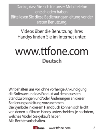 Danke, dass Sie sich für unser Mobiltelefon entschieden haben! Bitte lesen Sie diese Bedienungsanleitung vor der ersten Benutzung. Videos über die Benutzung Ihres Handys finden Sie im Internet unter: www.ttfone.com Deutsch Wir behalten uns vor, ohne vorherige Ankündigung die Software und das Produkt auf den neuesten Stand zu bringen und/oder Änderungen an dieser Bedienungsanleitung vorzunehmen. Die Symbole in diesem Handbuch können sich leicht von denen auf Ihrem Handy unterscheiden, je nachdem, welches Modell Sie gekauft haben. Alle Rechte vorbehalten. www.ttfone.com 3 Inhalt 1. Erste Schritte......................................................................................6 Installieren Sie die SIM-Karte und Akku................................6 Den Akku aufladen.........................................................................9 Akku-Anzeige ...................................................................................9 Niedriger Akku-Status...................................................................9 2. Ihr Telefon.........................................................................................10 Tasten-Funktionen.......................................................................11 Symbole in der Anzeige.............................................................12 3. Anrufe tätigen und entgegennehmen...............................13 Anrufe tätigen................................................................................13 Anrufe entgegennehmen:........................................................13 Einen Anruf beenden:.................................................................13 Wiederwahl einer Nummer.....................................................13 Internationale Anrufe tätigen.................................................14 Regulieren der Lautstärke.........................................................14 4. Hauptmenü.....................................................................................14 SMS......................................................................................................15 Addressbuch...................................................................................16 Anrufinformationen....................................................................18 Hilfsmittel.........................................................................................19 Rechner.............................................................................................19 Einstellungen..................................................................................19 4 www.ttfone.com 5. SOS Notfall-Taste...........................................................................22 6. Buchstaben und Zahlen eingeben.......................................24 7. Taschenlampe................................................................................25 8. Wecker...............................................................................................25 Diese Bedienungsanleitung enthält wichtige Sicherheitsinformationen. Bitte lesen Sie sich die folgenden Hinweise sorgfältig durch. Es kann gefährlich oder rechtswidrig sein, diese Hinweise nicht zu befolgen. Denken Sie daran, alle besonderen Regulierungen an bestimmten Orten (z.B. Flughafen, Krankenhaus) zu befolgen, und schalten Sie Ihr Handy immer aus, wenn dessen Benutzung verboten ist oder wo die Benutzung Interferenzen oder Gefahren hervorrufen könnte. Achtung! Das Standard-Passwort des Herstellers: 1122 Dieses Passwort kann dazu verwendet werden, die Einstellungen zu verändern. Es wird aber dazu geraten, dass Sie stattdessen Ihr eigenes Passwort auswählen. www.ttfone.com 5 1. Erste Schritte Installieren Sie die SIM-Karte und Akku Schalten Sie das Handy immer aus und ziehen Sie das Ladegerät heraus, bevor Sie den Akku entfernen. Halten Sie alle SIM-Karten von Kleinkindern fern. Für die Verfügbarkeit von Mobilfunknetzenund Informationen über die Funktionen Ihrer SIM-Karte kontaktieren Sie bitte Ihren SIM-Karten-Verkäufer. Diese können der Handy-Dienstleister, der Mobilfunknetzbetreiber oder ein anderer Anbieter sein. Die SIM-Karte und ihre Kontakte können durch Kratzer oder Biegen leicht beschädigt werden; seien Sie also beim Anfassen, Herein- und Herausnehmen bitte vorsichtig. 1. Öffnen Sie die Abdeckung des Akkus, indem Sie leicht auf die Rückseite des Handys drücken und die Abdeckung nach unten schieben. 6 www.ttfone.com 2. Schieben Sie die SIM-Karte in die Vertiefung unterhalb der kleinen Metall-Platte. (Um die SIMKarte zu entfernen, drücken Sie leicht darauf und schieben sie aus der Vertiefung heraus.) 3. Legen Sie den Akku an seinen Platz und achten Sie darauf, dass die 3 Metallstreifen auf dem Akku die 3 Metall-Nasen in der Vertiefung berühren. 4. Setzen Sie die Abdeckung des Akkus wieder auf. Geben Sie Acht, dass die Abdeckung genau aufliegt und ein kurzes Klicken zu hören ist. 5. Um das Handy anzuschalten, drücken und halten Sie die rote Taste, bis die Anzeige aufleuchtet. Um es auszuschalten, drücken und halten Sie dieselbe Taste, bis das Handy sich abschaltet. www.ttfone.com 7 Wenn Sie Ihr Telefon zum ersten Mal nach Einlegen der SIM-Karte anschalten, wird das Handy Sie nach Ihren NotrufEinstellungen fragen. Wählen Sie „EmNo.1„ und geben Sie die Telefonnummer von Freunden oder Verwandten ein, die Sie im Falle eines Notfalls kontaktieren möchten. Dann drücken Sie SPEICHERN. Das Handy wird Sie nun fragen, ob Sie eine Notruf-SMS (Textnachricht) an diese Nummer schicken möchten. Wählen Sie JA oder NEIN. Die Nummer ist nun gespeichert. Wenn Sie möchten, können Sie nun eine weitere NotrufNummer eingeben, indem Sie „EmNo.2„ wählen und die obengenannten Schritte wiederholen. Sie können bis zu 5 Notruf-Nummern eingeben. Wenn die SOS-Taste auf ihrem Handy gedrückt wird, schickt es automatisch eine SMS und ruft dann Ihre NotrufNummern der Reihe nach an, bis einer Ihrer Kontakte ans Telefon geht