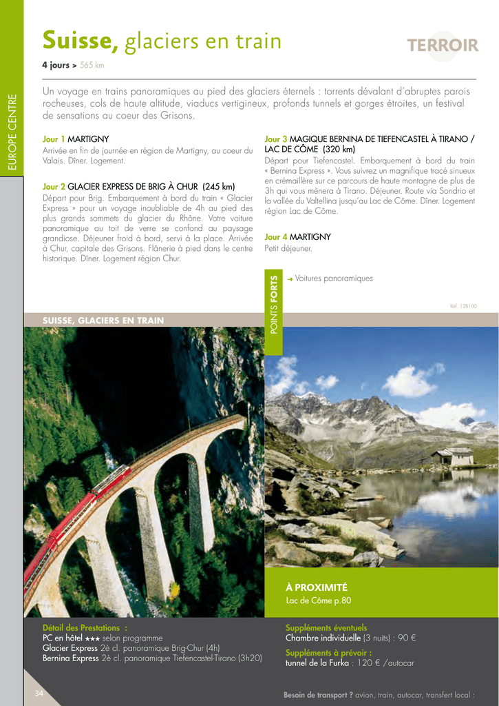 Suisse, glaciers en train terroir Un voyage en trains panoramiques au pied des glaciers éternels : torrents dévalant d’abruptes parois rocheuses, cols de haute altitude, viaducs vertigineux, profonds tunnels et gorges étroites, un festival de sensations au coeur des Grisons. Jour 1 Martigny Arrivée en fin de journée en région de Martigny, au coeur du Valais. Dîner. Logement. Jour 2 Glacier Express de Brig à Chur (245 km) Départ pour Brig. Embarquement à bord du train « Glacier Express » pour un voyage inoubliable de 4h au pied des plus grands sommets du glacier du Rhône. Votre voiture panoramique au toit de verre se confond au paysage grandiose. Déjeuner froid à bord, servi à la place. Arrivée à Chur, capitale des Grisons. Flânerie à pied dans le centre historique. Dîner. Logement région Chur. SUISSE, GLACIERS EN TRAIN Jour 3 Magique Bernina de Tiefencastel à Tirano / Lac de Côme (320 km) Départ pour Tiefencastel. Embarquement à bord du train « Bernina Express ». Vous suivrez un magnifique tracé sinueux en crémaillère sur ce parcours de haute montagne de plus de 3h qui vous mènera à Tirano. Déjeuner. Route via Sondrio et la vallée du Valtellina jusqu’au Lac de Côme. Dîner. Logement région Lac de Côme. Jour 4 martigny Petit déjeuner. POINTS FORTS europe centre 4 jours > 565 km Voitures panoramiques Réf. 12B100 à proximité Lac de Côme p.80 Détail des Prestations : PC en hôtel selon programme Glacier Express 2è cl. panoramique Brig-Chur (4h) Bernina Express 2è cl. panoramique Tiefencastel-Tirano (3h20) 34 Suppléments éventuels Chambre individuelle (3 nuits) : 90 € Suppléments à prévoir : tunnel de la Furka : 120 € /autocar Besoin de transport ? avion, train, autocar, transfert local : Martigny, trains du Valais suisse terroir Dégustation de fromage et de chocolats suisses, trajets spectaculaires et panoramas vertigineux en trains de montagne... Jour 1 Genève / Riviera Suisse / Martigny (130 km) Déjeuner à Genève. Tour guidé panoramique. Découverte de la «Riviera Suisse» le long des rives du lac Léman. Passage par Lausanne, Ouchy. Dîner. Logement région Bex - Martigny. Jour 2 Gstaad & le GoldenPass Panoramic (225 km) Excursion dans les alpages du «pays d’Enhaut». Visite du village de Gruyères et d’une fromagerie. Découverte de la fabrication suivie d’une dégustation. Déjeuner. Visite d’une fabrique de chocolat à Broc, suivie d’une dégustation. Poursuite jusqu’à Gstaad, célèbre station mondaine. Embarquement à bord du luxueux train « Goldenpass Panoramic ». Par les grandes vitres panoramiques, découvrez le magnifique paysage tout au long du trajet jusqu’à Montreux. Dîner. Logement. Jour 3 Capitale du Valais & lac souterrain (100 km) Visite d’une cave avec dégustation à Saillon. Poursuite pour Sion, capitale du Valais. Temps libre dans la vieille ville puis déjeuner. Route vers St Léonard. Promenade en barque sur le lac souterrain, le plus grand d’Europe avec ses 330 mètres de long à l’eau d’une limpidité exceptionnelle. Dîner. Logement. Jour 4 Montreux et train à crémaillère (80 km) Flânerie le long du lac Léman à Montreux. Trajet en train à crémaillère de Montreux aux Rochers de Naye. Déjeuner au restaurant d’altitude (2.050 m). Profitez du panorama exceptionnel sur tout le Léman. Visite du parc des marmottes et du centre didactique. Retour en train à Montreux. Dîner. Logement. Jour 5 Mines de sel de Bex (20 km) Visite guidée de ce fascinant monde souterrain. Après une présentation audio-visuelle historique, le train des mineurs vous conduira au coeur de la montagne salée. Découverte à pied des galeries à la recherche de «l’Or Blanc» comme les mineurs de jadis. Déjeuner. Réf. 12B102 MARTIGNY, TRAINS DU VALAIS SUISSE > Au rythme de vos envies... gastronomie Train du chocolat de mai à octobre 1 jour Embarquez à bord d’une authentique voiture pullmann « Belle Epoque » pour un trajet en 1ère classe de Montreux jusqu’à Gruyères, la patrie du fromage de Gruyères et du traditionnel et délicieux chocolat suisse ! Vevey 1/2 journée Atelier chocolat à Vevey Petit cours sur les origines et la fabrication du chocolat : tempérage, recettes et conseils pratiques sont au programme. Puis vous aurez le privilège de fabriquer vos propres chocolats ! Détail des Prestations : PC en hôtel région Bex-Martigny Visite guidée : Genève (2h). Visites avec dégustation : fromagerie, chocolaterie, cave. Goldenpass Panoramic 2è cl. Gstaad-Montreux Entrées : lac souterrain, mines de sel Train à crémaillère A/R Montreux-Rochers-de-Naye Consultez-nous : [email protected] - www.mondoramas.com Suppléments éventuels Chambre individuelle (4 nuits) : 120 € 35 europe centre 5 jours > 555 km Interlaken, lacs et glaciers terroir europe centre 5 jours > 295 km Lacs aux eaux cristallines, paysages de montagnes aux panoramas époustouflants depuis le massif de la Jungfrau ou du Mont Pilatus. A découvrir à pied, en bateau à vapeur, en train à crémaillère ou encore en téléphérique et cabine panoramique ! Jour 1 Lac de Brienz Arrivée en région du lac de Brienz. Dîner. Logement. Jour 2 Chutes de Trümmelbach et Massif de la Jungfrau (110 km) Départ pour la vallée de Lauterbrunnen. Visite des spectaculaires chutes de Trümmelbach. Prenez place à bord du train à crémaillère de Lauterbrunnen jusqu’à la Petite Scheidegg (2.061 m) à la découverte de l’époustouflant massif de la Jungfrau ! Déjeuner. En option par météo favorable, montée à Jungfraujoch, la plus haute gare d’Europe desservie par un train à crémaillère. Au terme d’un voyage spectaculaire, un panorama unique se dévoile sur la haute montagne et ses glaciers. Poursuite en train jusqu’à Grindelwald, le «village des glaciers». Dîner. Logement. Visite guidée d’Interlaken : la promenade du Höheweg, bordée d’un côté par les massifs de la Höhematte, et de l’