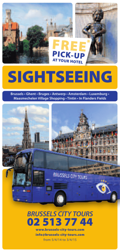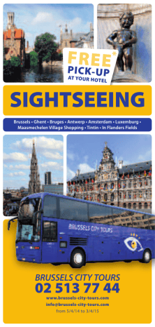 F R E E* P I C K- U P AT YOUR HO TE L SIGHTSEEING Brussels • Ghent • Bruges • Antwerp • Amsterdam • Luxemburg • Maasmechelen Village Shopping • Tintin • In Flanders Fields BRUSSELS CITY TOURS 02 513 77 44 www.brussels-city-tours.com [email protected] from 5/4/14 to 3/4/15 SCHEDULES & DAYS OF OPERATION Nuestros guias son profesionales, multilingues y dispuestos a contester a todas sus preguntas. Nuestos choferes son muy competentes y conducir ustds. In todo securidad los carreteras. BRUSSELS GRAND CITY TOUR 10.00 4 & A PANORAMA FREE * P I C K- U AT YOU R H OT • BRUSSELS GRAND CITY TOUR and CHOCOLATE 14.00 6 • • sunday • • • • • • • • • saturday friday thursday wednesday tuesday From 3rd November 2014 till 3rd April 2015 monday sunday saturday friday thursday • • • • • • • BRUSSELS GRAND CITY TOUR 14.00 8 and EUROPARLAMENTARIUM Unsere Führer sind erfahren, vielsprachig und stehen gerne zu Ihrer Verfügung um Ihre Fragen zu beantworten. Unsere Fahrer bringen Sie bequem nach Ihre Zielen auf unseren Strassen. wednesday tuesday DEPARTURE Nos guides sont des vrais professionnels, compétents et multilingues et sont prêts à répondre à toutes vos questions. Nos chauffeurs sont très expérimentés et vous conduisent confortablement et en toute sécurité sur nos routes. monday From 5th April 2014 till 2th November 2014 Our guides are very professional, competent and multilingual and ready to answer all your questions. Our drivers are very experienced and are driving you comfortable and safely on our roads. PAGE INTRODUCTION • • • Sunday only in July and August GHENT - BRUGES 09.00 10 • • • • • • • • • • • • • • NOT on Mo - We - Fr from 10 November till 21 March 2015 • BRUGES EXPRESS 11.00 12 P • • • Tuesday - Thursday - Sunday: ONLY from 1 July till 24 August EL ANTWERP - City of Rubens 13.15 14 • • • NOT in December - January February • • • Friday : from 11 July till 31 August • IN FLANDERS FIELDS 09.00 16 WORLD WAR I BATTLEFIELDS • • NOVEMBER 8th and 11th Th - Su from 5 April till 26 of October Saturday : from 12 July till 14 Sept. The BATTLE OF THE BULGE 09.00 18 BASTOGNE - Service of multilingual guides on all our tours except Maasmechelen Shopping and Tintin. - Languages : English, French, Spanish and German. German not on Luxembourg and Amsterdam, Spanish not on Flanders Fields and Battle of the Bulge. - Entrance fees (except otherwise speciied), meals and drinks are not included. - Free pick-up at your hotel in perimeter as mentioned above 30 min. before departure, drop-of near your hotel within walking distance. - We cannot held responsible for personal injury, delay because of strikes, blocked roads, irregularities due to traic, less and/ or theft of personal belongings. - Luxurious air-conditioned coaches, NO smoking on board - CHILDREN : under 4 = free ; from 4 to 12 : 50 % of, 12 year and older = student price BRUSSELS CITY TOURS rue du Marché aux Herbes 82 B 1000 BRUSSELS (Belgium) Phone: (00 32) 02/513.77.44 - www.brussels-city-tours.com *free pick-up at any hotel in a perimeter of 5 km around the Grand’place. Outside this perimeter and for hotels situated within a walking distance of less than 5 min. walking, pick-up is not possible. 2 • Tuesday from 3 June till 30 September AMSTERDAM - HOLLAND 09.00 20 • • • • Saturday from 8th March 2014 Tuesday and Saturday from 5 April Thursday from 3 July till 24 August • LUXEMBOURG - ARDENNES 09.00 22 BASTOGNE • Saturday till 15 November 2014 and from 14th of March 2015 • STOPS after 26th of October Friday from 15 July till 24 August TINTIN / Musée Hergé 14.00 24 • • • • Sundays : April 13 & 20, June 8th, July 13, 20 & 27, August 10,17, 24 & 31 Private Tours 25 BD COMICS 14.00 26 walking & driving tour 18th May - 20th July - 24th August 25th October ARCHITECTURE HORTA 10.00 27 Art Nouveau & Art Deco 11th May - 6th July - 10th August TINTIN - walking, driving tour 13.00 28 and visit TINTIN-MUSEUM COMBINATIONS CITY 10 AM & ANTWERP BEST OF BELGIUM • Saturday December 27th, January 3rd and February 14 & 21 29 MAASMECHELEN SHOPPING 10.00 30 22nd of November 13th April - 8th June - 14th Sep. 6th of December CITY 10 AM: daily - Antwerp: see p. 14 CITY 10 : daily - Antwerp: see p. 14 Ghent - Bruges: see p. 10 CITY 10 AM: daily - Antwerp: see p. 14 CITY 10 : daily - Antwerp: see p. 14 Ghent - Bruges: see p. 10 • • • • • • • • • • • • • • 3 BRUSSELS GRAND CITY TOUR & PANORAMA UNESCO ADULT 65+/STUDENT CHILDREN 30 € 27 € 15 € PANORAMIC VIEW FROM THE DOME BRUSSELS GRAND CITY TOUR & PANORAMA BRUSELAS GRANDE VISITA DE LA CIUDAD & PANORAMA Brussels compreshensive city tour – daily at 10.00 AM – Pick-up at hotel 30 min earlier – Duration 3hr00 – inclusive of PANORAMIC VIEW from the DOME of the BASILICA. Diario à las 10.00 – Recogida en el Hotel 30 min antes – Duracion 3h00 – include la acceso de la VISION PANORAMICA del DOMO. Our coachtour takes you along the magnificant St. Michaels’ cathedral towards the Laeken district : we see the Royal Residence, the Chinese Pavillion, the Japenese Tower and the world-famous Atomium. The tour continues with the national Basilica of Koekelberg, with its splendid art-deco interiors. Located on a hill, the enormous building is one of the most imposing churches in the world. Two lifts take you some 53 meters up from where you will have a breathtaking panoramic view of the city (entrance fee included). Taking you back to the city center, we drive along Congresscolumn towards the stately Place Royale, the Sablon district with its elegant stores selling beautiful antiques, and the impressive Law Courts. Then we reach the Royal Palace and the European district with the impressive buildings and offices of the European Parliament, the European Commission and Council of Ministers. In the park of the Jubilee you will marvel at the monu