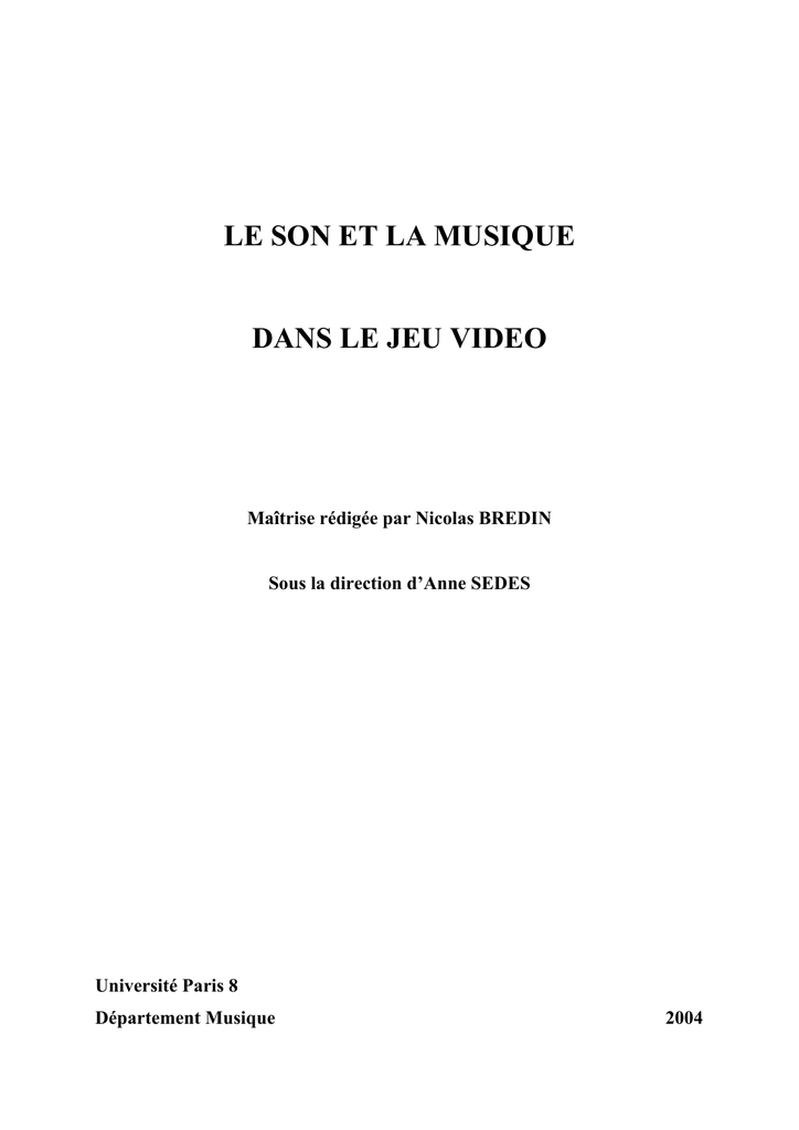 LE SON ET LA MUSIQUE DANS LE JEU VIDEO Maîtrise rédigée par Nicolas BREDIN Sous la direction d’Anne SEDES Université Paris 8 Département Musique 2004 Je remercie ma directrice de maîtrise, Anne SEDES, pour le temps qu’elle m’a consacré au cours de cette année et pour ses conseils précieux. 1 SOMMAIRE Introduction. ........................................................................................................ 4 I. Le son et la musique comme média interactif dans le jeu vidéo. ............................. 6 A. L’interactivité sonore et musicale dans le processus d’interactivité du jeu vidéo. ........ 6 1) Les concepts d’interactivité et d’adaptabilité pour le son et la musique dans le jeu vidéo. .............................................................................................................................. 6 a. Deux concepts utilisés de façon plus ou moins confuse. ....................................... 6 b. Une définition de l’interactivité et de l’adaptabilité sonore et musicale dans le jeu vidéo. ..................................................................................................................... 8 2) Le processus d’interaction entre l’utilisateur, le système de représentation et les éléments sonores. ......................................................................................................... 11 a. La capacité de représentation du jeu vidéo : « faire des mondes ». ..................... 11 b. Le réalisme et l’immersion dans le jeu vidéo....................................................... 12 c. Le rôle du son et de la musique dans le processus d’interaction entre l’utilisateur et le système de représentation............................................................................ 14 3) « Un vocabulaire d’objets audio » spécifique et immersif........................................... 16 a. Communication directe. ....................................................................................... 16 b. Communication indirecte. .................................................................................... 16 c. Communication environnementale. ..................................................................... 17 d. Sons indigènes...................................................................................................... 17 4) Les différents degré d’interactivité du son suivant la nature du gameplay. ................. 18 5) Le rapport entre l’image et le son : la complexité liée à l’interactivité....................... 22 a. La musique comme élément de continuité spatio-temporelle. ............................. 22 b. Fonction des bruitages.......................................................................................... 24 c. Traitement de la voix............................................................................................ 25 d. Points de vue et mouvements de caméra.............................................................. 25 B. Les technologies utilisées pour faire du son et de la musique un média interactif. ..... 28 1) Historique des progrès des technologies dédiées aux sons pour le jeu vidéo. ............. 28 a. Les consoles. ........................................................................................................ 28 b. Les ordinateurs. .................................................................................................... 30 2) Le MIDI........................................................................................................................ 33 a. Le MIDI, technologie et spécifications de base. .................................................. 33 b. L’assignement standardisé des voix, le General MIDI (ou GM)......................... 34 c. Le DLS (Downloadable Sounds) et le XMF (eXtensible Music Format), deux spécifications qui permettent l’interactivité de l’audio. ...................................... 34 3) L’audionumérique. ....................................................................................................... 36 a. L’échantillonnage................................................................................................. 36 b. Les techniques de compression. ........................................................................... 37 c. Les formats de fichiers audio les mieux adaptés aux jeux vidéo. ........................ 37 4) Des outils qui permettent l’intégration et l’interactivité de l’audio dans le jeu. ......... 40 Conclusion de la première partie.......................................................................................... 42 2 II. A. Procédés de composition et analyses sonores et musicales. .................................... 45 Procédés de composition.............................................................................................. 45 1) Quelles questions se poser avant d’aborder la composition d’une musique de jeux vidéo ? .......................................................................................................................... 45 2) Comment aborder la composition d’une musique interactive dans le jeu vidéo? ........ 46 a. Construire un « squelette » musical. .................................................................... 46 b. L’étude nécessaire des transitions musicales. ...................................................... 47 c. Définir l’opportunité des changements musicaux. ............................................... 48 d. Le problème de la répétition................................................................................. 48 3) Le choix de l’instrumentation et du style musical........................................................ 50 a. L’utilisation de plus en plus fréquente de l’orchestre. ......................................... 51 b. Exemples d’instrumentation et conclusion. ...
