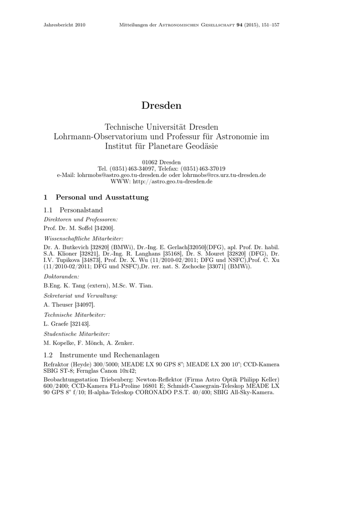 Jahresbericht 2010 Mitteilungen der Astronomischen Gesellschaft 94 (2015), 151–157 Dresden Technische Universität Dresden Lohrmann-Observatorium und Professur für Astronomie im Institut für Planetare Geodäsie 01062 Dresden Tel. (0351)463-34097, Telefax: (0351)463-37019 e-Mail: [email protected] oder [email protected] WWW: http://astro.geo.tu-dresden.de 1 Personal und Ausstattung 1.1 Personalstand Direktoren und Professoren: Prof. Dr. M. Soffel [34200]. Wissenschaftliche Mitarbeiter: Dr. A. Butkevich [32820] (BMWi), Dr.-Ing. E. Gerlach[32050](DFG), apl. Prof. Dr. habil. S.A. Klioner [32821], Dr.-Ing. R. Langhans [35168], Dr. S. Mouret [32820] (DFG), Dr. I.V. Tupikova [34873], Prof. Dr. X. Wu (11/2010-02/2011; DFG und NSFC),Prof. C. Xu (11/2010-02/2011; DFG und NSFC),Dr. rer. nat. S. Zschocke [33071] (BMWi). Doktoranden: B.Eng. K. Tang (extern), M.Sc. W. Tian. Sekretariat und Verwaltung: A. Theuser [34097]. Technische Mitarbeiter: L. Graefe [32143]. Studentische Mitarbeiter: M. Kopelke, F. Mönch, A. Zenker. 1.2 Instrumente und Rechenanlagen Refraktor (Heyde) 300/5000; MEADE LX 90 GPS 8”; MEADE LX 200 10”; CCD-Kamera SBIG ST-8; Fernglas Canon 10x42; Beobachtungsstation Triebenberg: Newton-Reflektor (Firma Astro Optik Philipp Keller) 600/2400; CCD-Kamera FLi-Proline 16801 E; Schmidt-Cassegrain-Teleskop MEADE LX 90 GPS 8” f/10; H-alpha-Teleskop CORONADO P.S.T. 40/400; SBIG All-Sky-Kamera. 152 2 Dresden: Lohrmann-Observatorium und Professur für Astronomie Gäste Dr. Ch. Skokos: 15.01.2010; (Vortrag: The Generalized Alignment Index (GALI) Method of Chaos Detection: Theory and Applications). Prof. L. Lindegren: Lund, Schweden, 17.03.2010; (Vortrag: Self-calibration in astrometry. What does it mean, and is Gaia the perfect example?). 3 Lehrtätigkeit, Prüfungen und Gremientätigkeit 3.1 Lehrtätigkeiten Von den Mitarbeitern der Professur wurden folgende Lehrveranstaltungen abgehalten: für Studenten des Bachelor-Studiengangens Geodäsie und Geoinformation: Physik für Geowissenschaftler; Astronomische Referenzsysteme: Sphärische Trigonometrie/Fachspezifische Datenverarbeitung, Referenzsysteme; Geodätisches Seminar; für Studenten des Diplomstudienganges Geodäsie: Astronomie (für Geodäten); Himmelsmechanik; Globale Geodynamik; Spezielle Sensorik in der Ingenieurgeodäsie Einführung in die Astronomie 1 (für alle Fakultäten und Lehramt); für Lehramtskandidaten ”Astronomie”: Astronomisches Seminar; Ausgewählte Kapitel der Astrophysik; Astrophysik 1 und 2; Astronomisches Praktikum; Vorträge im Planetarium des Lohrmann - Observatoriums. 3.2 Prüfungen Es wurden folgende Prüfungen abgenommen: für Studenten des Bachelor-Studienganges Geodäsie und Geoinformation: Physik für Geowissenschaftler 96; Sphärische Trigonometrie/Fachspezifische Datenverarbeitung 21; Referenzsysteme: 19; für Studenten des Diplomstudienganges Geodäsie: Astronomische Geodäsie 14; Spezielle Sensorik der Ingenieurgeodäsie 20. 3.3 Gremientätigkeit Soffel, M.: Mitglied in der IAU Commission 7, 19, 52; Soffel, M.: Mitglied der IAU Arbeitsgruppe ”Numerical Standards in Fundamental Astronomy (NSFA)”; Soffel, M.: Vize-Präsident der IAU Commission 52 ”Relativity in Fundamental Astronomy (RIFA)”; Klioner, S.: Präsident der GAIA-Entwicklungsgruppe (Development unit) ”Relativistic Models and Tests”; Klioner, S.: Vize-Präsident der IAU Division I ”Fundamental Astronomy” Klioner, S.: Mitglied in der IAU Commission 7, 52; Klioner, S.: Mitglied der GAIA-Koordinationsgruppen (Coordination units) ”Solar System”, ”Simulations” Klioner, S.: Mitglied des GAIA Science Teams der ESA. 4 - Wissenschaftliche Arbeiten Präzessions- und Nutationsbewegung der Erde, Astronomische Referenzsysteme, Post-Newton’sche Dynamik im Sonnensystem, Dynamik von Asteroiden, Beobachtungen von Asteroiden, Relativistische Modelle und Tests für Gaia Relativität in Himmelsmechanik und Astrometrie, Dresden: Lohrmann-Observatorium und Professur für Astronomie 153 - Geophysikalische Einflüsse auf das Erdschwerefeld, - Einfluss von Ozeanosphäre, Atmosphäre und Hydrosphäre auf die globale Geodynamik. 5 Akademische Abschlussarbeiten 5.1 Dissertationen Laufend: Tian, W.: Theorie und Datenanalyse großer Ringlaserkreisel. 6 Tagungen, Projekte am Institut und Beobachtungszeiten 6.1 Tagungen und Veranstaltungen - Gaia-Velocity Thinkshop; 16.03.-17.03.2010, ca. 10 Teilnehmer, - Sächsischer Tag der Schulastronomie (gemeinsam mit Sächsischem Bildungsinstitut); 30.03.2010, ca. 40 Teilnehmer, - Gaia AGIS-Meeting No. 13; 20.05.-21.05.2010, ca. 10 Teilnehmer, - Gaia REMAT-Meeting No. 8; 16.12.-17.12.2010, ca. 15 Teilnehmer. 6.2 Projekte und Kooperationen mit anderen Instituten (in 4. und 7.3. enthalten) - Relativistische Modelle und Tests für Gaia (BMWi-Projekt, koordiniert vom DLR, in Kooperation mit Universität Heidelberg, Observatorium Paris, Observatorium Nizza, ESAC (ESA)) - Konsistente post-Newton’sche Theorie der Erdrotation (DFG-Projekt in Kooperation mit Observatorium Paris) 6.3 Beobachtungszeiten Beobachtungen am 60cm-Newton-Teleskop auf dem Triebenberg mit der 16 Megapixel CCD-Kamera ProLine PL 16801, insbesondere zur Bestimmung der Grenzgröße des Systems sowie für die Positionsbestimmung von Asteroiden. Desweiteren Einsatz des mobilen 8”-Schmidt-Cassegrain-Systems in Verbindung mit digitaler Fototechnik für Planetenbeobachtungen im Rahmen der Ausbildung von Studenten. 7 Auswärtige Tätigkeiten 7.1 Nationale und internationale Tagungen - Gaia Science Team Meeting, 21.01.-22.01.2010, Noordwijk, Niederlande (Klioner). - Gaia-Seminar, 29.01.2010, Noordwijk, Niederlande (Klioner). - Tagung ”Theory and model for the new generation of the Lunar Laser Ranging data”, 16.02.-18.02.2010, Bern, Schweiz (Soffel, Klioner). - Tagung ”The international Flyby Collaboration: Investigation of the Flyby Anomaly at ISSI”, 01.03.-04.03.2010, Bern, Schweiz (Klioner). - Gaia-Tagung, 24.03.2010, Darmstadt, (Klione