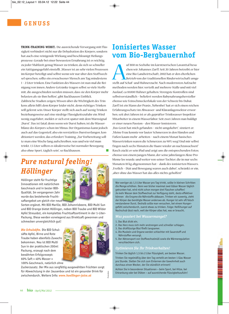 bio_02.12_Layout 1 03.04.12 12:22 Seite 44 GENUSS TRINK-TRAINING WIRKT. Die ausreichende Versorgung mit Flüs- sigkeit verhindert nicht nur die Dehydration des Körpers, sondern hat auch eine reinigende Wirkung und beschleunigt Heilungsprozesse. Gerade bei einer bewussten Ernährung ist es wichtig, zu jeder Mahlzeit genug Wasser zu trinken, da sich so schneller ein Sättigungsgefühl einstellt. „Wasser ist an sehr vielen Prozessen im Körper beteiligt und selbst wenn wir nur über den Stoffwechsel sprechen, sollte ein erwachsener Mensch am Tag mindestens 1 – 2 Liter trinken. Eine Funktion des Wassers ist nun mal die Reinigung von innen. Andere Getränke tragen selbst so viele Stoffe mit, die ausgeschieden werden müssen, dass sie den Körper mehr belasten als sie ihm helfen“, gibt Backhausen Einblick. Zahlreiche Studien zeigen, Wissen über die Wichtigkeit des Trinkens allein hilft dem Körper leider nicht, denn richtiges Trinken will gelernt sein. Unser Körper stellt sich auch auf wenig Trinken beziehungsweise auf eine niedrige Flüssigkeitszufuhr ein. Wird wenig zugeführt, meldet er sich erst später mit dem Warnsignal „Durst“. Das ist fatal, denn wenn wir Durst haben, ist die Wasserbilanz des Körpers schon im Minus. Der Organismus kann jedoch auch auf das Gegenteil, also ein verstärktes Durstverlangen, konditioniert werden, das erfordert Training. „Zur Vorbereitung sollte man eine Woche lang aufschreiben, was und wie viel man trinkt. 1,5 Liter sollten es idealerweise bei normaler Bewegung, also ohne Sport, täglich sein“, so Backhausen. n Pure natural feeling! Höllinger Höllinger steht für fruchtige Innovationen mit natürlichem Geschmack und in bester BIOQualität. Im vergangenen Jahr wurde das bestehende Fruchtsaftangebot um gleich vier neue Sorten ergänzt. Mit BIO Marille, BIO Johannisbeere, BIO Multi Sun und BIO Orange bietet Höllinger, neben BIO Traube und BIO Wilder Apfel Streuobst, ein komplettes Fruchtsaftsortiment in der 1-LiterPackung. Diese werden vorwiegend aus Direktsaft gewonnen und schmecken unvergleichlich gut! 44 bio - April/Mai 2012 A uf 1100 m Seehöhe im kärntnerischen Lavanttal besuchen wir Johannes Zarfl. Seit 20 Jahren betreibt er hier eine Bio-Landwirtschaft; 2002 hat er den elterlichen Betrieb von der traditionellen Rinderwirtschaft umgestellt auf Schaf- und Hühnerzucht. Nach modernsten Aufzuchtmethoden werden hier, verteilt auf mehrere Ställe und mit viel Auslauf, ca 10.000 Hühner gehalten. Strengste Kontrollen sind selbstverständlich – beliefert werden Babynahrungshersteller ebenso wie Feinschmeckerlokale von der Schweiz bis Dubai. Zarfl ist ein Mann der Praxis: „Nebenbei“ hat er sich einen reichen Erfahrungsschatz im Abwasser- und Kläranlagensektor erworben, seit drei Jahren ist er als geprüfter Trinkwasser-Inspektor Mitarbeiter in einem Wasserlabor. Seit zwei Jahren nun huldigt er einer neuen Passion – den Wasser-Ionisierern. „Das Gerät hat mich gefunden – nicht umgekehrt“, sinniert er. „Meine Frau konnte vor lauter Schmerzen in den Händen und Füßen kaum mehr arbeiten – nach einem Monat basisches Wassertrinken waren die Schmerzen zu 90% weg! Und mir selbst fingen nach sechs Monaten die Haare wieder an nachzuwachsen!“ Rasch zückt er sein iPad und zeigt uns die entsprechenden Fotos; ebenso von einem jungen Mann, der seine jahrelangen Akne-Probleme los wurde, und weiter von seiner Tochter, die in nur sechs Monaten 18 kg abgenommen hat – dank des ionisierten Wassers. „Freilich – Diät und Bewegung waren auch dabei“, schränkt er ein, „aber ohne das Wasser hat das alles nichts geholfen!“ Wer weniger als 1,5 Liter Wasser pro Tag trinkt, sollte in kleinen Schritten die Menge erhöhen. Denn wer bisher maximal zwei Gläser Wasser täglich getrunken hat, wird nicht schon morgen drei Flaschen schaffen! Je mehr Wasser dem Stoffwechsel zur Verfügung steht, desto effektiver können die Enzyme die Nährstoffe abbauen. Trinken wir zuwenig, zieht der Körper das benötigte Wasser anderswo ab. Hunger ist sehr oft falsch verstandener Durst. Deshalb sollte man versuchen, bei einem Hungergefühl zwischendurch, zuerst etwas zu trinken. Folge: Heißhunger auf Nachschub lässt nach, weil der Körper alles hat, was er braucht. Was passiert bei Wassermangel? 1. Das Blut dickt ein. 2. Das Herz muss sich mehr anstrengen und schneller schlagen. 3. Das dickflüssige Blut fließt langsamer. 4. Die Muskeln und Organe werden schlechter mit Sauerstoff und Nährstoffen versorgt. 5. Der Abtransport von Stoffwechselmüll sowie die Wärmeregulation verschlechtern sich. Optimieren Sie Ihr Trinkverhalten! Trinken Sie täglich 1,5 bis 2 Liter Flüssigkeit, am besten Wasser. Trinken Sie regelmäßig über den Tag verteilt am besten 1 Glas Wasser pro Stunde. Stellen Sie sich zum Einlernen der Gewohnheit auch durchaus einen Wecker, der Sie stündlich erinnert! Promotion Bio Schulsäfte. Die BIO Schulsäfte Apfel, Birne und Rote Traube haben ebenfalls Zuwachs bekommen. Neu ist BIO Multi Sun in der praktischen 200ml Packung, erzeugt nach dem bewährten Erfolgsrezept: 60% Saft + 40% Wasser = 100% Geschmack, natürlich ohne Zuckerzusatz. Der Mix aus sorgfältig ausgewählten Früchten sorgt für Abwechslung in der Jausenbox und ist ein gesunder Drink für zwischendurch. Weitere Info: www.hoellinger-juice.at Ionisiertes Wasser vom Bio-Bergbauernhof Achten Sie in besonderen Situationen – beim Sport, bei Hitze, bei Erkrankung oder bei Diäten – auf ausreichende Flüssigkeitszufuhr! bio_02.12_Layout 1 03.04.12 12:22 Seite 45 GENUSS Der Ionisierer steht in der Küche, unmittelbar neben der Spüle. Johannes Zarfl führt uns vor, wie einfach das Gerät an den Wasserhahn anzuschließen und zu bedienen ist. Und mit spürbarer Begeisterung beantwortet er unsere Fragen nach der Funktionsweise des Geräts: „Das „Herzstück“ eines Ionisierers ist die Elektrolysezelle. Dort wird das Leitungswasser in einen sauren und einen basischen Teil au