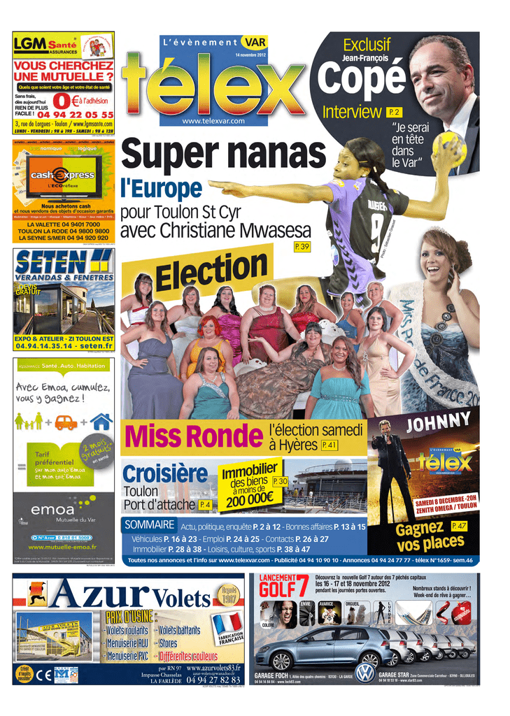 14 novembre 2012 P. 2 Pho to : S ébas tien Gras set LGM maq 60X2 TLX 1659 s.46/12 LA VALETTE 04 9401 7000 TOULON LA RODE 04 9800 9800 LA SEYNE S/MER 04 94 920 920 P. 39 CASH EXPRESS maq 60X2 TLX 1659 s.46/12 SETEN maq 60x2 TLX 1659 s.46/12 P. 41 P. 30 P. 4 Actu, politique, enquête P. 2 à 12 - Bonnes affaires P. 13 à 15 P. 47 Véhicules P. 16 à 23 - Emploi P. 24 à 25 - Contacts P. 26 à 27 Immobilier P. 28 à 38 - Loisirs, culture, sports P. 38 à 47 Toutes nos annonces et l’info sur www.telexvar.com - Publicité 04 94 10 90 10 - Annonces 04 94 24 77 77 - télex N°1659- sem.46 MUTUELLE DU VAR 120x2 1659 s.46/12 AZUR VOLETS maq 135x65 Tlx 1659 s.46/12 CAPSTORE demi bandeau MAQ- 135x65 1659 s.46/12 Primaire UMP L’ é v è n e m e n t Interview VAR Jean-François Coppé « J’arriverai en tête dans le Var » Exclusive Cela fait un peu plus de 6 mois que François Hollande est Président de la République. Quel bilan tirez-vous ? Il est accablant. A tous les niveaux. Sur le plan économique et social, en matraquant les Français avec 33 milliards € d’impôts nouveaux en 6 mois, François Hollande a mis le pays à genoux. Il a raté le tournant de la compétitivité en ne reprenant pas les recommandations du rapport Gallois. Le laxisme et l’impunité sont de retour : l’arsenal pénal est démantelé par Christiane Taubira. Manuel Valls facilite les régularisations des clandestins et brade l’accès à la nationalité française. Le gouvernement s’interroge sur la dépénalisation totalement folle du cannabis. En cherchant des boucsémissaires comme les « riches », les entrepreneurs, les retraités, les professions libérales, François Hollande divise la communauté nationale. Je suis très inquiet, François Hollande n’est pas au niveau requis par sa fonction. Pour reprendre un ancien slogan, l'antisarkozysme, cela ne marche pas ? François Hollande a fait campagne sur une imposture, niant la crise et expliquant qu’il suffisait que Nicolas Sarkozy parte pour que tout aille mieux. Or, Nicolas Sarkozy n’est plus Président et chacun voit que la crise s’aggrave et le chômage augmente, que l’insécurité n’a pas diminué, au contraire. Depuis son départ, la France n’a jamais été aussi fissurée. La France ne semble plus gouvernée ! 6 mois de « Hollandisme » ont montré que le Sarkozysme n’était pas le problème de la France, mais sa solution ! Comme Christophe Colomb, le gouvernement navigue à vue, mais, à la différence c’est qu’il n’y a pas l’ Amérique au bout ! Je crains que François Hollande nous mène plutôt vers un pays comme l’Espagne que le socialiste Zapatero a laissée dans une crise gravissime après près 8 ans de pouvoir. Jean-François Copé et Philippe Vittel Avec le rapport Gallois Hollande n'est-il pas en train de réinventer la TVA sociale ? Malheureusement non, cela n’a rien à voir ! François Hollande, augmente bien la TVA, ce qu’il avait juré de ne jamais faire, mais sans baisser le coût du travail. Il créé un mécanisme très bureaucratique de crédit d’impôt. Cela ne suffira pas à redonner de l’air à nos entreprises. Surtout qu’en parallèle, il a ponctionné comme jamais nos entreprises et se refuse à toute réforme structurelle. Pour réformer la France, il faut du courage politique et François Hollande en manque cruellement. Vous dites souvent que le gouvernement ne sait pas où il va, un peu comme Christophe Colomb ? Face à l'impréparation des socialistes, vous estimez que les débats de société qui sont lancés ne sont qu'un nuage de fumée ? Hélas oui ! Pour masquer leurs difficultés, les socialistes multiplient les propositions polémiques dans le domaine sociétal : droit de vote des étrangers, dépénalisation du cannabis, mariage et adoption pour les couples homosexuels. Autant de projets auxquels je suis totalement opposé. Dans ce contexte, les militants de l’UMP n'ont ils pas un devoir de résistance ? C’est tout le sens de ma candidature ! Face à une gauche qui détient tous les pouvoirs, l’UMP est le dernier lieu de résistance en France. C’est pourquoi, je déTLX 1659 s.46 - Page 2 fends la ligne d’une droite républicaine, moderne et décomplexée. Décomplexée parce que je refuse de me taire face aux injonctions d’une gauche bien-pensante. Parce que si je refuse toute alliance avec le FN, j’ai dénoncé le racisme anti-blanc et les pressions communautaristes en période de ramadan. Parce que jamais je n’appellerai à voter pour un PS qui n’a aucune honte à s’allier avec l’extrême gauche. Parce que je revendique de mener une opposition qui ne laissera rien laisser passer à la gauche et combattra par tous les moyens les projets du gouvernement. La gauche n’est pas propriétaire de la rue ! Cette ligne est la seule qui peut nous permettre de partir à la reconquête dès 2014. Votre campagne pour la présidence de l'UMP ne risque-t-elle pas de laisser des traces de division ? Ce qui compte, c’est que nous soyons unis face à la gauche. Le rassemblement, ce n’est pas pour moi un slogan de campagne, c’est un esprit qui m’anime tous les jours. Si l’UMP n’a pas explosé depuis deux ans que je suis à sa tête, c’est que je fais tout pour préserver l’unité de notre parti. Vous êtes venu dans le Var plusieurs fois, l’un des seuls départements français à avoir voté massivement pour l’UMP aux dernières élections... Le Var est un département magnifique, que je connais bien. Le Var a montré une remarquable fidélité à Nicolas Sarkozy ! J’y ai tissé des liens humains très forts, avec mes amis Philippe Vittel et Olivier Audibert-Troin ainsi qu’avec les militants qui font preuve ici d’un engagement qui force l’admiration. J’avais été profondément touché par l’accueil qu’ils m’avaient réservé lors d’un meeting à Draguignan le 6 octobre. Malgré certaines prévisions, quelque chose me dit que j