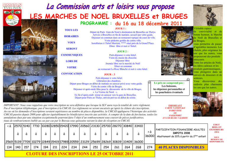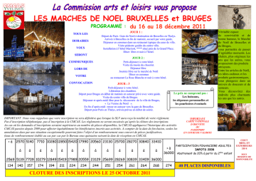 LES MARCHES DE NOEL BRUXELLES et BRUGES PROGRAMME : du 16 au 18 décembre 2011 JOUR 1 : TOUS LES Départ de Paris Gare du Nord à destination de Bruxelles en Thalys. Arrivée à Bruxelles en fin de matinée, accueil par votre guide, Déjeuner en commun dans un restaurant typique du cœur de ville. Visite pédestre guidée du centre ville. Installation à l’hôtel Marriott, **** situé près de la Grand’Place. Dîner libre et nuit à l’hôtel. HORAIRES VOUS SERONT JOUR 2 : COMMUNIQUES Petit-déjeuner à votre hôtel. Visite du musée du chocolat. Déjeuner libre Journée libre sur le marché de Noël Dîner en commun au restaurant La Rose Blanche et nuit à votre hôtel. LORS DE VOTRE CONVOCATION JOUR : 3 Petit-déjeuner à votre hôtel. Libération des chambres. Départ pour Bruges en début de matinée en autocar privé avec votre guide. Visite du centre ville de Bruges. Déjeuner et après-midi libre pour la découverte de la ville de Bruges, « La Venise du Nord ». En fin d’après-midi retour en autocar vers la gare de Bruxelles. Départ pour Paris en Thalys, arrivée prévue en début de soirée. Le prix ne comprend pas : Les boissons, les dépenses personnelles et les pourboires éventuels IMPORTANT :Nous vous rappelons que votre inscription ne sera définitive que lorsque la SLV aura reçu la totalité de votre règlement. Pas d’inscription téléphonique, pas d’inscription à la CMCAS. Les règlements ne seront encaissés qu’après la clôture des inscriptions. Au cas où les demandes d’inscriptions seraient supérieures au nombre de places disponibles, la CMCAS appliquera l’historique des activités CMCAS passées depuis 2009 pour affecter équitablement les bénéficiaires inscrits aux activités. A compter de la date de forclusion, seules les annulations dues par une situation exceptionnelle pourront faire l’objet d’un remboursement sous couvert de pièces justificatives, (taux de remboursement établit au cas par cas par le Bureau sous quinzaine suivant la date de réception en CMCAS. <à Véritable espace de convivialité et de bonne humeur, le Marché de Noël de Bruxelles et de Bruges, vous permettra de passer d’agréables moments. Les chalets, plus originaux les uns que les autres, vous proposeront des produits attrayants. Entre les articles de Noël, les idées cadeaux et les produits gastronomiques, vous plongerez dans un univers de douceurs et de senteurs. Vous découvrirez des endroits plus charmants les uns que les autres. IMPORTANT CARTE NATIONALE D IDENTITE OU PASSEPORT EN COURS DE VALIDITE 2570 5140 7710 10280 12850 15420 17990 20560 23130 25700 28270 30840 33410 PARTICIPATION FINANCIERE ADULTES à à à à à à à à à à à à à >à IMPOTS 2008 36000 Abattement de 20% à partir du 2ème enfant 2569 5139 7709 10279 12849 15419 17989 20559 23129 25699 28269 30839 33409 36000 134 140 157 174 194 211 224 234 244 251 254 261 264 CLOTURE DES INSCRIPTIONS LE 25 OCTOBRE 2011 268 274 40 PLACES DISPONIBLES COUT REEL ET EXTERIEURS 335 € SOUS RESERVE DE DISPONIBILITE