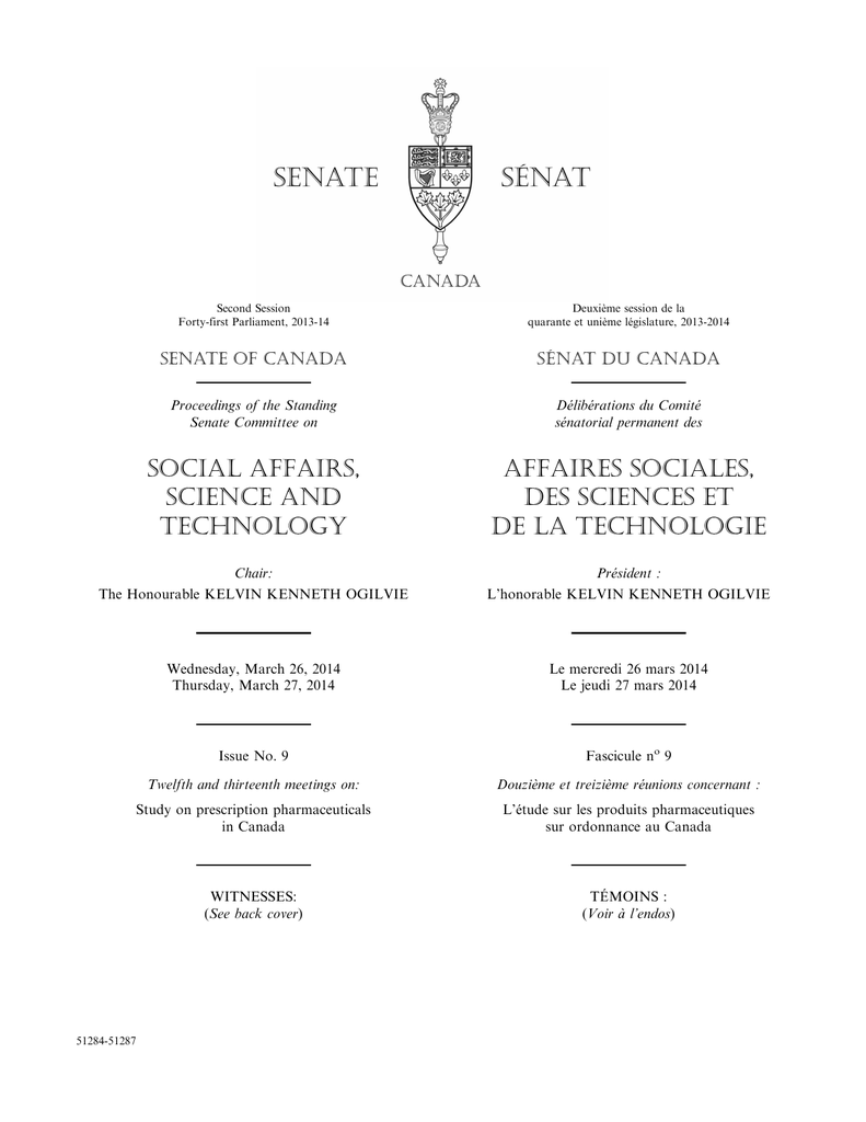 Second Session Forty-first Parliament, 2013-14 Deuxième session de la quarante et unième législature, 2013-2014 SENATE OF CANADA SÉNAT DU CANADA Proceedings of the Standing Senate Committee on Délibérations du Comité sénatorial permanent des Social Affairs, Science and Technology Affaires sociales, des sciences et de la technologie Chair: The Honourable KELVIN KENNETH OGILVIE Président : L’honorable KELVIN KENNETH OGILVIE Wednesday, March 26, 2014 Thursday, March 27, 2014 Le mercredi 26 mars 2014 Le jeudi 27 mars 2014 Issue No. 9 Fascicule no 9 Twelfth and thirteenth meetings on: Douzième et treizième réunions concernant : Study on prescription pharmaceuticals in Canada L’étude sur les produits pharmaceutiques sur ordonnance au Canada WITNESSES: (See back cover) TÉMOINS : (Voir à l’endos) 51284-51287 STANDING SENATE COMMITTEE ON SOCIAL AFFAIRS, SCIENCE AND TECHNOLOGY COMITÉ SÉNATORIAL PERMANENT DES AFFAIRES SOCIALES, DES SCIENCES ET DE LA TECHNOLOGIE The Honourable Kelvin Kenneth Ogilvie, Chair Président : L’honorable Kelvin Kenneth Ogilvie The Honourable Art Eggleton, P.C., Deputy Chair Vice-président : L’honorable Art Eggleton, C.P. and et The Honourable Senators: Les honorables sénateurs : * Carignan, P.C. (or Martin) Chaput Cordy * Cowan (or Fraser) Eaton Enverga Lang Munson Nancy Ruth Segal Seidman Seth * Carignan, C.P. (ou Martin) Chaput Cordy * Cowan (ou Fraser) Eaton Enverga Lang Munson Nancy Ruth Segal Seidman Seth * Ex officio members (Quorum 4) * Membres d’office (Quorum 4) Changes in membership of the committee: Modifications de la composition du comité : Pursuant to rule 12-5, membership of the committee was amended as follows: Conformément à l’article 12-5 du Règlement, la liste des membres du comité est modifiée, ainsi qu’il suit : The Honourable Senator Lang replaced the Honourable Senator Stewart Olsen (March 26, 2014). L’honorable sénateur Lang a remplacé l’honorable sénatrice Stewart Olsen (le 26 mars 2014). The Honourable Senator Stewart Olsen replaced the Honourable Senator Tannas (March 26, 2014). L’honorable sénatrice Stewart Olsen a remplacé l’honorable sénateur Tannas (le 26 mars 2014). The Honourable Senator Munson replaced the Honourable Senator Dyck (March 26, 2014). L’honorable sénateur Munson a remplacé l’honorable sénatrice Dyck (le 26 mars 2014). The Honourable Senator Tannas replaced the Honourable Senator Stewart Olsen (March 25, 2014). L’honorable sénateur Tannas a remplacé l’honorable sénatrice Stewart Olsen (le 25 mars 2014). The Honourable Senator Cordy replaced the Honourable Senator Munson (March 25, 2014). L’honorable sénatrice Cordy a remplacé l’honorable sénateur Munson (le 25 mars 2014). Published by the Senate of Canada Available on the Internet: http://www.parl.gc.ca Publié par le Sénat du Canada Disponible sur internet: http://www.parl.gc.ca 27-3-2014 Affaires sociales, sciences et technologie MINUTES OF PROCEEDINGS PROCÈS-VERBAUX OTTAWA, Wednesday, March 26, 2014 (19) OTTAWA, le mercredi 26 mars 2014 (19) [English] 9:3 [Traduction] The Standing Senate Committee on Social Affairs, Science and Technology met this day, at 4:15 p.m., in room 2, Victoria Building, the chair, the Honourable Kelvin Kenneth Ogilvie, presiding. Le Comité sénatorial permanent des affaires sociales, des sciences et de la technologie se réunit aujourd’hui, à 16 h 15, dans la pièce 2 de l’édifice Victoria, sous la présidence de l’honorable Kelvin Kenneth Ogilvie (président). Members of the committee present: The Honourable Senators Cordy, Eaton, Eggleton, P.C., Enverga, Nancy Ruth, Ogilvie, Seidman, Seth and Tannas (9). Membres du comité présents : Les honorables sénateurs Cordy, Eaton, Eggleton, C.P., Enverga, Nancy Ruth, Ogilvie, Seidman, Seth et Tannas (9). In attendance: Sonya Norris, Analyst, Parliamentary Information and Research Service. Également présente : Sonya Norris, analyste, Service d’information et de recherche parlementaires. Also in attendance: The official reporters of the Senate. Aussi présents : Les sténographes officiels du Sénat. Pursuant to the order of reference adopted by the Senate on Tuesday, November 19, 2013, the committee continued its study on prescription pharmaceuticals in Canada. (For complete text of the order of reference, see proceedings of the committee, Issue No. 3.) Conformément à l’ordre de renvoi adopté par le Sénat le mardi 19 novembre 2013, le comité poursuit son étude sur les produits pharmaceutiques sur ordonnance au Canada. (Le texte intégral de l’ordre de renvoi figure au fascicule no 3 des délibérations du comité.) WITNESSES: TÉMOINS : Canadian Pharmacists Association: Association des pharmaciens du Canada : Janet Cooper, Senior Director, Membership and Professional Affairs; Janet Cooper, directrice principale, Affaires professionnelles et relations avec les membres; Phil Emberley, Director, Pharmacy Innovation. Phil Emberley, directeur, Innovations pharmaceutiques. Federation of Medical Regulatory Authorities of Canada: Fleur-Ange Lefebvre, Executive Director and Chief Executive Officer. Canadian Medical Association: Fédération des ordres des médecins du Canada : Fleur-Ange Lefebvre, directrice générale et chef de la direction. Association médicale canadienne : Owen Adams, Vice-president, Health Policy and Research; Owen Adams, vice-président, Politique de santé et Recherche; Millicent Toombs, Director, Public Health Department. Millicent Toombs, directrice, Département de la santé publique. The chair made a statement. Le président fait une déclaration. Ms. Cooper, Mr. Emberley, Ms. Lefebvre and Mr. Adams each made a statement and, together with Ms. Toombs, answered questions. Mme Cooper, M. Emberley, Mme Lefebvre et M. Adams font chacun une déclaration puis, avec Mme Toombs, répondent aux questions. At 6:02 p.m., the committee adjourned to the call of the chair. À 18 h 2, le comité s’a