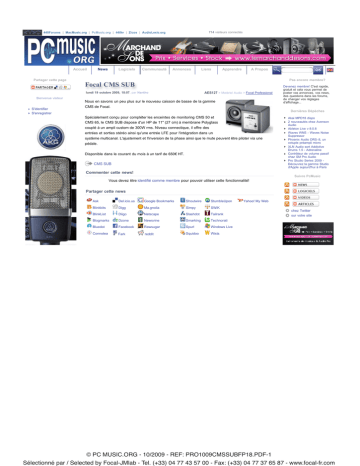 714 visiteurs connectés 440Forums | MacMusic.org | PcMusic.org | 440tv | Zicos | AudioLexic.org Accueil News Logiciels Communauté Annonces Liens Apprendre A Propos Partager cette page Pas encore membre? Focal CMS SUB lundi 19 octobre 2009, 18:07, par Nantho AES127 > Matériel Audio > Focal Professional Bienvenue visiteur Nous en savons un peu plus sur le nouveau caisson de basse de la gamme S'identifier S'enregistrer Devenez membre! C'est rapide, gratuit et cela vous permet de poster vos annonces, vos news, des questions dans les forums, de changer vos réglages d'affichage... CMS de Focal. Dernières Dépèches Spécialement conçu pour compléter les enceintes de monitoring CMS 50 et CMS 65, le CMS SUB dispose d'un HP de 11" (27 cm) à membrane Polyglass couplé à un ampli custom de 300W rms. Niveau connectique, il offre des entrées et sorties stéréo ainsi qu'une entrée LFE pour l'intégration dans un système multicanal. L'ajustement et l'inversion de la phase ainsi que le mute peuvent être piloter via une pédale. Disponible dans le courant du mois à un tarif de 650! HT. CMS SUB Akai MPD18 dispo 2 nouveautés chez Avenson Audio Ableton Live v 8.0.8 Waves WNS - Waves Noise Suppressor Phoenix Audio DRS-8, un octuple préampli micro XLN Audio sort Addictive Drums 1.5 - Adrenaline Contrôleur de volume passif chez SM Pro Audio Pro Studio Series 2009 Découvrez la gamme Studio d'Apple aujourd'hui à Paris Commenter cette news! Suivre PcMusic Vous devez être identifié comme membre pour pouvoir utiliser cette fonctionnalité! Partager cette news Ask Del.icio.us Google Bookmarks Shoutwire StumbleUpon Blinkbits Digg Ma.gnolia Simpy SWiK BlinkList Diigo Netscape Slashdot Tailrank Blogmarks Dzone Newsvine Smarking Technorati Bluedot Facebook Rawsugar Spurl Windows Live Connotea Fark reddit Squidoo Wists Yahoo! My Web chez Twitter sur votre site Les dernières dépèches de la catégorie: Matériel Audio 23 oct 2009 22 oct 2009 22 oct 2009 20 oct 2009 20 oct 2009 19 oct 2009 16 oct 2009 16 oct 2009 14 oct 2009 13 oct 2009 13 oct 2009 12 oct 2009 10 oct 2009 8 oct 2009 6 oct 2009 1 oct 2009 30 sep 2009 28 sep 2009 25 sep 2009 22 sep 2009 17 sep 2009 16 sep 2009 15 sep 2009 14 sep 2009 4 sep 2009 3 sep 2009 28 aoû 2009 18 aoû 2009 18 aoû 2009 12 aoû 2009 3 aoû 2009 31 jui 2009 2 nouveautés chez Avenson Audio Phoenix Audio DRS-8, un octuple préampli micro Contrôleur de volume passif chez SM Pro Audio Grace Design m103 - nouveau Channel Strip Fink Audio CS2-FA, un Channel Strip stéréo Grace Design m501 - préampli micro au format API 500 Le Torpedo en démo sur Paris Toft Audio Designs SA16 - Sommateur à l'anglaise Lexicon présente la PCM92 Neumann TLM-102 EQ Harrison au format API 500 chez Great River Un 8 pistes ultra-portable chez Tascam Compresseur API 527 Nouveau Channel Strip signé Rupert Neve Designs Banc d'essai : Focal Solo6 Be Focal présente un caisson de basse dans sa gamme CMS Micro électrostatique stéréo chez Audio-Technica Blue Sky sort le grand jeu Un caisson de basses chez M-Audio Blue s'attaque à la scène Audio-Technica AT4047MP, micro statique à directivité multiple Nouveau gestionnaire d'écoutes chez JBL Focusrite présente l'OctoPre MkII Audio-Technica passe au ruban BH-1s, nouveau micro signé JZ Microphones Des moniteurs à 99$... JoeCo Blackbox Recorder en vente Une tranche de console au format API 500 Nouveaux moniteurs SX-Series chez ADAM Nouveau boîtier de direct chez Avenson Audio Micro à lampe chez Avant Electronics Enceintes de Monitoring chez Cakewalk Les News du web Eclipse Eclipsed By New Version Blackbox Recorder Wins Another Award Make Music With An Armadillo TL Audio Win Awards Striped Sounds Muscle Car Compression Moog Music / reKon audio release VST Little Phatty Editor Tout voir... Sur votre site Enrichissez le contenu de votre site en publiant les dernières news de PC et Musique. Il suffit d'insérer une simple ligne de code dans les pages de votre site, pour que vos visiteurs bénéficient en temps réel des toutes dernières dépèches parues sur PcMusic . En ce moment sur 440tv Pigtronix Philosopher's Tone © PC MUSIC.ORG - 10/2009 - REF: PRO1009CMSSUBFP18.PDF-1 Sélectionné par / Selected by Focal-JMlab - Tel. (+33) 04 77 43 57 00 - Fax: (+33) 04 77 37 65 87 - www.focal-fr.com