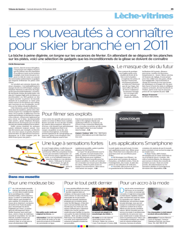 25 Tribune de Genève | Samedi-dimanche 15-16 janvier 2011 Lèche-vitrines Les nouveautés à connaître pour skier branché en 2011 La bûche à peine digérée, on lorgne sur les vacances de février. En attendant de se dégourdir les planches sur les pistes, voici une sélection de gadgets que les inconditionnels de la glisse se doivent de connaître Cécile Denayrouse Le masque de ski du futur I nnover, dans le secteur de la glisse, c’est presque une religion. Et parce que les Suisses ont une réputation d’excellence à tenir sur les sentiers enneigés, tout Genevois qui se respecte se doit de rester au courant des nouveautés vestimentaires ou gadgets qui risquent d’éléctriser les pistes cette saison. «Le produit qui cartonne depuis plusieurs semaines, c’est indéniablement le masque de ski avec GPS intégré, explique Stéphane Montani, le directeur du magasin de sport branché Hofstetter, à Genève. Ils sont partis comme des petits pains.» En plus de s’équiper high-tech, les skieurs et snowboarders cru 2011 gardent en tête l’aspect sécurité. La preuve: les inconditionnels de la poudreuse se ruent cette année encore sur les fameux sacs airbag, qui s’ouvrent en cas d’avalanche, ou encore sur les balises de géolocalisation. Côté vêtements, pas de réelles innovations dans les matières, même si les vêtements en gore-tex s’améliorent régulièrement. En revanche, la différence avec les années précédentes se fait dans les coupes et les couleurs. «Il faut noter également un gros retour de la laine, incontournable cette année», ajoute Stéphane Montani. Effectivement, les bonnets que l’on dirait tricotés par mamie pullulent sur les pistes. Enfin, niveau matériel, les marques suisses séduisent toujours autant. «Les skis Movement, par exemple, ou bien les Zaï, avec leur noyau en granit, fonctionnent très bien. Il s’agit surtout d’un investissement car il faut compter près de 6000 francs pour une paire.» Non content de protéger nos fragiles petits yeux citadins du froid, de la bise et de la lumière aveuglante des pistes, le masque Transcend, récemment présenté au Salon de l’électronique de Las Vegas, fait aussi office de GPS et de micro-ordinateur. Sa mission? Enregistrer en temps réel vitesse, latitude, longitude, altitude, inclinaison de la pente, distance parcourue, nombre de descentes, température et… heure. Mieux: perclus de boutons de réglage, il reste pensé pour être utilisé avec des gants, détail non négligeable. Puis la bestiole se charge de ressortir le tout sous forme de statistiques et d’images 3D. De quoi faire baver d’envie les amis et collègues coincés au boulot, devant Facebook ou Twitter, après avoir reçu le parcours précis de vos exploits du jour. C.D. Masque Transcend de Recon Instruments. Pour filmer ses exploits C’est connu: les sportifs adoooorent se mettre en scène et filmer leurs exploits. Bonne nouvelle: le tout dernier modèle de caméra ultracompacte, dépourvu d’écran, a été dessiné tout spécialement pour eux. Simplement fixée à un casque, un guidon ou un ski, non contente d’enregistrer, la bestiole permet également de cartographier un parcours, grâce à son récepteur GPS. Cette caméra dispose aussi d’une fonction permettant de contrôler le cadre et les réglages depuis une application iPhone ou Android, au travers d’une connexion Bluetooth. Bon, si en plus on précise qu’elle résiste à une légère pluie ou à une roulade dans la neige… C.D. Camera Contour GPS. Prix: 350 francs environ. Informations sur le site http://contour.com Une luge à sensations fortes Les applications Smartphone Et voici l’engin ultime, à mille lieues de la simple petite luge de votre enfance, caréné pour offrir des sensations fortes à ceux qui oseraient l’enfourcher. Ce tout nouveau sport s’appelle le snow cycle, ce n’est définitivement pas pour les enfants et c’est ultratendance. Voilà pour le résumé. En pratique, il s’agit de dévaler les pistes le plus rapidement possible, quitte à parfois dépasser les 100 km/h… Le topo? Un ski positionné sous la selle, un autre à l’avant monté d’un guidon, histoire d’orienter la bête, et deux skis latéraux pour stabiliser l’ensemble. Bonne nouvelle pour les fessiers sensibles: la selle est rembourrée et montée sur ressort pour absorber les chocs. Même le patin avant est équipé d’un amortisseur. Mais mieux vaut mettre un casque… C.D. La pub Apple nous prévenait: il existe une application pour tout. Même pour skier. Petite liste non exhaustive de ce qu’il faut avoir sur son iPhone pour briller: U Ski Montagne (sur iPhone). Au menu pour une centaine de stations françaises, un bulletin météo, l’état de l’enneigement, des routes, le plan des pistes et une sélection de webcams. U View2Ski. Elle permet de parcourir gratuitement les webcams de centaines de stations de par le monde pour constater si oui ou non la neige est au rendez-vous. U Slope Track, 100% Suisse, développée par la Caisse nationale en cas d’accident (Suva). Gratuite, elle relève la dénivellation, les distances parcourues et donne des conseils de premiers secours. Dans un avenir proche, des informations sur les domaines skiables et l’enneigement devraient être disponibles. C.D. Dans ma musette Pour une modeuse bio Pour le tout petit dernier Pour un accro à la mode E I D os, c’est une toute nouvelle marque qui tente de se faire un nom dans le petit monde de la cosmétique bio. L’objet incontournable, c’est le baume à lèvres. Le pitch? Ce petit bijou est 100% naturel, sans paraben et sans vaseline. En revanche, on y trouve de la vitamine E, du beurre de karité et de l’huile de jojoba pour chouchouter les lèvres fragilisées par l’hiver. Le packaging est ultrarégressif, façon Kinder Surprise: tout rond, tout doux, coloré, à base de matériaux recyclés et recyclables. Sur son site Internet, la pet