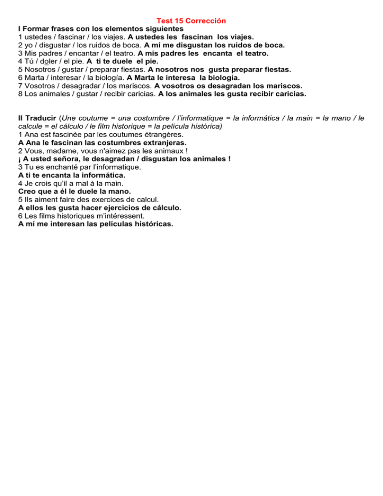 Test 15 Corrección I Formar frases con los elementos siguientes 1 ustedes / fascinar / los viajes. A ustedes les fascinan los viajes. 2 yo / disgustar / los ruidos de boca. A mí me disgustan los ruidos de boca. 3 Mis padres / encantar / el teatro. A mis padres les encanta el teatro. 4 Tú / doler / el pie. A ti te duele el pie. 5 Nosotros / gustar / preparar fiestas. A nosotros nos gusta preparar fiestas. 6 Marta / interesar / la biología. A Marta le interesa la biología. 7 Vosotros / desagradar / los mariscos. A vosotros os desagradan los mariscos. 8 Los animales / gustar / recibir caricias. A los animales les gusta recibir caricias. II Traducir (Une coutume = una costumbre / l’informatique = la informática / la main = la mano / le calcule = el cálculo / le film historique = la película histórica) 1 Ana est fascinée par les coutumes étrangères. A Ana le fascinan las costumbres extranjeras. 2 Vous, madame, vous n'aimez pas les animaux ! ¡ A usted señora, le desagradan / disgustan los animales ! 3 Tu es enchanté par l’informatique. A ti te encanta la informática. 4 Je crois qu’il a mal à la main. Creo que a él le duele la mano. 5 Ils aiment faire des exercices de calcul. A ellos les gusta hacer ejercicios de cálculo. 6 Les films historiques m’intéressent. A mí me interesan las películas históricas.