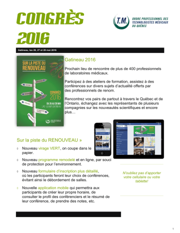 CONGRÈS 2016 Gatineau, les 26, 27 et 28 mai 2016 Gatineau 2016 Prochain lieu de rencontre de plus de 400 professionnels de laboratoires médicaux. Participez à des ateliers de formation, assistez à des conférences sur divers sujets d’actualité offerts par des professionnels de renom. Rencontrez vos pairs de partout à travers le Québec et de l’Ontario, échangez avec les représentants de plusieurs compagnies sur les nouveautés scientifiques et encore plus… Sur la piste du RENOUVEAU » Nouveau virage VERT, on coupe dans le papier. Nouveau programme remodelé et en ligne, par souci de protection pour l’environnement. Nouveau formulaire d’inscription plus détaillé, où les participants feront leur choix de conférences, évitant ainsi le débordement de salles. Nouvelle application mobile qui permettra aux participants de créer leur propre horaire, de consulter le profil des conférenciers et le résumé de leur conférence, de prendre des notes, etc. N’oubliez pas d’apporter votre cellulaire ou votre tablette! 1 SUR LA PISTE DU RENOUVEAU NATHALIE RODRIGUE, T.M., RT, présidente de l’OPTMQ Mot de la présidente Notre prochain lieu de rencontre est la belle région de l’Outaouais. Le thème « Sur la piste du renouveau » évoque les changements présents et futurs au sein de nos laboratoires médicaux. Durant ces trois jours de congrès, nous recevrons entre autres, le Dr Yves Jalbert, qui viendra nous faire part des avancements du projet OPTILAB. Plusieurs conférences et ateliers vous seront présentés par des médecins et des professionnels qui sauront vous tenir à jour sur les nouveautés médicales. Nous avons également lancé une invitation au ministre de la Santé et des Services sociaux, Dr Gaétan Barrette, à venir vous rencontrer à Gatineau. Nous attendons sa réponse et nous espérons qu’elle sera positive. Au plaisir de vous rencontrer et de partager ces beaux moments avec vous ! Nathalie Rodrigue, T.M., RT Présidente de l’OPTMQ 2 Gatineau, les 26, 27 et 28 mai 2016 Le comité congrès 2016 Venez rencontrer les organisatrices de ce congrès prometteur et haut en couleurs ! Annabelle Sévigny, T.M., Sophie Allaire, T.M., et Maryse Lalonde, T.M. Conférence d’ouverture « Choisissez votre destinée! » C'est ce que ce sympathique personnage va nous apprendre tout au long de sa présentation. À l'aide de son histoire, Jimmy a une façon bien à lui de nous parler des choix que l'on peut faire pour arriver à performer et à être épanoui dans la vie de tous les jours. Sa force de caractère, sa détermination par rapport à ses choix, ainsi que l'adoption d'un mode de vie sain et actif, ont fait de lui une personne déterminée à atteindre ses buts tout en repoussant ses limites au maximum. Jimmy Sévigny Tout au long de sa jeunesse, il a suivi un parcours qui ne semblait le mener nulle part, voire même à l'échec suprême: la mort. C'est avec humour et émotion qu'il nous raconte comment il a pu passer d'une personne sans but dans la vie, à une personne où l'activité physique et les saines habitudes de vie font désormais partie intégrante de sa vie. Laissez-le vous raconter une histoire incroyable : la sienne. 3 Place aux ateliers du jeudi - 26 mai 2016 Faites votre choix parmi cinq (5) ateliers, d’une durée de 2 heures chacun, qui vous seront offerts sur deux plages horaires différentes, soit 13h et 15h30. Pré-inscription obligatoire, premier arrivé, premier servi! A telier « Le prélèvement sanguin» L’atelier débutera par un résumé des bonnes pratiques liées au prélèvement sanguin. Des cas pratiques seront présentés et des discussions auront lieu sur la meilleure façon de les résoudre. Formateurs : Anne-Marie Martel, T.M., Chargée de dossiers scientifiques à l’OPTMQ et Stéphanie Lemire, T.M. Chef de service de biologie médicale CIUSSS Mauricie - Centre-du-Québec Maximum de 40 participants par séance. A telier « Les groupes sanguins… pas seulement pour les nuls » Cet atelier vous permettra de réviser la nomenclature et les caractéristiques des principaux groupes sanguins dont leurs significations cliniques ainsi que les phénotypes nuls. La connaissance de ces caractérisques pourra ensuite servir à la résolution de quelques cas d'études sérologiques. Formateurs : Nadia Baillargeon, T.M. Spécialiste de la formation en immunologie érythrocytaire Héma-Québec et Julie Paquet, tech. labo. médical Formateur spécialisé en immunologie érythrocytaire Héma-Québec Maximum de 30 participants par séance. Commandité par 4 Suite - Ateliers du jeudi, 26 mai 2016 Pré-inscription obligatoire, premier arrivé, premier servi! A telier « L’analyse d’urine 2.0 » À l’ère de l’automatisation des laboratoires, nous revisiterons l’analyse de l’urine en donnant un peu de théorie mais surtout en partageant notre expérience. Formateur : Robert Robitaille, biochimiste clinique Hôpital Maisonneuve-Rosemont Maximum de 90 participants par séance Commandité par A telier « Les technologistes médicaux et les médias sociaux » La formation a pour but d’identifier les risques d’ordre déontologique qui découlent de l’utilisation des médias sociaux et de fournir des lignes directrices pour une utilisation conforme. Formateurs : Me Anthony Battah, avocat et Steve Sirois, T.M., RT Syndic de l’OPTMQ Maximum de 90 participants par séance A telier « Séance d’évaluation des colorations histochimiques et histologiques* » (à confirmer) Cet atelier permettra aux participants d’acquérir et d’appliquer des critères d’évaluation pour la vérification du résultat de colorations histochimiques et immunohistochimiques couramment effectuées dans un laboratoire d’anatomopathologie. Formateurs: Docteur Christian Couture, MD, M.Sc, FRCPC, anatomopathologiste IUCPQ - Hôpital Laval et Josée Senécal, T.M., LSPQ Maximum de 20 participants par séance *S’adresse à une clientèle 