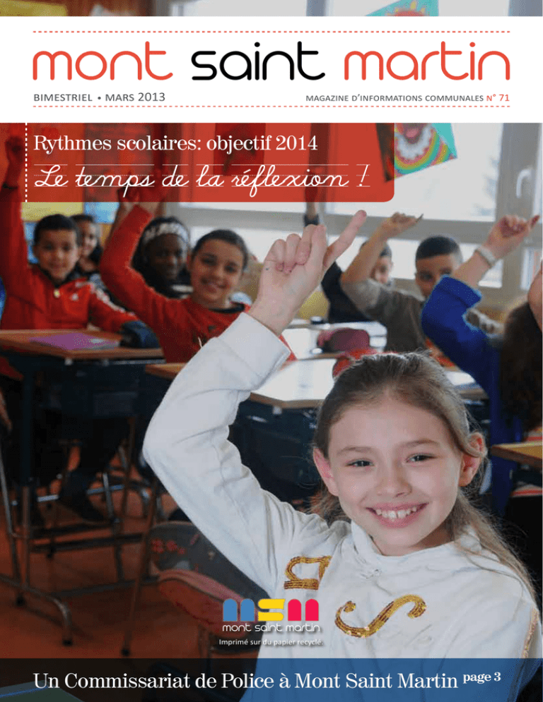 mont saint martin bimestriel • mars 2013 magazine d’informations communales n° 71 Rythmes scolaires: objectif 2014 mont saint martin Imprimé sur du papier recyclé. Un Commissariat de Police à Mont Saint Martin page 3 Agenda du Maire Mardi 08 janvier 2013 Signature avec ADIM Mercredi 09 janvier 2013 Goûter des personnes âgées C.A. CCAL Mercredi 16 janvier 2013 Vœux de la municipalité à la salle des sports Jeudi 17 janvier 2013 Rencontre au sujet de l’Hôpital en Sous-Préfecture Samedi 16 février 2013 A.G. Comité des Fêtes Joies et Distractions Lundi 18 février 2013 Bureau Municipal Mercredi 23 janvier 2013 Remise denrées par le service jeunesse à sociale Réception Association Symphonie Octobre Rose Lundi 28 janvier 2013 Vœux à la CCI Mardi 29 janvier 2013 Signature convention RAM à Beuveille Vœux du Commissaire de Police Mercredi 30 janvier 2013 Commission d’Appel d’Offres A.G. de l’ARPA Jeudi 31 janvier 2013 Rencontre avec l’OGBL Réunion sur les rythmes scolaires Interview XMOVE Mercredi 20 février 2013 Point Presse pour le gala de boxe Vendredi 22 février 2013 Interview XMOVE Lundi 04 mars 2013 Mise à l’honneur des enfants DA COSTA Mardi 05 mars 2013 Bureau de la CCAL Mercredi 06 mars 2013 Conférence territoriale C.G. 54 Longwy Jeudi 07 mars 2013 Point Presse Commissariat de Police Projet égalité des chances – signature charte Vendredi 08 mars 2013 Pot pour la journée de la femme Samedi 09 mars 2013 Récital Brassens au Prieuré Mardi 12 mars 2013 Réception des nouveaux arrivants au Prieuré Vendredi 1er février 2013 Débat dédicace de Thierry HESSE Mercredi 13 mars 2013 Réunion Ligne H.T. salle du C.M. à laBibliothèque Lundi 04 février 2013 Bureau Municipal Mardi 05 février 2013 C.A. Collège Anatole France Jeudi 07 février 2013 C.A. Collège de Lexy Vendredi 08 février 2013 Signature «CONTRAT ENFANCE JEUNESSE» avec la CAF Samedi 09 février 2013 A.G. de la PIEDMONTAISE Rubrique Le mot du Maire... Nouveau Commissariat Mardi 19 février 2013 C.A. CCAS Jeudi 21 février 2013 Vendredi 18 janvier 2013 Rencontre avec la Ligue des Conférence Culture et Arc Papou Droits de L’Homme à J.B. Clément Conseil à la CCAL Mardi 22 janvier 2013 Signature convention RAM à Longuyon Edito Jeudi 14 mars 2013 Réunion CTP Rencontre avec les parents sur la réforme rythmes scolaires salle Callot Vendredi 15 mars 2013 Réception travaux salle de boxe ERCKMANN- CHATRIAN Samedi 16 mars 2013 Réunion salle du C.M. sur l’avenir de l’hôpital Lundi 11 février 2013 A.G. des Terres de Mercy Jeudi 14 février 2013 Rencontre avec l’ARS à la CCAL sur l’hôpital mont saint martin • n°71 • mars 2013 dépôt légal 3e trimestre imprimé à 3500 exemplaires directeur de publication serge de carli administration, rédaction, photographies mairie de mont saint martin conception et impression lorgé imprimeur Au printemps, de quoi rêvais-tu ? Un nouveau Commissariat pour le bassin de Longwy ! Alors que l’hiver, long et rigoureux, jette ses dernières forces dans la bataille des saisons au détriment d’un printemps doux et lumineux tant attendu, je voudrais une nouvelle fois, comme ce fut le cas lors de la cérémonie des voeux 2013, mettre en exergue la qualité du travail réactif et efficace de nos agents territoriaux qui assurent, de jour comme de nuit, déneigement et salage de nos différentes voiries. J’en profite pour associer à cet hommage l’ensemble des services publics communaux, services techniques, jeunesse, sports, loisirs, CCAS, administration, état civil, ATSEM, cantines, garderies, médiathèque, personnel d’entretien.....qui, partout et tout au long de l’année, permettent au «Vivre Ensemble» de s’épanouïr dans notre belle ville de Mont Saint Martin. Alors que les affaires nationales successives, Lagarde, Cahuzac, Sarkozy, jettent le trouble dans l’opinion publique jusqu’à favoriser l’amalgame et aboutir au triste et populiste «Tous pourris», cri de guerre du Front National, avec les inquiétants résultats de la législative partielle de l’Oise, il est impérieux que chacune et chacun d’entre nous conserve, à tout instant, lucidité, esprit critique, discernement pour être en capacité de se forger un jugement objectif. En cela, j’ai confiance. Le magazine municipal que vous tenez entre vos mains constitue, à n’en pas douter, au fil des pages et des articles parcourus, une preuve indiscutable de la force des résultats, fruits de la ténacité et de l’engagement politique des élus de la République, toujours aidés par des fonctionnaires territoriaux attachés à leur mission de service public, au service du public... En cette période de passage saisonnier qui tarde, je souhaite le meilleur pour Mont Saint Martin. Depuis quatre ans, la municipalité porte le projet d’un nouveau commissariat de police pour l’ensemble du bassin de Longwy. La structure existante ne répond plus aux normes de salubrité, de conditions d’accueil acceptables pour les citoyens comme des conditions de travail des fonctionnaires de police. C’est, le 7 mars à Longwy, que l’annonce a été faite en présence de Christian Eckert, Député, Jean-Claude Guillaume, Président de la C.C.A.L. et Serge De Carli, Maire de Mont Saint Martin. Lors de cette réunion, il fut annoncé que le Ministère de l’Intérieur a donné son accord pour le financement de ce nouveau commissariat. Il sera situé, sur le territoire communal, et plus exactement sur la plate-forme des anciennes friches Auchan. Concrètement, le futur commissariat de police sera ouvert au public en 2015. Cette année, ce sont les études diverses qui vont être menées sur place pour vérifier sa faisabilité. Présentation le 30 mai 2012 du futur commissariat de Police Les travaux devraient débuter en 2014. La superficie totale de l’ensemble sera de 2 600m2. Sur le financement des études et du concours d’architecte, l’Etat s’engage 