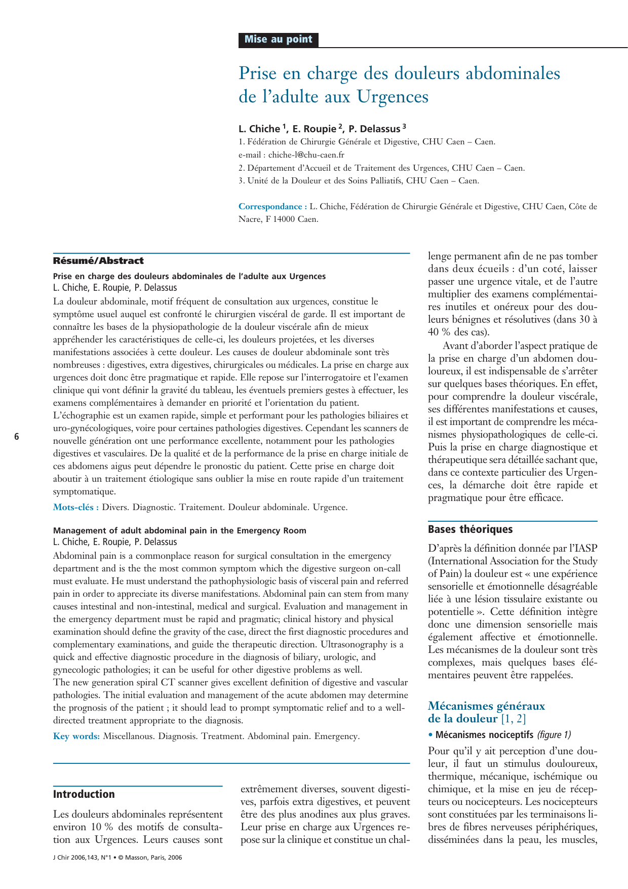 Mise au point Prise en charge des douleurs abdominales de l’adulte aux Urgences L. Chiche 1, E. Roupie 2, P. Delassus 3 1. Fédération de Chirurgie Générale et Digestive, CHU Caen – Caen. e-mail : [email protected] 2. Département d’Accueil et de Traitement des Urgences, CHU Caen – Caen. 3. Unité de la Douleur et des Soins Palliatifs, CHU Caen – Caen. Correspondance : L. Chiche, Fédération de Chirurgie Générale et Digestive, CHU Caen, Côte de Nacre, F 14000 Caen. Résumé / Abstract Prise en charge des douleurs abdominales de l’adulte aux Urgences L. Chiche, E. Roupie, P. Delassus 6 La douleur abdominale, motif fréquent de consultation aux urgences, constitue le symptôme usuel auquel est confronté le chirurgien viscéral de garde. Il est important de connaître les bases de la physiopathologie de la douleur viscérale afin de mieux appréhender les caractéristiques de celle-ci, les douleurs projetées, et les diverses manifestations associées à cette douleur. Les causes de douleur abdominale sont très nombreuses : digestives, extra digestives, chirurgicales ou médicales. La prise en charge aux urgences doit donc être pragmatique et rapide. Elle repose sur l’interrogatoire et l’examen clinique qui vont définir la gravité du tableau, les éventuels premiers gestes à effectuer, les examens complémentaires à demander en priorité et l’orientation du patient. L’échographie est un examen rapide, simple et performant pour les pathologies biliaires et uro-gynécologiques, voire pour certaines pathologies digestives. Cependant les scanners de nouvelle génération ont une performance excellente, notamment pour les pathologies digestives et vasculaires. De la qualité et de la performance de la prise en charge initiale de ces abdomens aigus peut dépendre le pronostic du patient. Cette prise en charge doit aboutir à un traitement étiologique sans oublier la mise en route rapide d’un traitement symptomatique. Mots-clés : Divers. Diagnostic. Traitement. Douleur abdominale. Urgence. Management of adult abdominal pain in the Emergency Room L. Chiche, E. Roupie, P. Delassus Abdominal pain is a commonplace reason for surgical consultation in the emergency department and is the the most common symptom which the digestive surgeon on-call must evaluate. He must understand the pathophysiologic basis of visceral pain and referred pain in order to appreciate its diverse manifestations. Abdominal pain can stem from many causes intestinal and non-intestinal, medical and surgical. Evaluation and management in the emergency department must be rapid and pragmatic; clinical history and physical examination should define the gravity of the case, direct the first diagnostic procedures and complementary examinations, and guide the therapeutic direction. Ultrasonography is a quick and effective diagnostic procedure in the diagnosis of biliary, urologic, and gynecologic pathologies; it can be useful for other digestive problems as well. The new generation spiral CT scanner gives excellent definition of digestive and vascular pathologies. The initial evaluation and management of the acute abdomen may determine the prognosis of the patient ; it should lead to prompt symptomatic relief and to a welldirected treatment appropriate to the diagnosis. Key words: Miscellanous. Diagnosis. Treatment. Abdominal pain. Emergency. Introduction Les douleurs abdominales représentent environ 10 % des motifs de consultation aux Urgences. Leurs causes sont J Chir 2006,143, N°1 • © Masson, Paris, 2006 extrêmement diverses, souvent digestives, parfois extra digestives, et peuvent être des plus anodines aux plus graves. Leur prise en charge aux Urgences repose sur la clinique et constitue un chal- lenge permanent afin de ne pas tomber dans deux écueils : d’un coté, laisser passer une urgence vitale, et de l’autre multiplier des examens complémentaires inutiles et onéreux pour des douleurs bénignes et résolutives (dans 30 à 40 % des cas). Avant d’aborder l’aspect pratique de la prise en charge d’un abdomen douloureux, il est indispensable de s’arrêter sur quelques bases théoriques. En effet, pour comprendre la douleur viscérale, ses différentes manifestations et causes, il est important de comprendre les mécanismes physiopathologiques de celle-ci. Puis la prise en charge diagnostique et thérapeutique sera détaillée sachant que, dans ce contexte particulier des Urgences, la démarche doit être rapide et pragmatique pour être efficace. Bases théoriques D’après la définition donnée par l’IASP (International Association for the Study of Pain) la douleur est « une expérience sensorielle et émotionnelle désagréable liée à une lésion tissulaire existante ou potentielle ». Cette définition intègre donc une dimension sensorielle mais également affective et émotionnelle. Les mécanismes de la douleur sont très complexes, mais quelques bases élémentaires peuvent être rappelées. Mécanismes généraux de la douleur [1, 2] • Mécanismes nociceptifs (figure 1) Pour qu’il y ait perception d’une douleur, il faut un stimulus douloureux, thermique, mécanique, ischémique ou chimique, et la mise en jeu de récepteurs ou nocicepteurs. Les nocicepteurs sont constituées par les terminaisons libres de fibres nerveuses périphériques, disséminées dans la peau, les muscles, J Chir 2006,143, N°1 • © Masson, Paris, 2006 Périphérie Mise au point Corne postérieur moelle Stimulus thermique chimique , mécanique ischémique Système nerveux central Thalamus VPL (sensoriel discriminant ) Aδ (m, r) Recepteurs (Nocicepteurs) C (nm, l) Neurones spécifiques Neurones convergents Peau Cartilage Os Péritoine Thalamus médian vers frontal (affectif) Hypothalamus (végétatif-stress) Complexe amygdalien (compr éhension cognitive) Douleur projetée irradiation Figure 1 : Physiopathologie de la douleur abdominale (Mécanisme nociceptif). Aδ (m, r) : fibr