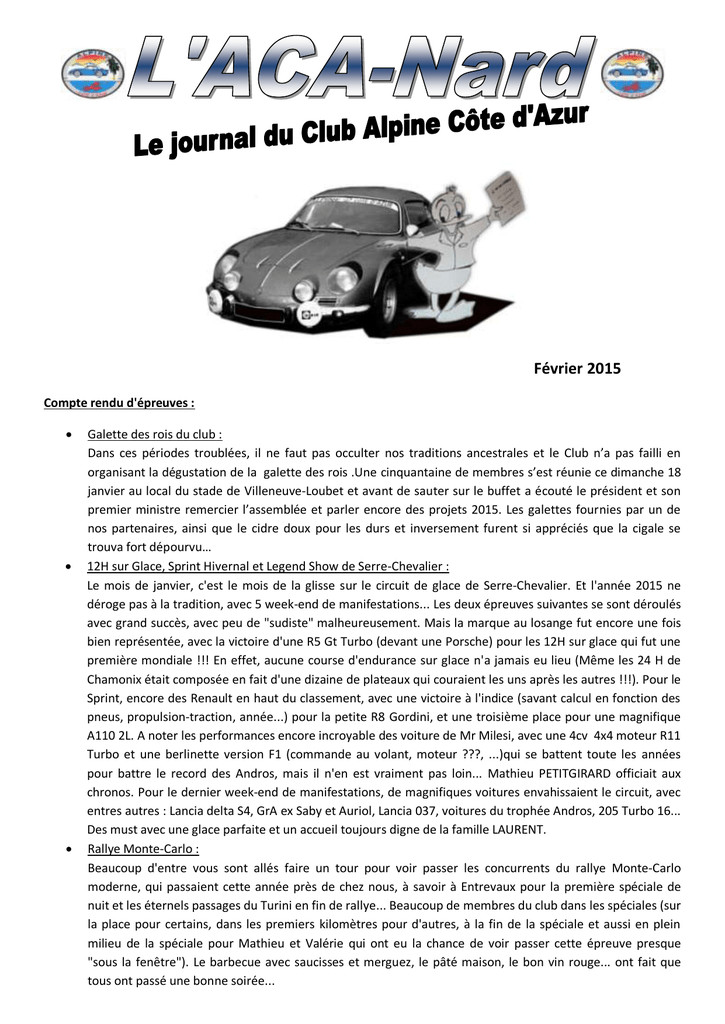 Février 2015 Compte rendu d'épreuves : Galette des rois du club : Dans ces périodes troublées, il ne faut pas occulter nos traditions ancestrales et le Club n’a pas failli en organisant la dégustation de la galette des rois .Une cinquantaine de membres s’est réunie ce dimanche 18 janvier au local du stade de Villeneuve-Loubet et avant de sauter sur le buffet a écouté le président et son premier ministre remercier l’assemblée et parler encore des projets 2015. Les galettes fournies par un de nos partenaires, ainsi que le cidre doux pour les durs et inversement furent si appréciés que la cigale se trouva fort dépourvu… 12H sur Glace, Sprint Hivernal et Legend Show de Serre-Chevalier : Le mois de janvier, c'est le mois de la glisse sur le circuit de glace de Serre-Chevalier. Et l'année 2015 ne déroge pas à la tradition, avec 5 week-end de manifestations... Les deux épreuves suivantes se sont déroulés avec grand succès, avec peu de "sudiste" malheureusement. Mais la marque au losange fut encore une fois bien représentée, avec la victoire d'une R5 Gt Turbo (devant une Porsche) pour les 12H sur glace qui fut une première mondiale !!! En effet, aucune course d'endurance sur glace n'a jamais eu lieu (Même les 24 H de Chamonix était composée en fait d'une dizaine de plateaux qui couraient les uns après les autres !!!). Pour le Sprint, encore des Renault en haut du classement, avec une victoire à l'indice (savant calcul en fonction des pneus, propulsion-traction, année...) pour la petite R8 Gordini, et une troisième place pour une magnifique A110 2L. A noter les performances encore incroyable des voiture de Mr Milesi, avec une 4cv 4x4 moteur R11 Turbo et une berlinette version F1 (commande au volant, moteur ???, ...)qui se battent toute les années pour battre le record des Andros, mais il n'en est vraiment pas loin... Mathieu PETITGIRARD officiait aux chronos. Pour le dernier week-end de manifestations, de magnifiques voitures envahissaient le circuit, avec entres autres : Lancia delta S4, GrA ex Saby et Auriol, Lancia 037, voitures du trophée Andros, 205 Turbo 16... Des must avec une glace parfaite et un accueil toujours digne de la famille LAURENT. Rallye Monte-Carlo : Beaucoup d'entre vous sont allés faire un tour pour voir passer les concurrents du rallye Monte-Carlo moderne, qui passaient cette année près de chez nous, à savoir à Entrevaux pour la première spéciale de nuit et les éternels passages du Turini en fin de rallye... Beaucoup de membres du club dans les spéciales (sur la place pour certains, dans les premiers kilomètres pour d'autres, à la fin de la spéciale et aussi en plein milieu de la spéciale pour Mathieu et Valérie qui ont eu la chance de voir passer cette épreuve presque "sous la fenêtre"). Le barbecue avec saucisses et merguez, le pâté maison, le bon vin rouge... ont fait que tous ont passé une bonne soirée... Buffet du Rallye Monte-Carlo Historique : Cette année, le Club Alpine Côte d'Azur décidait de renouer avec le passé, à savoir préparer un buffet sur le parcours de concentration du rallye Monte-Carlo Historique et offrir une pause repas aux amis présents et aux concurrents d’Alpines et Renault sportives. L'équipe s’ attend à recevoir pas moins de 70 voitures ... Arrivés vers 9h à l'embranchement des gorges du Cians, entre Puget-Théniers et Touët sur Var, pour installer table, banderole et préparer les sandwiches, Mathieu PETITGIRARD, accompagné des locaux Jean-Pierre et Josyane HENRICY accueillent les premiers membres venus de très loin pour certains (Corse, Mulhouse...). C'est au tour de Monique ARIONE et de Valérie ABBA de dresser la table digne d'un buffet de mariage. L'équipe de Patrick DUBOURG arrive (au ralenti) en Clio V6, A610... afin de les exposer sur le bord de la route. Au moment où les premiers concurrents du rallye arrivent, c'est environ 30 membres qui ont fait le déplacement afin de prêter main forte et accueillir les pilotes et copilotes. Tout le monde a mis la main à la pate (sans jeu de mots !!!) et les concurrents ont put se régaler avec les pissaladières de Monique (à tomber), le pâté de Mathieu, la charcuterie offerte par une échoppe renommée du Vieux-Nice, les clémentines de St Laurent du Var de Jean-Claude et au dessert les tartes de Josyane, qualifiées de "prototype" par notre Jeannot national, et il n'a pas menti ! Le Club ayant rajouté les autres essentiels : fromage, boissons (non alcoolisés bien sur), café, thé, et les petits bonbons que tous prenaient pour le "aucas-ou" !!! Malgré un emplacement "à revoir" pour l’année prochaine, ce ne sont pas moins d'une centaine de sandwiches qui ont été distribués et appréciés sur place ou dans les voitures par manque de temps. Nous espérons tous de grandes retombées de ce lunch dans les journaux spécialisés. Rallye Neige et Glace : Concernant le Neige et Glace ou Jack London à Jurassic Parc, nous avons glané quelques aventures aussi croustillantes que les pains au chocolat de Joe Dassin. Le Team était composé de Patrice Sidrac / Alain Camas et l’inusable Fiat 124 Abarth, de Denis Jue / Sylvain Lombard et sa Lancia Delta 16Vet l’inséparable équipage Bernard Figuiéres / Nathalie Euvray (tous juste rentrés de tropiques) sur Lancia Delta Intégrale. Sur la route du départ une roue crevée et qui ne semble pas vouloir quitter sa remorque. Passé Lyon, la neige qui s’invite déjà, gentil petit hors d’œuvre, car de mémoire de Malmoissonais, on avait jamais une pareille couche blanche. Au final bon résultat pour Bernard et Nathalie qui terminent 22 ième et pas dans le fossé (4 roues motrices, çà aide), comme il aime le souligner, Denis Jue parfait son apprentissage, avec Lombard ils sont 57ième et Patrice Sidrac violemment attaqué par une bronchite persistante, jette l’éponge le dernier jour, mais reste classé 96ième .Grégory Galiffi, l’ami de la chaine D 8 associ