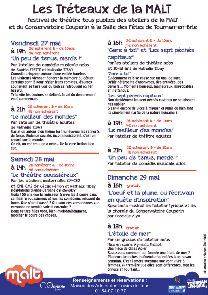 Les Tréteaux de la MALT Festival de théâtre tous publics des ateliers de la MALT et du Conservatoire Couperin à la Salle des Fêtes de Tournan-en-Brie Vendredi 27 mai 2€ adhérent & - de 10ans 4€ non adhérent "Un peu de tenue, merde !" Par l'atelier de comédie musicale ados de Sophie FRETTE et Nathalie TIBAY Comédie grinçante autour d'une veillée funèbre. Les visiteurs viennent honorer la mémoire du défunt, certains sont là pour régler leurs comptes, d'autres souhaitent se faire voir ou bien se retrouvent ici par hasard. Très vite les langues se délient, le bal du dénigrement peut commencer. à 21h 2€ adhérent & - de 10ans 4€ non adhérent "Le meilleur des mondes" Par l'atelier de théâtre adultes de Nathalie TIBAY Variation autour d'un thème fort qui évoque les rapports de force. Violence sociale, incommunicabilité, c'est un regard sur le monde. On rit, on est ému, on a peur... De la pure fiction bien sur. "Gare à toi" et "Les sept péchés capitaux" Par les ateliers de théâtre ados et 10-13 ans de Nathalie Tibay "Gare à toi" Evidemment cela se passe sur un quai de gare. Défilé hétéroclite d'anonymes, des arrivées, des départs... Moments heureux, malheureux, improbables et inattendus. "Les sept péchés capitaux" Non décidément les sept péchés capitaux ne se laissent pas oublier. S'agit-il encore de vices à traquer et punir ou bien font ils simplement partie de la nature humaine ? à 19h 2€ adhérent & - de 10ans 4€ non adhérent "Le meilleur des mondes" Par l'atelier de théâtre adultes à 21h 2€ adhérent & - de 10ans 4€ non adhérent "Un peu de tenue, merde !" Samedi 28 mai à 14h 2€ adhérent & - de 10ans 4€ non adhérent 2€ adhérent & - de 10ans 4€ non adhérent "Le théâtre poussiéreux" Par les ateliers maternelle, CP-CE2 et CM1-CM2 de Cécile Hémon et Nathalie Tibay Adaptations d'Anne-Caroline d'ARNAUDY Voila 100 ans que le régisseur frappe les 3 coups dans ce théâtre poussiéreux et que les comédiens refusent de jouer. Que s'est-il passé ? Qui sont ces personnages que personne ne semble voir ni entendre ? Deux petites filles vont, bien involontairemment, modifier le cours des choses. Par l'atelier de comédie musicale ados Dimanche 29 mai à 16h gratuit "L'oeuf et la plume, ou l'écrivain en quête d'inspiration" Spectacle musical de l'atelier lyrique et de la chorale du Conservatoire Couperin par Gabrielle Alya à 18h gratuit "L'étoile de mer" Par un groupe de l'atelier ados Mise en scène Aymeric Maillot Une pièce de Gilles Abier Savez-vous comment est formée une étoile de mer ? Plusieurs branches indépendantes reliées à un noyau commun. C'est l'amère aventure que vont vivre 3 femmes. A première vue elles sont différentes, tout les oppose et pourtant... Renseignements et réservations : Maison des Arts et des Loisirs de Tous 01 64 07 10 77 Illustration : Manon Skotnicki à 19h à 16h
