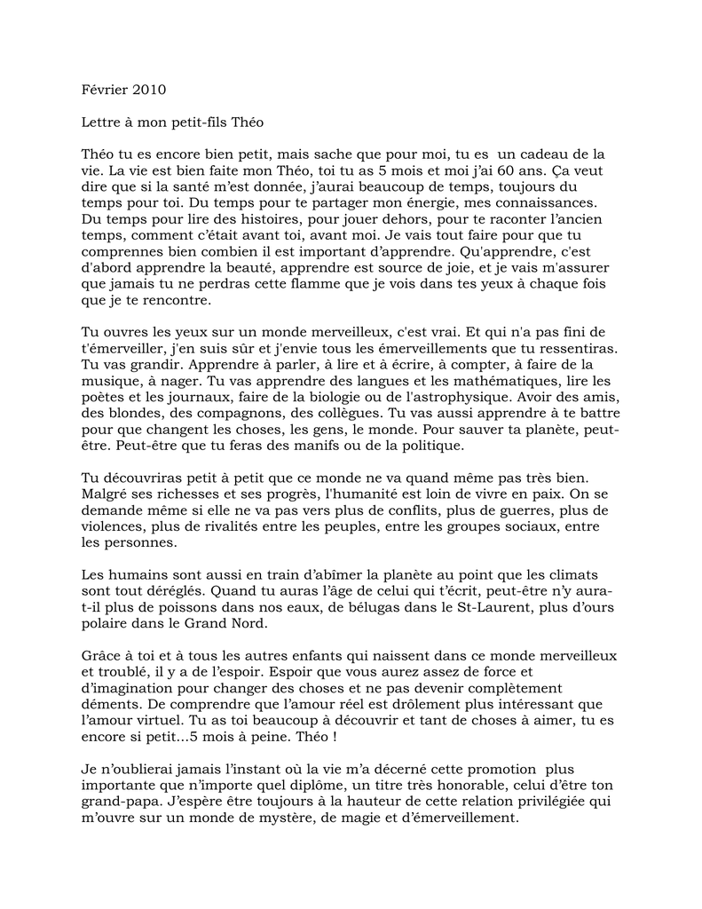 Février 2010 Lettre à mon petit-fils Théo Théo tu es encore bien petit, mais sache que pour moi, tu es un cadeau de la vie. La vie est bien faite mon Théo, toi tu as 5 mois et moi j’ai 60 ans. Ça veut dire que si la santé m’est donnée, j’aurai beaucoup de temps, toujours du temps pour toi. Du temps pour te partager mon énergie, mes connaissances. Du temps pour lire des histoires, pour jouer dehors, pour te raconter l’ancien temps, comment c’était avant toi, avant moi. Je vais tout faire pour que tu comprennes bien combien il est important d’apprendre. Qu'apprendre, c'est d'abord apprendre la beauté, apprendre est source de joie, et je vais m'assurer que jamais tu ne perdras cette flamme que je vois dans tes yeux à chaque fois que je te rencontre. Tu ouvres les yeux sur un monde merveilleux, c'est vrai. Et qui n'a pas fini de t'émerveiller, j'en suis sûr et j'envie tous les émerveillements que tu ressentiras. Tu vas grandir. Apprendre à parler, à lire et à écrire, à compter, à faire de la musique, à nager. Tu vas apprendre des langues et les mathématiques, lire les poètes et les journaux, faire de la biologie ou de l'astrophysique. Avoir des amis, des blondes, des compagnons, des collègues. Tu vas aussi apprendre à te battre pour que changent les choses, les gens, le monde. Pour sauver ta planète, peutêtre. Peut-être que tu feras des manifs ou de la politique. Tu découvriras petit à petit que ce monde ne va quand même pas très bien. Malgré ses richesses et ses progrès, l'humanité est loin de vivre en paix. On se demande même si elle ne va pas vers plus de conflits, plus de guerres, plus de violences, plus de rivalités entre les peuples, entre les groupes sociaux, entre les personnes. Les humains sont aussi en train d’abîmer la planète au point que les climats sont tout déréglés. Quand tu auras l’âge de celui qui t’écrit, peut-être n’y aurat-il plus de poissons dans nos eaux, de bélugas dans le St-Laurent, plus d’ours polaire dans le Grand Nord. Grâce à toi et à tous les autres enfants qui naissent dans ce monde merveilleux et troublé, il y a de l’espoir. Espoir que vous aurez assez de force et d’imagination pour changer des choses et ne pas devenir complètement déments. De comprendre que l’amour réel est drôlement plus intéressant que l’amour virtuel. Tu as toi beaucoup à découvrir et tant de choses à aimer, tu es encore si petit...5 mois à peine. Théo ! Je n’oublierai jamais l’instant où la vie m’a décerné cette promotion plus importante que n’importe quel diplôme, un titre très honorable, celui d’être ton grand-papa. J’espère être toujours à la hauteur de cette relation privilégiée qui m’ouvre sur un monde de mystère, de magie et d’émerveillement. Je voudrais en terminant te dire combien il est bon, gratifiant et exigeant de t’aimer ainsi. J’espère vivre assez longtemps pour te voir vivre heureux et libre. Je t’embrasse bien tendrement !!! Ton grand-papa Vigneau, André Où le vent nous a porté...Des Îles à la ville et de la ville aux Îles ! Notre amour nous a fait se rencontrer, Philippe, pour revenir habiter nos chères Îles, notre coin de pays si cher à nos yeux, notre Havre-Aubert natal. Voici un premier but commun d'atteint. Notre amour continu de grandir et c'est en 2010 que nous unissons nos vœux. Je profite de cette occasion pour te souhaiter une très belle Saint-Valentin mon Amour, toi qui me fais vivre tant de belles choses et que j'aime profondément. C'est un petit clin d’œil pour tout ce qui nous est arrivé jusqu'à présent et tout ce qui viendra dans le futur ! Je t'aime À: Philippe Verdier DE: Andrée-Anne Cyr Un message d’amour pour mon petit rayon de soleil ! La Saint-Valentin est une fête qui nous rappelle combien il est important de dire aux gens qui nous sont chers combien on les aime. Non seulement aujourd’hui, mais chaque jour qui passe, tu m’apportes une grande fierté et une immense joie. Il y a un peu plus de 4 ans déjà, la vie m’a donné la chance de te donner naissance. Depuis ce jour je te vois grandir, évoluer, je t’observe, je t’admire et tu sais me surprendre encore chaque jour. Tes petits sourires et tes petites marques d’affection sont toujours source de grand bonheur. Tu as le tour de nous faire sourire et de mettre du soleil dans nos journées parfois un peu sombre. Je veux que tu saches que je serai toujours là pour toi et que je t’aimerai toujours. Je suis fière de toi et je t’aime très fort ! De ta petite maman chérie. Céline Bonjour Un message pour mon petit papa d'amour et un merveilleux papi pour l'occasion de son 68e anniversaire de naissance (12 février) et la Saint-Valentin. Nous tenons à te dire que l'on pense fort fort à toi particulièrement aujourd'hui et nous attendons avec impatience de célébrer avec toi lors de notre rassemblement en août prochain à l'occasion du centenaire du Ponchon. Tes petites cocottes Rosaline et Florence et ta grande Chantal. On t'adore! Chantal à Jean-Pierre (Pierrot) à Charles à Alcide Gaudet Laprairie Message d'amour d'une mère à sa fille Ma chère Eliane, Je profite des ondes du Son de la Mer pour te livrer mon message d'amour en cette Saint-Valentin 2010. Pour moi, il est important de te dire que je suis une maman comblée d'avoir une fille comme toi. Tu es chère à mon cœur. Je trouve que tu es une personne exceptionnelle. Ta personnalité et tes talents professionnels font de toi une femme de tête et de cœur qui rêve d'une société meilleure. Je suis heureuse de t'appuyer dans tes projets de carrière et de vie car je t'aime de tout mon cœur. Nul doute que si nous avions vécu, toutes les deux, en 1910, je t'aurais envoyé mon message d'amour dans une boîte de conserve à l'intérieur du ponchon qui a été retrouvé en Nouvelle-Écosse. Cent ans plus tard, nous pouvons communiquer rapidement par courriel et sur Facebook. 