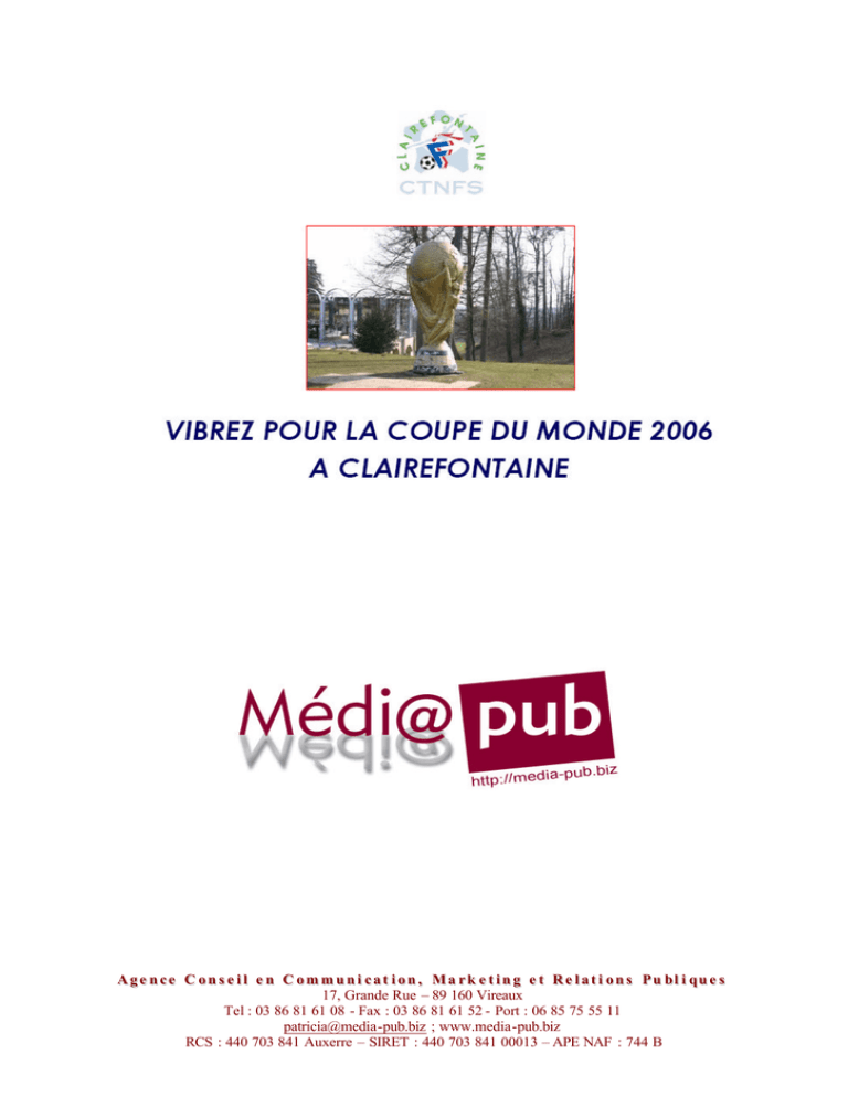 A g e n c e C o n s e i l e n C o m m u n i c a t i o n , M a r k e t i n g e t R e l a t i o n s Pu bl i qu e s 17, Grande Rue – 89 160 Vireaux Tel : 03 86 81 61 08 - Fax : 03 86 81 61 52 - Port : 06 85 75 55 11 [email protected] ; www.media-pub.biz RCS : 440 703 841 Auxerre – SIRET : 440 703 841 00013 – APE NAF : 744 B Médi@pub vous ouvre exceptionnellement les portes du Domaine de Clairefontaine à l’occasion de la Coupe du Monde 2006 (résidence et centre d’entraînement de l’équipe de France). Profitez de l’événement avec vos invités privilégiés. A g e n c e C o n s e i l e n C o m m u n i c a t i o n , M a r k e t i n g e t R e l a t i o n s Pu bl i qu e s 17, Grande Rue – 89 160 Vireaux Tel : 03 86 81 61 08 - Fax : 03 86 81 61 52 - Port : 06 85 75 55 11 [email protected] ; www.media-pub.biz RCS : 440 703 841 Auxerre – SIRET : 440 703 841 00013 – APE NAF : 744 B A g e n c e C o n s e i l e n C o m m u n i c a t i o n , M a r k e t i n g e t R e l a t i o n s Pu bl i qu e s 17, Grande Rue – 89 160 Vireaux Tel : 03 86 81 61 08 - Fax : 03 86 81 61 52 - Port : 06 85 75 55 11 [email protected] ; www.media-pub.biz RCS : 440 703 841 Auxerre – SIRET : 440 703 841 00013 – APE NAF : 744 B Nous pouvons aussi organiser des événements pour tous les autres matchs des équipes participants à la Coupe du Monde. Consultez nous au 03 86 81 61 08, ou bien via mail : [email protected] A g e n c e C o n s e i l e n C o m m u n i c a t i o n , M a r k e t i n g e t R e l a t i o n s Pu bl i qu e s 17, Grande Rue – 89 160 Vireaux Tel : 03 86 81 61 08 - Fax : 03 86 81 61 52 - Port : 06 85 75 55 11 [email protected] ; www.media-pub.biz RCS : 440 703 841 Auxerre – SIRET : 440 703 841 00013 – APE NAF : 744 B A g e n c e C o n s e i l e n C o m m u n i c a t i o n , M a r k e t i n g e t R e l a t i o n s Pu bl i qu e s 17, Grande Rue – 89 160 Vireaux Tel : 03 86 81 61 08 - Fax : 03 86 81 61 52 - Port : 06 85 75 55 11 [email protected] ; www.media-pub.biz RCS : 440 703 841 Auxerre – SIRET : 440 703 841 00013 – APE NAF : 744 B Conditions : Par table de 10 couverts……………………………3 100 € Votre contact pour vos réservations : SIMON Patricia 03 86 81 50 40 Fax : 03 86 81 61 52 [email protected] A g e n c e C o n s e i l e n C o m m u n i c a t i o n , M a r k e t i n g e t R e l a t i o n s Pu bl i qu e s 17, Grande Rue – 89 160 Vireaux Tel : 03 86 81 61 08 - Fax : 03 86 81 61 52 - Port : 06 85 75 55 11 [email protected] ; www.media-pub.biz RCS : 440 703 841 Auxerre – SIRET : 440 703 841 00013 – APE NAF : 744 B A g e n c e C o n s e i l e n C o m m u n i c a t i o n , M a r k e t i n g e t R e l a t i o n s Pu bl i qu e s 17, Grande Rue – 89 160 Vireaux Tel : 03 86 81 61 08 - Fax : 03 86 81 61 52 - Port : 06 85 75 55 11 [email protected] ; www.media-pub.biz RCS : 440 703 841 Auxerre – SIRET : 440 703 841 00013 – APE NAF : 744 B Votre contact : SIMON Patricia, Fax : 03 86 81 61 52 Date 23-juin-06 18-juin-06 13-juin-06 Match France Togo France Corée France Suisse Nb de tables Prix unitaire * 3 100 € Total HT dont TVA 19,6 % Total TTC A g e n c e C o n s e i l e n C o m m u n i c a t i o n , M a r k e t i n g e t R e l a t i o n s Pu bl i qu e s 17, Grande Rue – 89 160 Vireaux Tel : 03 86 81 61 08 - Fax : 03 86 81 61 52 - Port : 06 85 75 55 11 [email protected] ; www.media-pub.biz RCS : 440 703 841 Auxerre – SIRET : 440 703 841 00013 – APE NAF : 744 B A g e n c e C o n s e i l e n C o m m u n i c a t i o n , M a r k e t i n g e t R e l a t i o n s Pu bl i qu e s 17, Grande Rue – 89 160 Vireaux Tel : 03 86 81 61 08 - Fax : 03 86 81 61 52 - Port : 06 85 75 55 11 [email protected] ; www.media-pub.biz RCS : 440 703 841 Auxerre – SIRET : 440 703 841 00013 – APE NAF : 744 B
