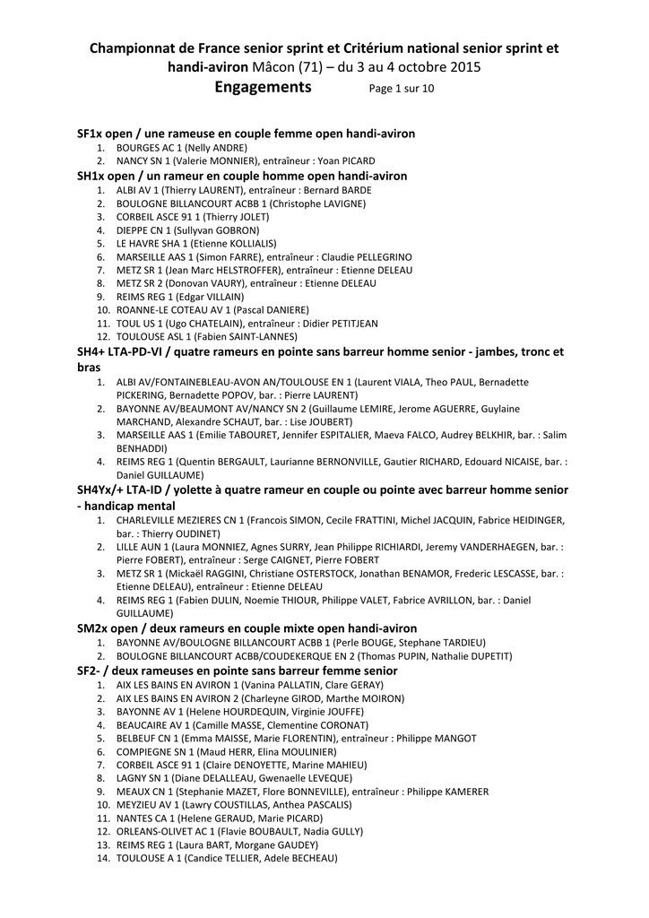 Championnat de France senior sprint et Critérium national senior sprint et handi-aviron Mâcon (71) – du 3 au 4 octobre 2015 Engagements Page 1 sur 10 SF1x open / une rameuse en couple femme open handi-aviron 1. 2. BOURGES AC 1 (Nelly ANDRE) NANCY SN 1 (Valerie MONNIER), entraîneur : Yoan PICARD SH1x open / un rameur en couple homme open handi-aviron 1. 2. 3. 4. 5. 6. 7. 8. 9. 10. 11. 12. ALBI AV 1 (Thierry LAURENT), entraîneur : Bernard BARDE BOULOGNE BILLANCOURT ACBB 1 (Christophe LAVIGNE) CORBEIL ASCE 91 1 (Thierry JOLET) DIEPPE CN 1 (Sullyvan GOBRON) LE HAVRE SHA 1 (Etienne KOLLIALIS) MARSEILLE AAS 1 (Simon FARRE), entraîneur : Claudie PELLEGRINO METZ SR 1 (Jean Marc HELSTROFFER), entraîneur : Etienne DELEAU METZ SR 2 (Donovan VAURY), entraîneur : Etienne DELEAU REIMS REG 1 (Edgar VILLAIN) ROANNE-LE COTEAU AV 1 (Pascal DANIERE) TOUL US 1 (Ugo CHATELAIN), entraîneur : Didier PETITJEAN TOULOUSE ASL 1 (Fabien SAINT-LANNES) SH4+ LTA-PD-VI / quatre rameurs en pointe sans barreur homme senior - jambes, tronc et bras 1. 2. 3. 4. ALBI AV/FONTAINEBLEAU-AVON AN/TOULOUSE EN 1 (Laurent VIALA, Theo PAUL, Bernadette PICKERING, Bernadette POPOV, bar. : Pierre LAURENT) BAYONNE AV/BEAUMONT AV/NANCY SN 2 (Guillaume LEMIRE, Jerome AGUERRE, Guylaine MARCHAND, Alexandre SCHAUT, bar. : Lise JOUBERT) MARSEILLE AAS 1 (Emilie TABOURET, Jennifer ESPITALIER, Maeva FALCO, Audrey BELKHIR, bar. : Salim BENHADDI) REIMS REG 1 (Quentin BERGAULT, Laurianne BERNONVILLE, Gautier RICHARD, Edouard NICAISE, bar. : Daniel GUILLAUME) SH4Yx/+ LTA-ID / yolette à quatre rameur en couple ou pointe avec barreur homme senior - handicap mental 1. 2. 3. 4. CHARLEVILLE MEZIERES CN 1 (Francois SIMON, Cecile FRATTINI, Michel JACQUIN, Fabrice HEIDINGER, bar. : Thierry OUDINET) LILLE AUN 1 (Laura MONNIEZ, Agnes SURRY, Jean Philippe RICHIARDI, Jeremy VANDERHAEGEN, bar. : Pierre FOBERT), entraîneur : Serge CAIGNET, Pierre FOBERT METZ SR 1 (Mickaël RAGGINI, Christiane OSTERSTOCK, Jonathan BENAMOR, Frederic LESCASSE, bar. : Etienne DELEAU), entraîneur : Etienne DELEAU REIMS REG 1 (Fabien DULIN, Noemie THIOUR, Philippe VALET, Fabrice AVRILLON, bar. : Daniel GUILLAUME) SM2x open / deux rameurs en couple mixte open handi-aviron 1. 2. BAYONNE AV/BOULOGNE BILLANCOURT ACBB 1 (Perle BOUGE, Stephane TARDIEU) BOULOGNE BILLANCOURT ACBB/COUDEKERQUE EN 2 (Thomas PUPIN, Nathalie DUPETIT) SF2- / deux rameuses en pointe sans barreur femme senior 1. 2. 3. 4. 5. 6. 7. 8. 9. 10. 11. 12. 13. 14. AIX LES BAINS EN AVIRON 1 (Vanina PALLATIN, Clare GERAY) AIX LES BAINS EN AVIRON 2 (Charleyne GIROD, Marthe MOIRON) BAYONNE AV 1 (Helene HOURDEQUIN, Virginie JOUFFE) BEAUCAIRE AV 1 (Camille MASSE, Clementine CORONAT) BELBEUF CN 1 (Emma MAISSE, Marie FLORENTIN), entraîneur : Philippe MANGOT COMPIEGNE SN 1 (Maud HERR, Elina MOULINIER) CORBEIL ASCE 91 1 (Claire DENOYETTE, Marine MAHIEU) LAGNY SN 1 (Diane DELALLEAU, Gwenaelle LEVEQUE) MEAUX CN 1 (Stephanie MAZET, Flore BONNEVILLE), entraîneur : Philippe KAMERER MEYZIEU AV 1 (Lawry COUSTILLAS, Anthea PASCALIS) NANTES CA 1 (Helene GERAUD, Marie PICARD) ORLEANS-OLIVET AC 1 (Flavie BOUBAULT, Nadia GULLY) REIMS REG 1 (Laura BART, Morgane GAUDEY) TOULOUSE A 1 (Candice TELLIER, Adele BECHEAU) Championnat de France senior sprint et Critérium national senior sprint et handi-aviron Mâcon (71) – du 3 au 4 octobre 2015 Engagements Page 2 sur 10 SF2x / deux rameuses en couple femme senior 1. 2. 3. 4. 5. 6. 7. 8. 9. 10. 11. 12. 13. 14. 15. 16. 17. 18. 19. 20. 21. 22. 23. 24. 25. 26. 27. 28. 29. ANGERS NA 1 (Amicie GROLLET, Anaelle BLANCHARD) AVIGNON SN 1 (Marion COFFIGNIEZ, Flore VILLARET) BASSE SEINE SN 1 (Penelope MERCIER, Justine BILLET) BAYONNE AV 1 (Rachel JUNG, Anne JOUY) BEAUMONT AV 1 (Virginie LIOT, Guylaine MARCHAND) BRIVE CSN 1 (Sylvie ARBEY, Marie Eve BAYLE) CHALON SUR SAONE CA 1 (Alexandra MERLIN, Julie GENEVOIS) CHALON SUR SAONE CA 2 (Melanie OQUIDAN, Elise THOMAS) CHAMBERY CN 1 (Armelle PIGNOUX, Charlotte PORCHIER) CHAMBERY CN 2 (Fanny PARIS, Marion MINIGGIO) CHATEAU-GONTIER CN 1 (Rose BOULAY, Laurine ROIMIER) ERSTEIN ACP 1 (Lisa STREICHER, Sandrine PACHOT) GERARDMER AS 1 (Agathe-Leopoldine TROENLEN, Marion FETET) LILLE AUN 1 (Celine DOSSIER, Heloise D'ALMEIDA), entraîneur : Pascal DUPUIS, Pierre FOBERT LYON CA 1 (Blandine LAMARTINE, Camille PIGUET) MANOSQUE AC 1 (Candice MAZZOLINI, Fanny GUENDE), entraîneur : Frederic DIEUDONNE MELUN CN 1 (Caroline BERNARD, Lea PARODI) MEYZIEU AV 1 (Aurelie CRIBIER, Morgane MARCOS) PERREUX SN 1 (Solene DEFRANCE, Laurene BENEL) REIMS REG 1 (Lucie MATHIEU, Veronique COUVREUR) ROMANS ARP 1 (Pauline MONTERRAT, Anaelle MOULLARD) SAINT QUENTIN AV 1 (Aurelie BRISSET, Gervaise BOULANGER) SAUMUR SN 1 (Penelope CHAUVEAU, Claire D'ANGELO) SEDAN AV 1 (Iris KUKULJAN, Clotilde AVERLANT) SOISSONS SN 1 (Jade BESSE, Anais VALIAVANOS) SOUSTONS AC 1 (Juliette LUCMARET, Chloe BENOIT) TOULOUSE A 1 (Julie LAGARDE, Laura BAHAIN) TOULOUSE ASL 1 (Mathilde SMAGGHE, Clementine BRON) TOULOUSE ASL 2 (Fatma KHELIFI, Heloise GUIRAUD) SF2x CritSpri / deux rameuses en couple femme senior critérium sprint 1. 2. 3. 4. 5. 6. 7. 8. 9. ANGOULEME AC 1 (Mathilde LANDAIS, Anne Lise FONTAINE) CHATEAU-GONTIER CN 1 (Annelyse ANGEARD, Coralie TURQUAIS) CONDRIEU SN 1 (Catherine CHOLVY, Charline RIVOIRE) MACON SR 1 (Daphne HECKER, Sarah BAKOURI) MARMANDE AV 1 (Benedicte PEYRAUD, Floriane PEYRAUD), entraîneur : Fabrice PEYRAUD MONTARGIS AC 1 (Nelly COUSIN, Marion DESPICQ) ORLEANS-OLIVET AC 1 (Cyrielle BOURGUIGNON, Adeline MAYEUX) ROANNE-LE COTEAU AV 1 (Ingrid THORAL, Noemie CHAZELLE) ROUFFIAC AC 1 (Audrey MASSAUX, Marion MARASCALCHI) SF4+ CritSpri / quatre rameuses en pointe avec barreur femme senior critérium sprint 1. 2. 3. CHAMBERY CN 1 (Anne CASTANER, Adéle MORNAS, France DUBICH, Emilie PARIS, bar. : Maxence PIGNOUX) LILLE AUN 1 (Anne DICKES-COOPMAN, Aurélie PAUL, Marie TOLEDO, Louise CLAVERIE, bar. : Aurelien PAU), entraîneur : Pascal DUPUIS, Pierre FOBERT MEYZIEU AV 1 (Cecile BECARIE, Christine COUDURI