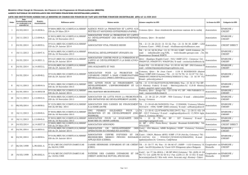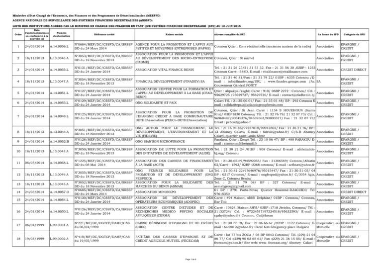 Ministère d'Etat Chargé de l'Economie, des Finances et des Programmes de Dénationalisation (MEEFPD) AGENCE NATIONALE DE SURVEILLANCE DES SYSTEMES FINANCIERS DECENTRALISES (ANSSFD) LISTE DES INSTITUTIONS AGREES PAR LE MINISTRE EN CHARGE DES FINANCES EN TANT QUE SYSTÈME FINANCIER DECENTRALISE (SFD) AU 12 JUIN 2015 Ordre Date d'autorisation/mise en conformité à la nouvelle loi Numéro d'autorisation Référence arrêté Raison sociale Adresse complète du SFD La forme du SFD Catégorie du SFD 1 24/03/2014 A.14.0056.L N°0684/MEF/DC/CSSFD/CA/SRSSF AGENCE POUR LA PROMOTION ET L'APPUI AUX Cotonou Qtier : Zone résidentielle (ancienne maison de la radio) DD du 24 Mars 2014 PETITES ET MOYENNES ENTREPRISES (PAPME) Association EPARGNE / CREDIT 2 18/11/2013 L.13.0046.A ASSOCIATION POUR LA PROMOTION ET L’APPUI N°3053/MEF/DC/CSSFD/CA/SRSSF AU DÉVELOPPEMENT DES MICRO-ENTREPRISE Cotonou, Qtier : St michel DD du 18 Novembre 2013 (PADME) Association EPARGNE / CREDIT 3 24/01/2014 A.14.0055.L N°0131/MEF/DC/CSSFD/CA/SRSSF ASSOCIATION VITAL FINANCE BENIN DD du 24 Janvier 2014 Tél. : 21 31 26 23/21 31 53 32, Fax : 21 31 56 30 ,02BP : 1253 Association Cotonou Carré : 548D, E-mail : [email protected] CREDIT DIRECT 4 18/11/2013 L.13.0047.A N°3054/MEF/DC/CSSFD/CA/SRSSF FINANCIAL DÉVELOPPEMENT (FINADEV) SA DD du 18 Novembre 2013 Tél. : 21 31 40 81/Fax : 21 31 79 22/ 01BP : 6335 Cotonou /Email : [email protected]/URL : www.finadev.groupe.com /Av. SA Gouverneur Général PONTY EPARGNE / CREDIT 5 24/01/2014 A.14.0051.L Qtier : Akpakpa (Yagbé) Carré : 910/ 06BP 2272 : Cotonou/ Cel. : Association 95629725 /95629737/ 95629726/ E-mail : [email protected] EPARGNE / CREDIT 6 24/01/2014 A.14.0053.L Calavi Tél. : 21-35-00-01/ Fax : 21-35-01-48/ BP : 292 Cotonou EAssociation mail : solidarité[email protected] EPARGNE / CREDIT 7 24/01/2014 A.14.0048.L Cotonou, Qtier : St Jean Carré : 1134 S HOUEHOUN (Sainte ASSOCIATION POUR LA PROMOTION DE N°0125/MEF/DC/CSSFD/CA/SRSSF Rita)/ 03BP1830 Cotonou/ Tél. : 21 32 76 79/ 21 32 07 73/ Cel. : L'EPARGNE CREDIT A BASE COMMUNAUTAIRE Association DD du 24 Janvier 2014 96960487/90045376/94539363/93803317/ Fax : 21 32 07 73/ BETHEAssociation (PEBCo-BETHEAssociation) Email : [email protected] EPARGNE / CREDIT 8 18/11/2013 A.13.0044.A 9 24/01/2014 A.14.0052.B 10 18/11/2013 11 ASSOCIATION CENTRE POUR LA FORMATION ET N°0127/MEF/DC/CSSFD/CA/SRSSF L’APPUI AU DÉVELOPPEMENT À LA BASE (CFADDD du 24 Janvier 2014 BENIN) N°0129/MEF/DC/CSSFD/CA/SRSSF ONG SOLIDARITE ET PAIX DD du 24 Janvier 2014 ONG ACTION POUR LE FINANCEMENT, LE Tél. : 21 15 94 86/97257818/90942865/ Fax : 21 36 21 76/ BP : N°3051/MEF/DC/CSSFD/CA/SRSSF DÉVELOPPEMENT, L’ENVIRONNEMENT ET LA 13 Abomey Calavi/ E-mail : [email protected]/ C/S-B Abomey Association DD du 18 Novembre 2013 Calavi, quartier saint Louis Sèmè VIE (FIDEVIE) N°0128/MEF/DC/CSSFD/CA/SRSSF Parakou, Qtier : Zongo Tél. : 23 10 06 47/ BP : 488 PARAKOU EAssociation ONG SIAN’SON MICROFINANCE DD du 24 Janvier 2014 mail : [email protected] EPARGNE / CREDIT L.13.0043.A N°3050/MEF/DC/CSSFD/CA/SRSSF ASSOCIATION DE LUTTE POUR LA PROMOTION Tél. : 21 38 22 24 /01BP : 908 Cotonou/ E-mail : alide@alideAssociation DD du 18 Novembre 2013 DES INITIATIVES DE DÉVELOPPEMENT (ALIDÉ) bj.org/ Cotonou EPARGNE / CREDIT 08/05/2014 A.14.0058.L N°1225/MEF/DC/CSSFD/CA/SRSSF ASSOCIATION DES CAISSES DE FINANCEMENT Tél. : 21-30-65-69/94592055/ Fax : 21306569/ Cotonou/Aïbatin Association DD du 08 Mai 2014 À LA BASE (ACFB) 02/Carré : 1593/ 02BP :2268 cotonou/ E-mail : [email protected] EPARGNE / CREDIT 12 18/11/2013 L.13.0049.A 13 18/11/2013 L.13.0045.A 14 24/03/2014 A.14.0057.O 15 24/01/2014 A.14.0054.L 16 24/01/2014 A.14.0050.L ASSOCIATION CENTRE N°0126/MEF/DC/CSSFD/CA/SRSSF RECHERCHES MEDICO DD du 24 Janvier 2014 APPLIQUEES (CERMA) 17 06/04/1999 L.99.0001.A N°221/MF/DC/DGTCP/DAMF/CAS du 06/04/1999 CAISSE BÉNINOISE D’EPARGNE ET DE CRÉDIT Tél. : 21 30 77 19/ Fax : 21 06 66 67 /02BP : 1122 Cotonou/ E- Coopérative ou EPARGNE / (CBEC) mail : [email protected]/ Carré 634 Gbégamey-place Bulgarie Mutuelle CREDIT 18 19/05/1999 L.99.0002.A N°410/MF/DC/DGTCP/DAMF/CAS du 19/05/1999 Carré : lot 77 bis ZOCA / 08 BP 0843 Cotonou/ Tél. (229) 21 04 FAÎTIÈRE DES CAISSES D’EPARGNE ET DE Coopérative ou EPARGNE / 86 77/ Cel :(229) 90 02 65 61/ Fax :(229) 21 36 15 05/ E-mail : CRÉDIT AGRICOLE MUTUEL (FECECAM) Mutuelle CREDIT [email protected]/ Site web: www. fececam.org/ Abomey- Calavi ONG FEMMES SOLIDAIRES POUR LA Tél. : 21-30-81-22/97646976/95015447/ Fax : 21-30-51-05/ 04 N°3055/MEF/DC/CSSFD/CA/SRSSF PROMOTION ET DE DÉVELOPPEMENT (ONG BP : 0217 Cotonou/ E-mail : [email protected]/ C/3054 Agla, DD du 18 Novembre 2013 Zone C, Cotonou Bénin/ FESPROD) N°3052/MEF/DC/CSSFD/CA/SRSSF ASSOCIATION POUR LA SOLIDARITÉ DES Tél. : 21 31 79 08/ BP : 327 Cotonou/ E-mail : [email protected] DD du 18 Novembre 2013 MARCHÉS DU BÉNIN (ASMAB) N°0685/MEF/DC/CSSFD/CA/SRSSF 01 BP : 2791 Porto-Novo/ Quatier Houinmè-DJAGUIDI/ Tel: ASSOCIATION MINONKPO DD du 24 Mars 2014 97615350 N°0130/MEF/DC/CSSFD/CA/SRSSF ASSOCIATION DE DÉVELOPPEMENT DES Carré : 494 Maison, AISSI Delphine/ 01BP : Cotonou/ Cotonou, Bar Tito DD du 24 Janvier 2014 OPÉRATEURS ECONOMIQUES (ADOPEC) EPARGNE / CREDIT Association EPARGNE / CREDIT Association EPARGNE / CREDIT Association CREDIT DIRECT Association EPARGNE / CREDIT D'ETUDES ET DE Carré : 10624, Maison AHYI/ 03BP :1718 Jéricho, Cotonou/ Tél. : PSYCHO SOCIALES 21132724/ Cel. : 97224517/97224518/95632593/ E-mail : Association [email protected]/ Cotonou, Cadjèhoun EPARGNE / CREDIT Page 1 de 6 Ordre Date d'autorisation/mise en conformité à la nouvelle loi Numéro d'autorisation Référence arrêté Raison sociale Adresse complète du SFD ASSOCIATION POUR LA SOLIDARITÉ ET LA Abomey, Tél. : 22 50 15 29/ BP: 292 Abomey/ E-mail PROMOTION DES INITIATIVES À LA BASE :[email protected] (ASOPRIB) Cotonou, Qtier : Menontin/ Tél. : 21 38 50 07/ Fax: 21 