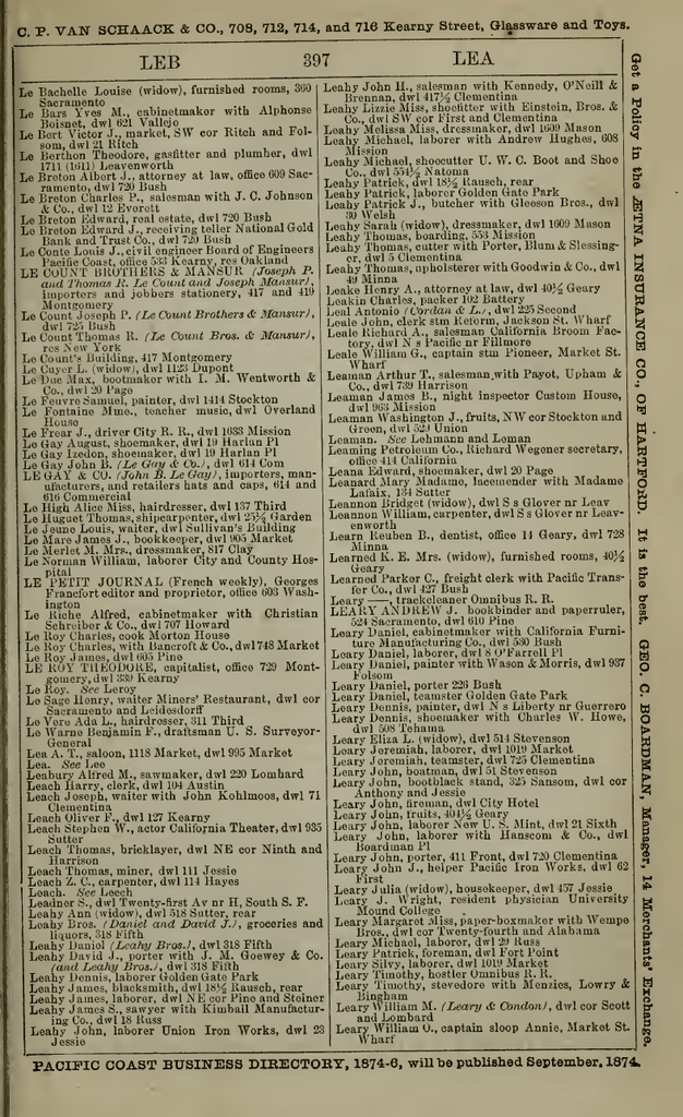 C, p. VAN SCHAACK & CO., 708, 712, 714, and 716 LEB Le Bachelle Louise (widow), furnished rooms Sacramento .,,.,!. Le Bars Yves M., cabinetmaker with Alphonse Le , Boisnet, dwl 621 Valltgo Bort Victor J., market, bW Street, Glassware and Toys. LEA 397 360 , Kearny H., salesman with Kennedy, O'Neill Brennan, dwl 417>^ Clementina Leahy Lizzie Miss, shoeiitter with Einstein, Bros. cor First and Clementina Co., dwl Leahy John SW & & Melissa Miss, dressmaker, dwl 1609 Mason Leahy Michael, laborer with Andrew Hughes, 608 Mission Leahy Michael, shoecutter U. W. C. Boot and Shoe Ritch and ioU Leahy cor som, dwl 21 Riteh j , , Le Berthon Theodore, gasfitter and plumber, dwl 1711 (1611) Leavenworth Co., dwl b.yi^ Natoma Le Breton Albert J., attorney at law, office 609 bae- Leahy Patrick, dwl 18>^ Rausch, rear ramento, dwl 720 Bush ^ ^ t Patrick, laborer Golden Gate Park Leahy Johnson with J. C. Le Breton Charles P., salesman Leahy Patrick J., butcher with Gleeson Bros., dwl & Co., dwl 12 Everett Welsh 30 Bush 720 dwl Le Breton Edward, real estate, Sarah (widow), dressmaker, dwl 1609 Mason Le Breton Edward J., receiving teller National Gold Leahy Thomas, boarding, 553 Mission Leahy Bank and Trust Co., dwl 720 Bush Thomas, cutter with Porter, Blum & SlessingLe Conte Louis J., civil engineer Board of Engineers Leahy or, dwl 5 Clementina Oakland res 583 Kearny, office Paciflc (Doast, Thomas, upholsterer with Goodwin & Co., dwl LE COUNT BROTHERS & MANSUR fJoseph P. Leahy 49 Minna and Thomas li. Le Count and Joseph Mansur) Henry A., attorney at law, dwl 40J-^ Geary Leake importers and jobbers stationery, 417 and 419 Leakin Charles, packer 102 Battery Montgomery (Cardan & L./ dwl 225 Second Antonio Leal Le Count Joseph P. (Le Count Brothers & Mansur), Leale John, clerk stm Reform, Jackson St. Wharf dwl 72.1 Bush Richard A., salesman California Broom FacLeale Le Count Thomas R. (Le Count Bros. & Mansur), tory, dwl N s Pacific nr Fillmore res New York captain stm Pioneer, Market St. William G., Leale Le Count's Building, 417 Montgomery Wharf Le Cuyer L. (widow), dwl 1123 Dupont salesman,with Pa.yot, Upham & T., Arthur Leaman Wentworth & Le Due Max, bootmaker with I. M. Co., dwl 739 Harrison Co., dwl 20 Page night inspector Custom House, James B., Leaman Stockton Le Feuvre Samuel, painter, dwl 1414 dwl 963 Mission Le Fontaine Mme., teacher music, dwl Overland cor Stockton and Washington J., fruits, N Leaman House Green, dwl 529 Union Le Froar J., driver City R. R., dwl 1633 Mission Lehmann and Loman See Leaman. Harlan Pi shoemaker, dwl 19 Le Gay August, Learning Petroleum Co., Richard Wegener secretary, Le Gay Izedon, shoemaker, dwl 19 Harlan PI office 414 California Le Gav John B. (Le Gay & Co.), dwl 614 Com Edward, shoemaker, dwl 20 Page LE GAY" & CO. (John B. Le Gay) importers, man- Leana Mary Madame, lacemender with Madame ufacturers, and retailers hats and caps, 614 and Leanard 134 Sutter Lafais, 616 Commercial Leannon Bridget (widow), dwl S s Glover nr Leav Le High Alice Miss, hairdresser, dwl 137 Third carpenter, dwl S s Glover nr LeavWilliam, Leannon Le Huguet Thomas, shipcarpenter, dwl 253/^ Garden enworth Le Jeune Louis, waiter, dwl Sullivan's Building dentist, office 14 Geary, dwl 728 Reuben B., Learn Le Mare James J., bookkeeper, dwl 905 Market Minna Le Merlet M. Mrs., dressmaker, 817 Clay (widow), furnished rooms, 40>^ K. E. Mrs. Learned Le Norman William, laborer City and County HosGeary pital freight clerk with Pacific TransParker C, Learned LE PETIT JOURNAL (French weekly), Georges fer Co., dwl 427 Bush Francfort editor and proprietor, office 603 WashOmnibus R. R. trackcleaner Leary ington ANDREW J. bookbinder and paperruler, Le Riche Alfred, cabinetmaker with Christian LEARYSacramento, 610 dwl Pine 524 Schreiber & Co., dwl 707 Howard Leary Daniel, cabinetmaker with California FurniLe Roy Charles, cook Morton House ture Manufacturing Co., dwl 530 Bush Le Roy Charles, with Bancroft & Co., dwl 748 Market Leary Daniel, laborer, dwl 8 O'Farrell PI Le Roy James, dwl 605 Pine Daniel, painter with Wason & Morris, dwl 937 Leary 729 Montcapitalist, office THEODORE, LE ROY Folsom gomery, dwl 339 Kearny Daniel, porter 226 Bush Leary Leroy Le Roy. See Golden Gate Park Le Sage Henry, waiter Miners' Restaurant, dwl cor Leary Daniel, teamster Leary Dennis, painter, dwl N s Liberty nr Guerrero Sacramento and Leidesdorff shoemaker with Charles W. Howe, Dennis, Leary Le Vere Ada L., hairdresser, 311 Third dwl 508 Tehama Le Warne Benjamin F., draftsman U. S. Surveyor514 Stevenson (widow), dwl Eliza L. Leary General Leary Jeremiah, laborer, dwl 1019 Market Lea A. T., saloon, 1118 Market, dwl 995 Market 725 Clementina teamster, dwl Jeremiah, Leary Lea. See Lee Leary John, boatman, dwl 51 Stevenson Leabury Alfred M., sawmaker, dwl 220 Lombard bootblack stand, 325 Sansom, dwl cor John, Leary Leach Harry, clerk, dwl 104 Austin Anthony and Jessie Leach Joseph, waiter with John Kohlmoos, dwl 71 dwl City fireman, Hotel John, Leary Clementina Leary John, fruits, 4045^ Geary Leach Oliver F., dwl 127 Kearny Leach Stephen W., actor California Theater, dwl 935 Leary John, laborer New U. S. Mint, dwl 21 Sixth Leary John, laborer with Hanscom & Co., dwl Sutter Boardman PI Leach Thomas, bricklayer, dwl NE cor Ninth and Leary John, porter, 411 Front, dwl 720 Clementina Harrison John J., helper Pacific Iron Works, dwl 62 Leary Leach Thomas, miner, dwl 111 Jessie First Leach Z. C, carpenter, dwl 114 Hayes (widow), housekeeper, dwl 457 Jessie Julia Leary Leech Leach. See Leary J. Wright, resident physician University Leadner S., dwl Twenty-first Av nr H, South S. F. Mound College Leahy Ann ^widow), dwl 518 Sutter, rear Leahy Bros. (Daniel and David J.), groceries and Leary Margaret Miss, paper-boxmaker with Wempe Bros., dwl cor Twenty-fourth and Alabama liquors, 318 Fifth Leary Michael, laborer, dwl 29 Russ Leahy Daniel (Leahy Bros.), dwl 318 Fifth Leahy David J., porter with J. M. Goewey & Co. Leary Patrick, foreman, dwl Fort Po