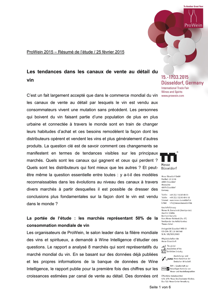 ProWein 2015 – Résumé de l’étude / 25 février 2015 Les tendances dans les canaux de vente au détail du vin C’est un fait largement accepté que dans le commerce mondial du vin les canaux de vente au détail par lesquels le vin est vendu aux consommateurs vivent une mutation sans précédent. Les personnes qui boivent du vin faisant partie d’une population de plus en plus urbaine et connectée à travers le monde sont en train de changer leurs habitudes d’achat et ces besoins remodèlent la façon dont les distributeurs opèrent et vendent les vins et plus généralement d’autres produits. La question clé est de savoir comment ces changements se manifestent en termes de tendances visibles sur les principaux marchés. Quels sont les canaux qui gagnent et ceux qui perdent ? Quels sont les distributeurs qui font mieux que les autres ? Et peutêtre même la question essentielle entre toutes : y a-t-il des modèles reconnaissables dans les évolutions au niveau des canaux à travers divers marchés à partir desquelles il est possible de dresser des conclusions plus fondamentales sur la façon dont le vin est vendu dans le monde ? La portée de l’étude : les marchés représentant 50% de la consommation mondiale de vin Les organisateurs de ProWein, le salon leader dans la filière mondiale des vins et spiritueux, a demandé à Wine Intelligence d’étudier ces questions. Le rapport a analysé 8 marchés qui sont représentatifs du marché mondial du vin. En se basant sur des données déjà publiées et les propres informations de la banque de données de Wine Intelligence, le rapport publie pour la première fois des chiffres sur les croissances estimées par canal de vente au détail. Des données ont Seite 1 von 6 été analysées sur les États-Unis, le marché le plus important au monde pour le vin, sur l’Allemagne et la Grande-Bretagne, respectivement les nos 1 et 2 en termes de volume de vins importés. Le Japon et l’Australie étaient aussi dans le collimateur, ces deux pays ayant connu ces derniers temps une croissance dynamique ; et finalement, sur trois marchés où le vin est traditionnellement vendu en grande quantité mais qui déclinent depuis longtemps : la France, l’Espagne et l’Italie. Ces 8 marchés représentent à eux seuls plus de 12 milliards de litres de vin consommés en 2013 (source : IWSR), soit approximativement environ 50% des 24 milliards de litres de vin, ce qui équivaut à la consommation mondiale (source : OIV). De là, il s’ensuit que tout changement sur ces marchés, qu’il soit soudain ou graduel, aura des conséquences mondiales sur la chaîne d’approvisionnement et cela pourrait en final affecter tant les producteurs que les consommateurs. 8 marchés: quelques sujets, bien des différences Ceux qui s’attendent à une théorie simplificatrice et unificatrice des tendances dans le commerce des vins vont d’abord être déçus par le contenu de ce rapport. Chacun des pays analysé semble avoir son propre écosystème avec des lois-cadres et des climats d’affaires différents. Les notions populaires portant sur la mondialisation et la “convergence” de modèles de distribution ne sont pas vraiment adaptés à l’environnement réel dans le commerce de détail du vin qui est soumis à d’autres structures légales et à des attentes différentes des consommateurs. Alors que dans la plupart des cas, des changements apparaissent - certains même avec des conséquences majeures – cette évolution se passe généralement relativement lentement. Cela n’est pas surprenant : les consommateurs sont des créatures qui ont leur routine et qui ne sont pas prêts à changer radicalement leurs habitudes d’achat quant au type de magasins ou de boissons. Les détaillants bien établis ont un avantage naturel par Seite 2 von 6 rapport à tout nouveau canal ou sorte de commerce : ils occupent les meilleurs emplacements, ils profitent de la plus forte notoriété des marques et la plupart du temps, ils bénéficient de l’inertie du consommateur. Dans ce climat, les modèles traditionnels de vente au détail peuvent persister alors que pour les nouveaux il sera difficile de s’implanter à court terme. La révolution du magasin de proximité : des achats fréquents, des paniers plus petits Désormais, après avoir rééquilibré les attentes, il ressort quand même quelques tendances transnationales intéressantes qui sont mises en évidence dans ce rapport. La plus significative peut-être dans plusieurs des marchés clés est la tendance du consommateur à acheter des denrées alimentaires plus souvent mais aussi en moindre quantité, y compris le vin. D’un point de vue général (parce que la définition des canaux est différente d’un pays à l’autre), on peut dire que le canal du “magasin de proximité” est, pour le vin, devenu plus important dans des pays tels que la Grande-Bretagne, les États-Unis, la France et l’Espagne. Les vecteurs de cette tendance sont bien connus et viennent principalement d’une urbanisation croissante de la population, de la baisse du niveau de motorisation et d’utilisation de la voiture dans certains pays (due à l’augmentation du prix de l’essence et aux taxes sur les voitures). Ce modèle d’austérité urbaine est particulièrement réel en Espagne. Sur certains marchés, les bénéficiaires de cette tendance sont les mêmes détaillants qui dominent aussi déjà sur les autres canaux. C’est surtout vrai en Grande-Bretagne et en France où « les versions locales » des grandes chaînes de la distribution ont migré vers les villes et les cités au cours des dix dernières années, alors qu’elles avaient passé leur temps les dernières décennies du 20e siècle à persuader le consommateur d’aller faire ses courses en Seite 3 von 6 périphérie des villes, où il y avait des places de parking. Sur d’autres marchés tels que les États-Unis, la récente libéral