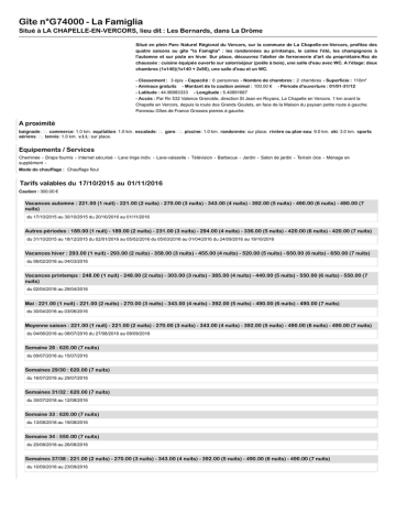 Gîte n°G74000 - La Famiglia Situé à LA CHAPELLE-EN-VERCORS, lieu dit : Les Bernards, dans La Drôme Situé en plein Parc Naturel Régional du Vercors, sur la commune de La Chapelle-en-Vercors, profitez des quatre saisons au gîte "la Famiglia" : les randonnées au printemps, le calme l'été, les champignons à l'automne et sur piste en hiver. Sur place, découvrez l'atelier de ferronnerie d'art du propriétaire.Rez de chaussée : cuisine équipée ouverte sur salon/séjour (poêle à bois), une salle d'eau avec WC. A l'étage: deux chambres (1x140)(1x140 + 2x90), une salle d'eau et un WC. - Classement : 3 épis - Capacité : 6 personnes - Nombre de chambres : 2 chambres - Superficie : 110m² - Animaux gratuits - Montant de la caution animal : 100.00 € - Période d'ouverture : 01/01-31/12 - Latitude : 44.96983333 - Longitude : 5.40891667 - Accès : Par Rn 532 Valence Grenoble, direction St Jean en Royans, La Chapelle en Vercors. 1 km avant la Chapelle en Vercors, depuis la route des Grands Goulets, en face de la Maison du paysan petite route à gauche. Panneau Gîtes de France Grosses pierres à gauche. A proximité baignade: �. commerce: 1.0 km. equitation: 1.0 km. escalade: �. gare: �. piscine: 1.0 km. randonnée: sur place. rivière ou plan eau: 9.0 km. ski: 3.0 km. sports aériens: �. tennis: 1.0 km. v.t.t.: sur place. Equipements / Services Cheminée - Draps fournis - Internet sécurisé - Lave linge indiv. - Lave-vaisselle - Télévision - Barbecue - Jardin - Salon de jardin - Terrain clos - Ménage en supplément Mode de chauffage : Chauffage fioul Tarifs valables du 17/10/2015 au 01/11/2016 Caution : 300.00 € Vacances automne : 221.00 (1 nuit) - 221.00 (2 nuits) - 270.00 (3 nuits) - 343.00 (4 nuits) - 392.00 (5 nuits) - 490.00 (6 nuits) - 490.00 (7 nuits) du 17/10/2015 au 30/10/2015 du 20/10/2016 au 01/11/2016 Autres périodes : 189.00 (1 nuit) - 189.00 (2 nuits) - 231.00 (3 nuits) - 294.00 (4 nuits) - 336.00 (5 nuits) - 420.00 (6 nuits) - 420.00 (7 nuits) du 31/10/2015 au 18/12/2015 du 02/01/2016 au 05/02/2016 du 05/03/2016 au 01/04/2016 du 24/09/2016 au 19/10/2016 Vacances hiver : 293.00 (1 nuit) - 293.00 (2 nuits) - 358.00 (3 nuits) - 455.00 (4 nuits) - 520.00 (5 nuits) - 650.00 (6 nuits) - 650.00 (7 nuits) du 06/02/2016 au 04/03/2016 Vacances printemps : 248.00 (1 nuit) - 248.00 (2 nuits) - 303.00 (3 nuits) - 385.00 (4 nuits) - 440.00 (5 nuits) - 550.00 (6 nuits) - 550.00 (7 nuits) du 02/04/2016 au 29/04/2016 Mai : 221.00 (1 nuit) - 221.00 (2 nuits) - 270.00 (3 nuits) - 343.00 (4 nuits) - 392.00 (5 nuits) - 490.00 (6 nuits) - 490.00 (7 nuits) du 30/04/2016 au 03/06/2016 Moyenne saison : 221.00 (1 nuit) - 221.00 (2 nuits) - 270.00 (3 nuits) - 343.00 (4 nuits) - 392.00 (5 nuits) - 490.00 (6 nuits) - 490.00 (7 nuits) du 04/06/2016 au 08/07/2016 du 27/08/2016 au 09/09/2016 Semaine 28 : 620.00 (7 nuits) du 09/07/2016 au 15/07/2016 Semaines 29/30 : 620.00 (7 nuits) du 16/07/2016 au 29/07/2016 Semaines 31/32 : 620.00 (7 nuits) du 30/07/2016 au 12/08/2016 Semaine 33 : 620.00 (7 nuits) du 13/08/2016 au 19/08/2016 Semaine 34 : 550.00 (7 nuits) du 20/08/2016 au 26/08/2016 Semaines 37/38 : 221.00 (2 nuits) - 270.00 (3 nuits) - 343.00 (4 nuits) - 392.00 (5 nuits) - 490.00 (6 nuits) - 490.00 (7 nuits) du 10/09/2016 au 23/09/2016 Options et suppléments : Ménage : 70.00 € pour le séjour Linge de toilette par personne : 4.00 € pour 7 nuits Contacts Coordonnées de la centrale GITES DE FRANCE DROME RESERVATION Plateau de Lautagne - BP 169 42 avenue de Langories 26906 VALENCE CEDEX 9 Téléphone : 04 75 83 09 23 Site internet : www.gites-de-france-drome.com Album photo Détail des pièces 1 : Cuisine + séjour Surface 40.00 m² Fenêtres : 6 Vue : Montagne Orientation :Sud-Est 2 : WC + Salle d'eau Surface 4.00 m² Fenêtre : 1 Orientation :Nord possède un wc possède une douche 3 : Chambre - Niveau 1 Surface 14.30 m² Fenêtre : 1 Vue : Montagne Orientation :Est lit de 140 : 1 4 : Chambre - Niveau 1 Surface 22.00 m² Fenêtres : 2 Vue : Montagne Orientation :Sud-Est lit de 90 : 2 lit de 140 : 1 5 : Salle d'eau - Niveau 1 Surface 7.60 m² Fenêtre : 1 Orientation :Sud possède une douche 6 : WC Surface 1.20 m² possède un wc