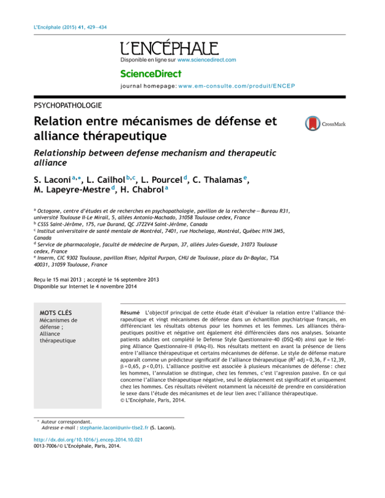 L’Encéphale (2015) 41, 429—434 Disponible en ligne sur www.sciencedirect.com ScienceDirect journal homepage: www.em-consulte.com/produit/ENCEP PSYCHOPATHOLOGIE Relation entre mécanismes de défense et alliance thérapeutique Relationship between defense mechanism and therapeutic alliance S. Laconi a,∗, L. Cailhol b,c, L. Pourcel d, C. Thalamas e, M. Lapeyre-Mestre d, H. Chabrol a a Octogone, centre d’études et de recherches en psychopathologie, pavillon de la recherche — Bureau R31, université Toulouse II-Le Mirail, 5, allées Antonio-Machado, 31058 Toulouse cedex, France b CSSS Saint-Jérôme, 175, rue Durand, QC J7Z2V4 Saint-Jérôme, Canada c Institut universitaire de santé mentale de Montréal, 7401, rue Hochelaga, Montréal, Québec H1N 3M5, Canada d Service de pharmacologie, faculté de médecine de Purpan, 37, allées Jules-Guesde, 31073 Toulouse cedex, France e Inserm, CIC 9302 Toulouse, pavillon Riser, hôpital Purpan, CHU de Toulouse, place du Dr-Baylac, TSA 40031, 31059 Toulouse, France Reçu le 15 mai 2013 ; accepté le 16 septembre 2013 Disponible sur Internet le 4 novembre 2014 MOTS CLÉS Mécanismes de défense ; Alliance thérapeutique ∗ Résumé L’objectif principal de cette étude était d’évaluer la relation entre l’alliance thérapeutique et vingt mécanismes de défense dans un échantillon psychiatrique français, en différenciant les résultats obtenus pour les hommes et les femmes. Les alliances thérapeutiques positive et négative ont également été différenciées dans nos analyses. Soixante patients adultes ont complété le Defense Style Questionnaire-40 (DSQ-40) ainsi que le Helping Alliance Questionnaire-II (HAq-II). Nos résultats mettent en avant la présence de liens entre l’alliance thérapeutique et certains mécanismes de défense. Le style de défense mature apparaît comme un prédicteur significatif de l’alliance thérapeutique (R2 adj = 0,36, F = 12,39,  = 0,65, p < 0,01). L’alliance positive est associée à plusieurs mécanismes de défense : chez les hommes, l’annulation se distingue, chez les femmes, c’est l’agression passive. En ce qui concerne l’alliance thérapeutique négative, seul le déplacement est significatif et uniquement chez les hommes. Ces résultats révèlent notamment la nécessité de prendre en considération le sexe dans l’étude des mécanismes et de leur lien avec l’alliance thérapeutique. © L’Encéphale, Paris, 2014. Auteur correspondant. Adresse e-mail : [email protected] (S. Laconi). http://dx.doi.org/10.1016/j.encep.2014.10.021 0013-7006/© L’Encéphale, Paris, 2014. 430 KEYWORDS Defense mechanisms; Therapeutic alliance S. Laconi et al. Summary Introduction. — The therapeutic alliance can be defined as a collaborative relationship between the patient and the practitioner. It represents an essential component of the psychotherapeutic process (Ambresin et al., 2007; Cungi, 2006; Martin et al., 2000). Some authors suggest that a good alliance can have a favorable impact on the therapeutic success (Barber et al., 2000; Hubble, Duncan, & Miller 1999; Horvath & Luborsky, 1993; Horvath & Symonds, 1991). This alliance can be influenced by psychological and behavioral factors (Cungi, 2006) Thus, some defense mechanisms could prevent change or, on the contrary could facilitate adaptation (Ambresin et al., 2007) and have an impact on the therapeutic success (Muris & Merckelbach, 1996). However, the relationship between therapeutic alliance and defense mechanisms represents an insufficiently explored field (Ambresin et al., 2007; Cungi, 2006). The aim of the present study was to examine the relationship between therapeutic alliance and twenty defense mechanisms in a sample of French psychiatric patients, by differentiating results in men and women. We also examined the positive and the negative therapeutic alliance. Method. — Sixty patients aged from 18 to 58 (M = 41.50; SD = 11.03) completed the French versions of the Defense Style Questionnaire-40 (DSQ-40) and the Helping Alliance questionnaire-II (HAq-II). Results. — Therapeutic alliance was significantly associated with each defense style: mature (0.62), neurotic (0.45) P < 0.01and immature (0.27) p < 0.05. The mature defense style was a significant predictor of therapeutic alliance (R2 adj = 36, F = 12.39,  = 0.65, P < 0.01) and of positive therapeutic alliance (R2 adj = 36, F = 12.34,  = 0.62, P < 0.001). Among women, positive therapeutic alliance was significantly associated with all mature defenses, three neurotic defenses (reaction formation, pseudo-altruism, idealization) and four immature defenses (splitting, denial, somatization, passive aggression). Among men, three mature defenses were associated (anticipation, humor, sublimation), four neurotic (reaction formation, pseudoaltruism, idealization and undoing) and two immature (somatization and denial). The negative therapeutic alliance, in our total sample, was associated with two immature defenses (denial and dissociation). Among men, displacement was the only defense associated with negative alliance, among women no defenses was significant. Discussion. — These results highlight the relationship between therapeutic alliance and some defense mechanisms, like some authors have suggested (Ambresin et al., 2007; Bond & Perry, 2004; Bond, 2004). Moreover, some defenses appeared to be more associated with a positive or a negative therapeutic alliance, and could depend on the patient gender. Conclusion. — The present study confirms the importance of taking into account the gender in the study of defense mechanisms, and to increase our knowledge about the relationship between therapeutic alliance and defense mechanisms. © L’Encéphale, Paris, 2014. Introduction Les mécanismes de défense peuvent être définis comme « des processus mentaux automatiques, qui s’activent en dehors du contrôle de la volonté et dont l’action demeure inconsciente » [1]. Leur