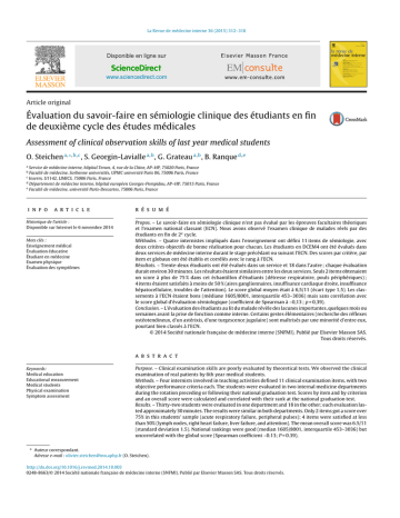 La Revue de médecine interne 36 (2015) 312–318 Disponible en ligne sur ScienceDirect www.sciencedirect.com Article original Évaluation du savoir-faire en sémiologie clinique des étudiants en fin de deuxième cycle des études médicales Assessment of clinical observation skills of last year medical students O. Steichen a,∗,b,c , S. Georgin-Lavialle a,b , G. Grateau a,b , B. Ranque d,e a Service de médecine interne, hôpital Tenon, 4, rue de la Chine, AP–HP, 75020 Paris, France Faculté de médecine, Sorbonne universités, UPMC université Paris 06, 75006 Paris, France Inserm, U1142, LIMICS, 75006 Paris, France d Département de médecine interne, hôpital européen Georges-Pompidou, AP–HP, 75015 Paris, France e Faculté de médecine, université Paris-Descartes, 75006 Paris, France b c i n f o a r t i c l e Historique de l’article : Disponible sur Internet le 6 novembre 2014 Mots clés : Enseignement médical Évaluation éducative Étudiant en médecine Examen physique Évaluation des symptômes r é s u m é Propos. – Le savoir-faire en sémiologie clinique n’est pas évalué par les épreuves facultaires théoriques et l’examen national classant (ECN). Nous avons observé l’examen clinique de malades réels par des étudiants en fin de 2e cycle. Méthodes. – Quatre internistes impliqués dans l’enseignement ont défini 11 items de sémiologie, avec deux critères objectifs de bonne réalisation pour chacun. Les étudiants en DCEM4 ont été évalués dans deux services de médecine interne durant le stage précédant ou suivant l’ECN. Des scores par critère, par item et globaux ont été établis et corrélés avec le rang à l’ECN. Résultats. – Trente-deux étudiants ont été évalués dans un service et 18 dans l’autre ; chaque évaluation durait environ 30 minutes. Les résultats étaient similaires entre les deux services. Seuls 2 items obtenaient un score à plus de 75 % dans cet échantillon d’étudiants (détresse respiratoire, pouls périphériques) ; 4 items étaient satisfaits à moins de 50 % (aires ganglionnaires, insuffisance cardiaque droite, insuffisance hépatocellulaire, troubles de l’attention). Le score global moyen était à 6,5/11 (écart type 1,5). Les classements à l’ECN étaient bons (médiane 1605/8001, interquartile 453–3036) mais sans corrélation avec le score global d’évaluation sémiologique (coefficient de Spearman à –0,13 ; p = 0,39). Conclusion. – L’évaluation des étudiants au lit du malade révèle des lacunes importantes, quelques mois ou semaines avant la prise de fonction comme interne. Certains gestes élémentaires (recherche des réflexes ostéotendineux, d’un astérixis, d’une turgescence jugulaire) sont maîtrisés par une minorité d’entre eux, pourtant bien classés à l’ECN. © 2014 Société nationale française de médecine interne (SNFMI). Publié par Elsevier Masson SAS. Tous droits réservés. a b s t r a c t Keywords: Medical education Educational measurement Medical students Physical examination Symptom assessment Purpose. – Clinical examination skills are poorly evaluated by theoretical tests. We observed the clinical examination of real patients by 6th year medical students. Methods. – Four internists involved in teaching activities defined 11 clinical examination items, with two objective performance criteria each. The students were evaluated in two internal medicine departments during the rotation preceding or following their national graduation test. Scores by item and by criterion and an overall score were calculated and correlated with their rank at the national graduation test. Results. – Thirty-two students were evaluated in one department and 18 in the other; each evaluation lasted approximately 30 minutes. The results were similar in both departments. Only 2 items got a score over 75% in this students’ sample (acute respiratory failure, peripheral pulses); 4 items were satisfied at less than 50% (lymph nodes, right heart failure, liver failure, and attention). The mean overall score was 6.5/11 (standard deviation 1.5). National rankings were good (median 1605/8001, interquartile 453–3036) but uncorrelated with the global score (Spearman coefficient –0.13; P = 0.39). ∗ Auteur correspondant. Adresse e-mail : [email protected] (O. Steichen). http://dx.doi.org/10.1016/j.revmed.2014.10.003 0248-8663/© 2014 Société nationale française de médecine interne (SNFMI). Publié par Elsevier Masson SAS. Tous droits réservés. O. Steichen et al. / La Revue de médecine interne 36 (2015) 312–318 313 Conclusion. – Bedside evaluation of the students reveals substantial deficiencies, a few months or weeks before taking their position as residents. Several elementary skills are mastered by a minority of them (search for an asterixis, distended jugular veins, deep tendon reflexes), even among those successful at the national graduation test. Bedside evaluation of clinical examination skills should be more systematically performed. © 2014 Société nationale française de médecine interne (SNFMI). Published by Elsevier Masson SAS. All rights reserved. 1. Introduction Ce travail s’intègre dans le cadre d’une réflexion sur les objectifs pédagogiques à proposer aux étudiants en deuxième cycle dans les stages en médecine interne. Compte tenu du large spectre de problèmes de santé rencontrés, nos services sont un terrain idéal pour acquérir ou consolider les compétences transversales utiles à l’approche clinique et les appliquer au lit du malade [1]. La sémiologie décrit les données utiles à la résolution des problèmes de santé, la façon de les recueillir et leur signification. La sémiologie clinique fait l’objet d’un enseignement spécifique au début du cursus des études médicales. L’arrêté du 18 mars 1992 relatif à l’organisation des études médicales attachait l’étude de « la séméiologie clinique, biologiq