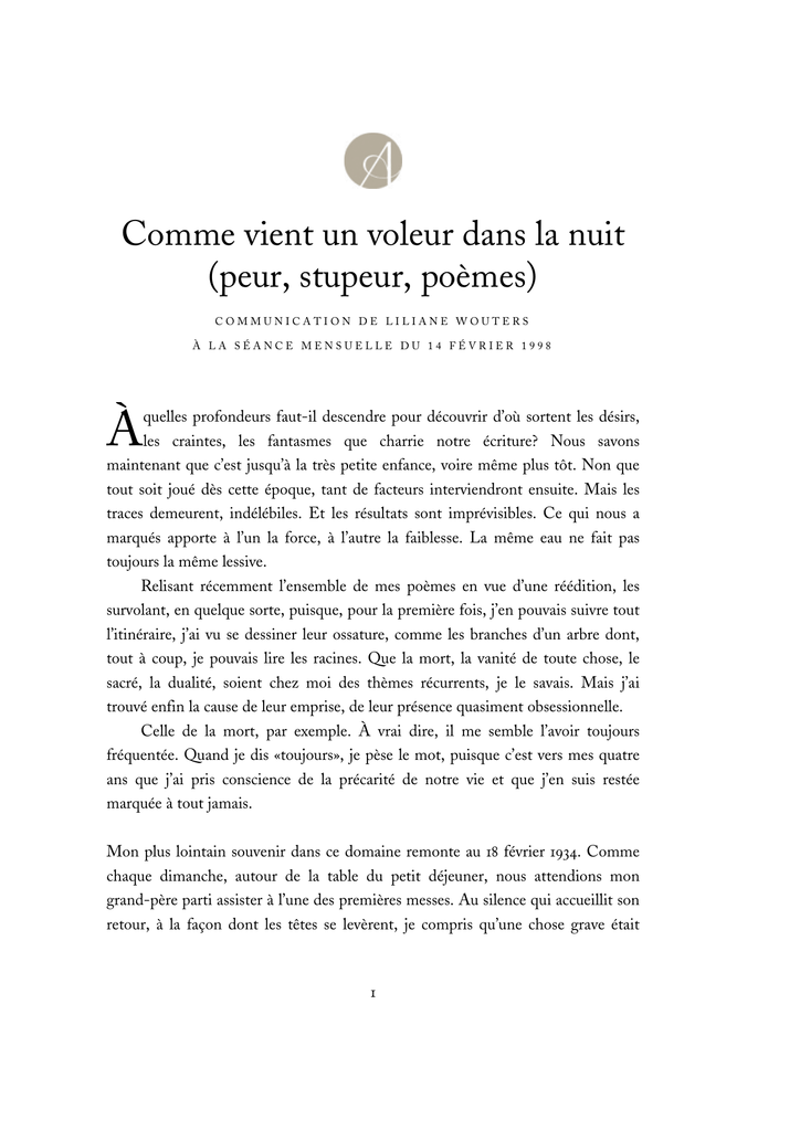 Comme vient un voleur dans la nuit (peur, stupeur, poèmes) COMMUNICATION DE LILIANE WOUTERS À LA SÉANCE MENSUELLE DU 14 FÉVRIER 1998 À quelles profondeurs faut-il descendre pour découvrir d’où sortent les désirs, les craintes, les fantasmes que charrie notre écriture? Nous savons maintenant que c’est jusqu’à la très petite enfance, voire même plus tôt. Non que tout soit joué dès cette époque, tant de facteurs interviendront ensuite. Mais les traces demeurent, indélébiles. Et les résultats sont imprévisibles. Ce qui nous a marqués apporte à l’un la force, à l’autre la faiblesse. La même eau ne fait pas toujours la même lessive. Relisant récemment l’ensemble de mes poèmes en vue d’une réédition, les survolant, en quelque sorte, puisque, pour la première fois, j’en pouvais suivre tout l’itinéraire, j’ai vu se dessiner leur ossature, comme les branches d’un arbre dont, tout à coup, je pouvais lire les racines. Que la mort, la vanité de toute chose, le sacré, la dualité, soient chez moi des thèmes récurrents, je le savais. Mais j’ai trouvé enfin la cause de leur emprise, de leur présence quasiment obsessionnelle. Celle de la mort, par exemple. À vrai dire, il me semble l’avoir toujours fréquentée. Quand je dis «toujours», je pèse le mot, puisque c’est vers mes quatre ans que j’ai pris conscience de la précarité de notre vie et que j’en suis restée marquée à tout jamais. Mon plus lointain souvenir dans ce domaine remonte au 18 février 1934. Comme chaque dimanche, autour de la table du petit déjeuner, nous attendions mon grand-père parti assister à l’une des premières messes. Au silence qui accueillit son retour, à la façon dont les têtes se levèrent, je compris qu’une chose grave était 1 arrivée. Immobile sur le pas de la porte, le visage aussi blanc que son col dur, il nous annonça l’incroyable nouvelle : «De koning is dood» (Le roi est mort). Et je fus stupéfaite de lui voir sur la joue couler une larme. Cette larme m’atteignit encore plus que l’événement. N’empêche que j’étais bien surprise. Ainsi, les rois mouraient. Même celui-là, que j’avais vu caracoler sur son cheval quelques semaines ou quelques mois auparavant. Certes, il m’avait paru presque aussi vieux que mon grand-père. Mourir, d’ailleurs, qu’est-ce que c’était? La foudre, ce jour-là, n’est pas tombée. Elle me frappa un peu plus tard, au même endroit, toujours en 1934, les informations reçues par la suite me l’ont confirmé. Il faisait beau, du moins le soleil brillait-il, jouant sur le carrelage de la cuisine, la cuisine, lieu sacré où, dans ce milieu, à cette époque, se concentraient toutes les activités diurnes familiales. J’y avais mon coin favori, où je m’asseyais sur un petit banc, de ceux qu’en Wallonie nous appelons passets, près de la table, souvent dessous, comme à l’abri d’un toit. Je trouvais là une sorte de sécurité, presque une cachette, d’où j’observais le va-etvient des grands, où je tentais de me faire oublier, le soir, quand venait le moment d’aller au lit. Ce jour-là, personne ne pensait à moi. Il était question d’une très jeune femme et je compris qu’elle venait de mourir. La mort, j’en avais maintenant acquis une vague idée. L’esprit montait au ciel, le corps restait sur terre, plus précisément dans celle-ci, de récentes promenades au cimetière d’Ixelles en compagnie de ma grand-mère m’avaient instruite de la chose, laquelle survenait fort tard, dans l’extrême vieillesse, autant dire jamais. Mais cette morte-là avait pris les devants. Autour de moi, tous évoquaient sa jeunesse, une toute fraîche maternité, les années qui, normalement, lui étaient dues, l’injustice d’une fin aussi brutale. Je m’informai : on pouvait donc mourir avant d’être un vieillard? On le pouvait. Les enfants aussi? Les enfants aussi. Même les bébés? Même les bébés. Je demeurai sans voix. Je sais qu’à ce moment ma vie a basculé. De stable, elle est devenue précaire, de solide, fragile, de sûre, incertaine. Je l’ignorais encore, mais l’angoisse existentielle venait d’y faire irruption. Je ne crois pas, depuis, m’être endormie une seule fois avec la certitude absolue de me réveiller. Même pas, non surtout pas, dans les moments heureux. 2 Pourtant, je ne crains pas la mort. Au fil du temps, non sans difficultés, je crois même l’avoir apprivoisée. Je n’ai d’ailleurs pas eu le choix, mon équilibre même était en jeu. J’imagine qu’en ce domaine la psychanalyse aurait son mot à dire. J’admets volontiers que le choc initial, ce traumatisme ressenti dans la plus tendre enfance, aurait pu me détruire pour toujours. D’autant plus qu’à l’école primaire que je fréquentais par la suite sévissait une redoutable religieuse. Plus hantée par nos fins dernières que par des préoccupations psychologiques, Sœur Agnès insufflait à ses élèves toutes les craintes imaginables, où dominaient, bien sûr, celles du péché et de la mort. Sans parler de l’enfer dont elle nous faisait voir sans cesse les portes sommées de deux mots répétés à l’infini, comme en l’église de Brou le sont Fortune et Infortune. Mais ici cela devenait : toujours, jamais. Toujours nous brûlerions dans la fournaise, jamais nous ne pourrions y échapper. Faut-il préciser qu’à plusieurs reprises certaines visions dantesques alimentèrent mes cauchemars d’enfant? Que, soixante ans plus tard, je revois clairement deux ou trois rêves récurrents, celui où je portais ma tête sur un plateau, tel, après son martyre, saint Expédit; celui où, dans un cimetière mis sens dessus dessous par les trompettes du Jugement dernier, je sortais du tombeau roussie, cornue et condamnée, sous l’œil réprobateur de Sœur Agnès. J’ai su, plus tard, que cette pythie passait pour une religieuse exemplaire, consacrant toute sa 