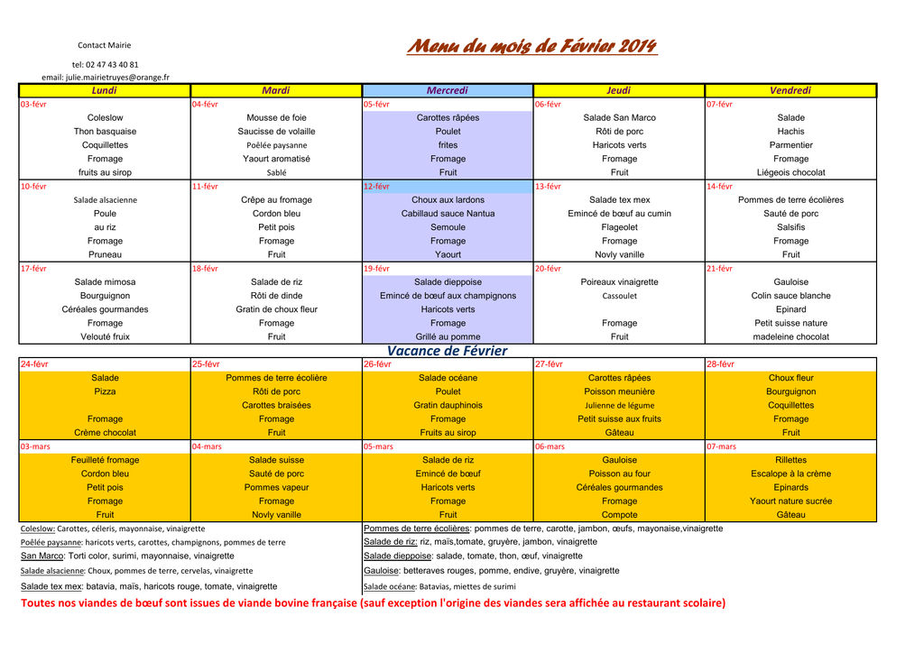 Menu du mois de Février 2014 Contact Mairie tel: 02 47 43 40 81 email: [email protected] Lundi 03-févr Mardi 04-févr Mercredi 05-févr Jeudi 06-févr Vendredi 07-févr Coleslow Mousse de foie Carottes râpées Salade San Marco Thon basquaise Saucisse de volaille Poulet Rôti de porc Hachis Coquillettes Poêlée paysanne frites Haricots verts Parmentier Fromage Yaourt aromatisé Fromage Fromage Fromage fruits au sirop 10-févr Fruit Sablé 11-févr 12-févr Salade Fruit 13-févr Liégeois chocolat 14-févr Salade alsacienne Crêpe au fromage Choux aux lardons Salade tex mex Pommes de terre écolières Poule Cordon bleu Cabillaud sauce Nantua Emincé de bœuf au cumin Sauté de porc au riz Petit pois Semoule Flageolet Salsifis Fromage Fromage Fromage Fromage Fromage Pruneau 17-févr Fruit 18-févr Yaourt 19-févr Salade mimosa Novly vanille 20-févr Fruit 21-févr Salade de riz Salade dieppoise Poireaux vinaigrette Gauloise Cassoulet Colin sauce blanche Bourguignon Rôti de dinde Emincé de bœuf aux champignons Céréales gourmandes Gratin de choux fleur Haricots verts Fromage Fromage Fromage Fromage Petit suisse nature Velouté fruix Fruit Grillé au pomme Fruit madeleine chocolat Epinard Vacance de Février 24-févr 25-févr 26-févr 27-févr 28-févr Salade Pommes de terre écolière Salade océane Carottes râpées Choux fleur Pizza Rôti de porc Poulet Poisson meunière Bourguignon Carottes braisées Gratin dauphinois Julienne de légume Coquillettes Fromage Fromage Fromage Petit suisse aux fruits Fromage Crème chocolat Fruit Fruits au sirop Gâteau 03-mars 04-mars 05-mars 06-mars Fruit 07-mars Feuilleté fromage Salade suisse Salade de riz Gauloise Rillettes Cordon bleu Sauté de porc Emincé de bœuf Poisson au four Escalope à la crème Petit pois Pommes vapeur Haricots verts Céréales gourmandes Epinards Fromage Fromage Fromage Fromage Yaourt nature sucrée Fruit Novly vanille Fruit Compote Gâteau Poêlée paysanne: haricots verts, carottes, champignons, pommes de terre Pommes de terre écolières: pommes de terre, carotte, jambon, œufs, mayonaise,vinaigrette Salade de riz: riz, maïs,tomate, gruyère, jambon, vinaigrette Coleslow: Carottes, céleris, mayonnaise, vinaigrette San Marco: Torti color, surimi, mayonnaise, vinaigrette Salade dieppoise: salade, tomate, thon, œuf, vinaigrette Salade alsacienne: Choux, pommes de terre, cervelas, vinaigrette Gauloise: betteraves rouges, pomme, endive, gruyère, vinaigrette Salade tex mex: batavia, maïs, haricots rouge, tomate, vinaigrette Salade océane: Batavias, miettes de surimi Toutes nos viandes de bœuf sont issues de viande bovine française (sauf exception l'origine des viandes sera affichée au restaurant scolaire)