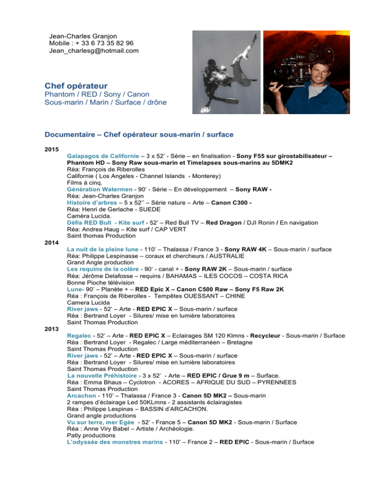 Jean-Charles Granjon Mobile : + 33 6 73 35 82 96 [email protected] Chef opérateur Phantom / RED / Sony / Canon Sous-marin / Marin / Surface / drône Documentaire – Chef opérateur sous-marin / surface 2015 Galapagos de Californie – 3 x 52’ - Série – en finalisation - Sony F55 sur girostabilisateur – Phantom HD – Sony Raw sous-marin et Timelapses sous-marins au 5DMK2 Réa: François de Riberolles Californie ( Los Angeles - Channel Islands - Monterey) Films à cinq. Génération Watermen - 90’ - Série – En développement – Sony RAW Réa: Jean-Charles Granjon Histoire d’arbres – 5 x 52’’ – Série nature – Arte – Canon C300 Réa: Henri de Gerlache - SUEDE Caméra Lucida. Défis RED Bull - Kite surf - 52’ – Red Bull TV – Red Dragon / DJI Ronin / En navigation Réa: Andrea Haug – Kite surf / CAP VERT Saint thomas Production 2014 La nuit de la pleine lune - 110’ – Thalassa / France 3 - Sony RAW 4K – Sous-marin / surface Réa: Philippe Lespinasse – coraux et chercheurs / AUSTRALIE Grand Angle production Les requins de la colère - 90’ - canal + - Sony RAW 2K – Sous-marin / surface Réa: Jérôme Delafosse – requins / BAHAMAS – ILES COCOS – COSTA RICA Bonne Pioche télévision Lune- 90’ – Planète + – RED Epic X – Canon C500 Raw – Sony F5 Raw 2K Réa : François de Riberolles - Tempêtes OUESSANT – CHINE Camera Lucida River jaws - 52’ – Arte - RED EPIC X – Sous-marin / surface Réa : Bertrand Loyer - Silures/ mise en lumière laboratoires Saint Thomas Production 2013 Regalec - 52’ – Arte - RED EPIC X – Eclairages SM 120 Klmns - Recycleur - Sous-marin / Surface Réa : Bertrand Loyer - Regalec / Large méditerranéen – Bretagne Saint Thomas Production River jaws - 52’ – Arte - RED EPIC X – Sous-marin / surface Réa : Bertrand Loyer - Silures/ mise en lumière laboratoires Saint Thomas Production La nouvelle Préhistoire - 3 x 52’ - Arte – RED EPIC / Grue 9 m – Surface. Réa : Emma Bhaus – Cyclotron - ACORES – AFRIQUE DU SUD – PYRENNEES Saint Thomas Production Arcachon - 110’ – Thalassa / France 3 - Canon 5D MK2 – Sous-marin 2 rampes d’éclairage Led 50KLmns - 2 assistants éclairagistes Réa : Philippe Lespinas – BASSIN d’ARCACHON. Grand angle productions Vu sur terre, mer Egée - 52’ - France 5 – Canon 5D MK2 - Sous-marin / Surface Réa : Anne Viry Babel – Artiste / Archéologie. Patly productions L’odyssée des monstres marins - 110’ – France 2 – RED EPIC - Sous-marin / Surface Choix, préparation et configuration de la solution de tournage sous-marin 5K - 7 gills sharks / Sardine run - AFRIQUE DU SUD – Cap town / East London - Silures – VAR – Lac de St Cassiens. - Cachalots – Fictionnage de la vie du personnage ( Fred Buyles) – ACORES – Fayal. - Back plates – AUVERGNE. - Requins blancs – MEXIQUE – îles Gaudalupe. - Regalec – LARGE MEDITERRANÉEN. - Requins baleines – PAPOUASIE INDONESIENNE. Réa : Bertrand Loyer – Saint Thomas Production. 2012 Biodiversité, or vert de Guyanne – 52’ – France 5 - Canon 5DMK2 – Surface / Helicoptère / pirogue Réa: Michel Huet – GUYANNE (Maripasula – Antekumpata – Cayenne – Saül – Oyapok – Maroni) MC4 production Mémoire du Rhône – 52’ - Canon 5DMK2 – Grue de 5m – Surface / embarqué sur voilier Réa: Philippe Crozier DDM production 2011 Mémoire de Volcan - 90’ – Arte - RED ONE - Travelling sur chariot - Surface / Sous-marin. Réa : Bertrand Loyer – Paysages – back plates - RDC ( Nord Kivu, Virunga ) - CANARIES ( El Hierro). Saint Thomas Production. 2008 Océans - 90’ – Sortie en salle – cadreur sous-marin making-off. Réa : Jacques Perrin, Jacques Cluzaud – Mission Galapagos. Fiction - Publicité - court métrage. 2015 Impact – film court - 2 Phantom Flex 4K surface et sous-marin – format vertical Réa : Jean-Charles Granjon Bluearth production – Vertical films Gian-pierro Bodino Jewels - Publicité Web - Sony RAW 2K sur poignée girostabilisée DGI Ronin. Réa : Stéphane Carcopino Agence Mazzarine / Malandrino (Italie) 2014 ème No Limit - 3 saison, 2 épisodes – TF1 - SONY RAW 2K – Sous-marin / Surface Europacorp télévision. Nabidji / Décathlon - Publicité Web avec Fabien Gillot- Sony RAW 2K – Sous-marin / Studio HVH Films 2013 Under – Court métrage – RED Epic monochrome - Sous-marin / Studio Aubertvillier. Réa : Kevin Frilet Human Films Petite blonde - Court Métrage – Canon 5D MK2 – Sous-marin. Réa : Emilie Aussel Schellak sud Ciccarelli Jewels - Publicité – RED EPIC – surface / Sous-marin / incrust. Réa : Jean-Charles Granjon - Scénographie : Jean-Charles Granjon - Valerie Ciccareli. Bluearth production 2012 No limit - épisode Pilote - série TV - TF1 - Canon 5D MK 2 Europacorp télévision. Narcose - court métrage – Chef électro sous-marin – milieu naturel au large de Marseille. Réa : Julie Gautier / Guillaume Nery. Expédition Titanic / Q Music – RTBF/WEB/Salles - Canon 5D MK 2 + Eclairages – Sous-marin 2 électro sous-marin Dr Film / Sud repérage Timberland – Publicité TV Canal + - RED ONE MX – Zoom Angénieux optimo. Assistant de Maurizio Tiella – chef opérateur. 2011 Naufragée – Court métrage / festivals – Sony Z7 – Sous-marin. Réa : Stéphane Carcopino Tusoli Affaires Etrangères – 90’ – Fiction TV – TF1 - Sony Z7 – Sous-marin / 3 bateaux / 3 doublures Chef opérateur sous-marin / régie marine / scénarisation – Casting doublures. Rea : Vincezon Marano Les films de l’Astre Equipements maîtrisés - Vision Research ( Phantom Flex 4K – HD – V642 – Miro 320 ). - RED ( Dragon – Epic – Scarlet ) / 4 ans d’expérience toutes situations - SONY ( F5 - F55 - FS700 : toutes en RAW ) / 2 ans d’expérience / toutes situations - Arri Alexa / Formé. - Canon C300 / 10 semaines de tournage en mer et sur terre. - DGI Ronin – poignée Girostabilisée - DGI Phantom drone. Equ
