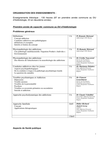 ORGANISATION DES ENSEIGNEMENTS : Enseignements théorique : 130 heures (87 en première année commune au DU d'Addictologie, 43 en deuxième année). Première année de capacité: commune au DU d'Addictologie Problèmes généraux Définitions 1h Addictologie CHU Rennes Concept addiction Conduites addictives non pathologiques définitions et exemples Intérêts et limites du concept Physiopathologie des addictions 1h 1h 3h 3h Dépression Trouble anxieux Troubles de la personnalité Psychose Troubles co-occurents primaires ou secondaires Suicide et addiction Approche psychodynamique des addictions Dr Marianne Delattre Pôle Addiction Précarité Centre Hospitalier Guillaume Régnier Aspects psychopathologiques De la conduite à risque à la pathologie psychiatrique lourde La question du cannabis Troubles psychiatriques et Addiction Dr Cécilia Naucziciel Service de Psychiatrie Hospitalo-universitaire Centre Hospitalier Guillaume Régnier Des théories de l'attachement à la neurobiologie des addictions Conduites addictives chez les jeunes Pr Romain Moirand Addictologie CHU Rennes Une pathologie multifactorielle: l'équation Produit x Individu x Environnement Physiopathologie des addictions Pr Romain Moirand Dr Clement Lozachmeur Service de Psychiatrie Hospitalo-universitaire Centre Hospitalier Guillaume Régnier 3h Dr Claude Védeilhié Envol Pôle Addiction Précarité Centre Hospitalier Guillaume Régnier Approche familiale 1h45 Concept Applications thérapeutiques Didier Richard Janick Leroy CSAPA Pôle Addiction Précarité Centre Hospitalier Guillaume Régnier 13h45 Aspects de Santé publique 1 Épidémiologie comparée des addictions 1h Guillaume Pavic CIRDD Rennes Addictions et travail Aspects réglementaires 1h30 Pr Christian Verger Centre anti-poison CHU Rennes Un exemple pratique de la prise en compte en MT : la démarche initiée à la ville de Rennes Addictions et justice 30mn Dr Marie D’Aguanno Médecin du Travail Ville de Rennes 2h Pr Mariannick Le Gueut Médecine Légale et Pénitenciaire – CHU Rennes Addictions – prévention 3h Plans gouvernementaux de lutte contre les addictions Principe de la prévention Aspects législatifs Comment mettre en place une action de prévention Ressources Sandrine Gillet et Laetitia Vinçont CIRDD Bretagne Rue du Gal Koenig Rennes ANPAA 35 Rennes 8h Approches spécifiques des substances psycho-actives Enjeu du sevrage tabagique 1h15 Conséquences somatiques de l’inhalation de fumée (+ cannabis) Bénéfices somatiques du sevrage Pharmacologie de la nicotine Dr Catherine de Bournonville Tabacologie CHU Rennes 2h Jacques Le Houezec tabacologue, consultant en Santé Publique Spécificité de la dépendance tabagique : exploration de la dépendance et de la maturation du projet d’arrêt 1h Échelles d'évaluation en tabacologie 1h Dr Catherine de Bournonville Tabacologie CHU Rennes Xavier Guillery Envol Pôle Addiction Précarité Centre Hospitalier Guillaume Régnier Métabolisme de l'alcool / alcoolémie 30mn Pr Romain Moirand Addictologie CHU Rennes Retentissement somatique de la consommation d'alcool 1h Pr Romain Moirand Addictologie CHU Rennes Formes cliniques de l'alcoolo-dépendance à partir de vignettes cliniques 1h Pr Romain Moirand Addictologie CHU Rennes 2 Produits illicites 2h Addiction et précarité Dr Philippe Le Ferrand Envol Pôle Addiction Précarité Centre Hospitalier Guillaume Régnier Syndrome de dépendance: clinique Conséquences psychiatriques 1h Dr Philippe Le Ferrand Envol Pôle Addiction Précarité Centre Hospitalier Guillaume Régnier Produits illicites 2h Infection par le VIH Jean Pierre Poras Pôle Addiction Précarité Centre Hospitalier Guillaume Régnier Effets spécifiques des différents produits opiacés stimulants hallucinogènes empathogènes cannabis médicaments détournés Conséquences somatiques Place des dosages Polyconsommations 30mn Dr Cédric Arvieux Maladies infectieurses CHU Rennes Hépatites virales 1h Réduction des risques 1h Pr Dominique Guyader Maladies du Foie CHU Rennes Dr Philippe le Ferrand Envol Pôle Addiction Précarité Centre Hospitalier Guillaume Régnier Troubles des conduites alimentaires 3h Dr Dominique Bligny Aspect nutritionnel CHP Saint Grégoire 35 Dr Françoise Chevalier-Latreuille Aspects psychiatriques Principes de prise en charge Réseau bassin rennais Jeu pathologique Equipe de liaison troubles des conduites alimentaires Centre Hospitalier Guillaume Régnier 1h30 Dr Claude Védeilhié Envol Pôle Addiction Précarité Centre Hospitalier Guillaume Régnier Délinquance et addiction 1h30 Dr Claude Védeilhié Envol Pôle Addiction Précarité Centre Hospitalier Guillaume Régnier Addictions et dopage 1h30 Médecine du sport CHU Rennes Le passage du dopage aux addictions Comment le prévenir Ressources Addictions et grossesse Toxicité des produits Comment aborder la consommation avec la femme enceinte Spécificité de la prise en charge Pr Pierre Rochcongar 1h30 Dr Chevallier Latreuille Envol Pôle Addiction Précarité Centre Hospitalier Guillaume Régnier 3 Alcool Autres toxiques Sexologie et addictions 1h15 Dr Florence Moirand Clinique Philae Pont Péan 25h15 Traitement des conduites addictives Principes de prise en charge intégrée de la dépendance 2h Addictologie CHU Rennes Principes de base Moyens thérapeutiques Indications Évaluation efficacité et suivi Pratique clinique: le premier entretien 3h Pr Romain Moirand Addictologie CHU Rennes Table ronde, jeux de rôle Processus de maturation : schéma de Prochaska Pr Romain Moirand 1h Xavier Guillery Envol Pôle Addiction Précarité Centre Hospitalier Guillaume Régnier Entretien motivationnel 2h15 Approche cognitivo-comportementale 3h Dr Cecilia Nauziciel CHGR Rennes Concepts Applications à la prise en charge des addictions Un manuel de TCC Laure-Anne Bernard pneumologue, tabacologue, CH Dinan Théorie Exercices pratiques 1h Pr Romain Moirand Addictologie CHU Rennes Intervention thérapeutique brèv