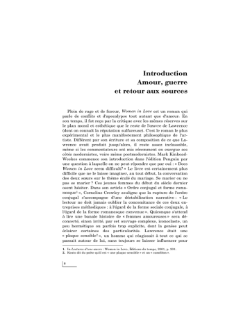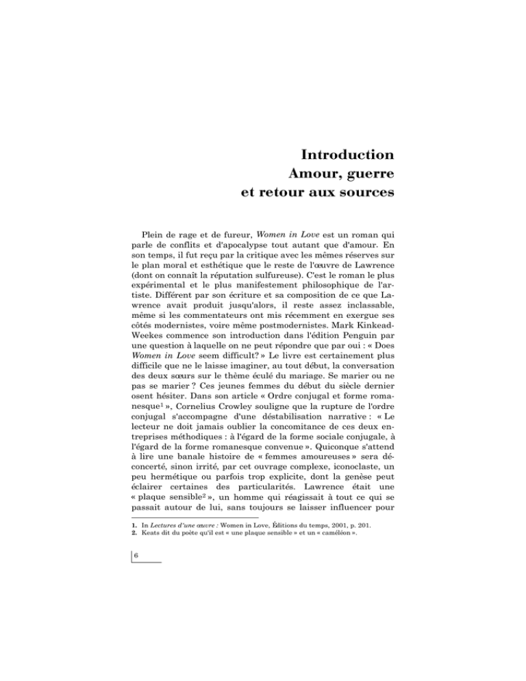 Introduction Amour, guerre et retour aux sources Plein de rage et de fureur, Women in Love est un roman qui parle de conflits et d'apocalypse tout autant que d'amour. En son temps, il fut reçu par la critique avec les mêmes réserves sur le plan moral et esthétique que le reste de l'œuvre de Lawrence (dont on connaît la réputation sulfureuse). C'est le roman le plus expérimental et le plus manifestement philosophique de l'artiste. Différent par son écriture et sa composition de ce que Lawrence avait produit jusqu'alors, il reste assez inclassable, même si les commentateurs ont mis récemment en exergue ses côtés modernistes, voire même postmodernistes. Mark KinkeadWeekes commence son introduction dans l'édition Penguin par une question à laquelle on ne peut répondre que par oui : « Does Women in Love seem difficult? » Le livre est certainement plus difficile que ne le laisse imaginer, au tout début, la conversation des deux sœurs sur le thème éculé du mariage. Se marier ou ne pas se marier ? Ces jeunes femmes du début du siècle dernier osent hésiter. Dans son article « Ordre conjugal et forme romanesque1 », Cornelius Crowley souligne que la rupture de l'ordre conjugal s'accompagne d'une déstabilisation narrative : « Le lecteur ne doit jamais oublier la concomitance de ces deux entreprises méthodiques : à l'égard de la forme sociale conjugale, à l'égard de la forme romanesque convenue ». Quiconque s'attend à lire une banale histoire de « femmes amoureuses » sera déconcerté, sinon irrité, par cet ouvrage complexe, iconoclaste, un peu hermétique ou parfois trop explicite, dont la genèse peut éclairer certaines des particularités. Lawrence était une « plaque sensible2 », un homme qui réagissait à tout ce qui se passait autour de lui, sans toujours se laisser influencer pour 1. In Lectures d'une œuvre : Women in Love, Éditions du temps, 2001, p. 201. 2. Keats dit du poète qu'il est « une plaque sensible » et un « caméléon ». 6 Introduction : Amour, guerre et retour aux sources autant. Écrit pendant la Première Guerre mondiale, ce roman reflète le chaos du monde et le tourbillon des idées de l'époque tourmentée pendant laquelle il fut conçu ; c'est pourquoi avant de l'étudier pas à pas, il est intéressant de rappeler les circonstances de son écriture et de le replacer dans son contexte culturel et idéologique. 1. De l'Arche d'Alliance à la vision apocalyptique Juste avant la guerre, en 1913, alors qu'il séjournait sur le lac de Garde, Lawrence commença à écrire un roman qu'il appela d'abord The Wedding Ring puis The Sisters. Dès avril de la même année, il définissait ainsi, en des termes purement éthiques, ce projet ambitieux qui allait lui valoir quelques problèmes avec la censure : « I am so sure that only through a readjustment between men and women, and a making free and healthy of the sex will [England] get out of her present atrophy [...] I do write because I want folk – English folk – to alter, and have more sense » (LI 544). Il ne s'agissait de rien moins que de changer la société, la condition première de cette petite révolution étant au niveau individuel une meilleure acceptation du corps et de la sexualité1. Il devait très largement cette foi et ce soudain désir de prosélytisme à sa rencontre avec Frieda von Richthofen, la femme d'un professeur de l'université de Nottingham, mère de trois enfants, avec qui il s'était enfui en 1912 et qu'il épousa en 1914. Frieda avait été, durant son premier mariage, la maîtresse d'Otto Gross2, un ancien disciple de Freud, anarchiste et libertaire, qui voyait dans la disparition de la famille patriarcale monogame et dans l'amour libre3 un moyen de sauver le monde. L'influence de Frieda sur la vie et sur l'œuvre de Lawrence à partir de Sons and Lovers fut déterminante. Les poèmes lyriques, par1. Quelques jours plus tard, il écrivait de nouveau dans une lettre à son ami et mentor Edward Garnett, comme pour se justifier d'écrire un roman d'amour : « I can only write what I feel pretty strongly about: and that, at present, is the relations between men and women. After all, it is the problem of today, the establishment of a new relation, or the readjustment of the old one, between men and women » (2 mai 1913, LI 546). 2. Sa sœur Else Jaffe avait également été la maîtresse de Gross. 3. Lawrence lui-même ne prône jamais l'amour libre. 7 Synthèse d'une œuvre : Women in Love fois teintés d'humour, du recueil Look! We Have Come Through! témoignent de la force de cette passion très orageuse mais durable, et du sentiment de transfiguration qu'éprouva Lawrence. Le « Manifeste » amoureux qu'il rédigea alors contient, comme le premier roman issu du projet initial, le symbole biblique de l'arc-en-ciel, gage d'alliance entre Dieu et les hommes après le Déluge – ou ici gage de paix malgré les conflits : we shall love, we shall hate, but it will be like music, sheer utterance, issuing straight out of the unknown the lightning and the rainbow appearing in us unbidding, unchecked, like ambassadors. (CP 268) Dans ses romans ou ses nouvelles de l'époque, les passions sont violentes et la paix difficile à atteindre. Au cours de ses pérégrinations à travers l'Allemagne, le Tyrol1, la Suisse et l'Italie, et après son retour en Angleterre où il se trouva bloqué par la guerre, Lawrence ne cessa de réviser son manuscrit. Le projet prit une telle ampleur qu'en janvier 1915, il décida de partager le livre en deux. L'un devint The Rainbow, l'autre Women in Love, deux romans finalement indépendants et de facture très différente, même s'ils ont en commun les personnages des deux sœurs Ursula et Gudrun Brangwen, le thème du mariage, celui de la laideur de l'Angleterre industrielle et un certain nombre de références bibliques ou de symboles. On peut considérer que The Rainbow s'inscrit encore dans la continuité du roman réaliste, 
