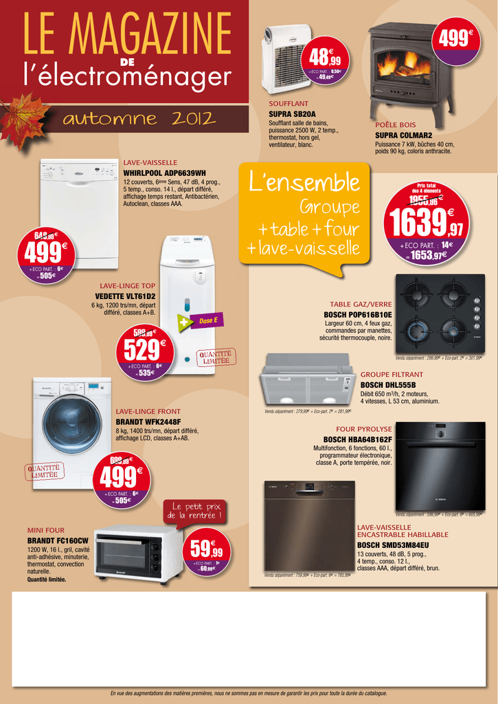 LE MAGAZINE € € l’électroménager DE + ECO PART. : = € € SOUFFLANT Soufflant salle de bains, puissance 2500 W, 2 temp., thermostat, hors gel, ventilateur, blanc. POÊLE BOIS Puissance 7 kW, bûches 40 cm, poids 90 kg, coloris anthracite. LAVE-VAISSELLE 12 couverts, 6ème Sens, 47 dB, 4 prog., 5 temp., conso. 14 l., départ différé, affichage temps restant, Antibactérien, Autoclean, classes AAA. € € € + ECO PART. : € = + ECO PART. : = € € € € LAVE-LINGE TOP TABLE GAZ/VERRE 6 kg, 1200 trs/mn, départ différé, classes A+B. + Dose E € € Largeur 60 cm, 4 feux gaz, commandes par manettes, sécurité thermocouple, noire. Vendu séparément : 299,99€ + Eco-part. 2€ = 301,99€ + ECO PART. : = € GROUPE FILTRANT € Débit 650 m3/h, 2 moteurs, 4 vitesses, L 53 cm, aluminium. LAVE-LINGE FRONT Vendu séparément : 279,99€ + Eco-part. 2€ = 281,99€ FOUR PYROLYSE 8 kg, 1400 trs/mn, départ différé, affichage LCD, classes A+AB. Multifonction, 6 fonctions, 60 l., programmateur électronique, classe A, porte tempérée, noir. € € + ECO PART. : = € € Vendu séparément : 599,99€ + Eco-part. 6€ = 605,99€ LAVE-VAISSELLE ENCASTRABLE HABILLABLE MINI FOUR € 1200 W, 16 l., gril, cavité anti-adhésive, minuterie, thermostat, convection naturelle. Quantité limitée. 13 couverts, 48 dB, 5 prog., 4 temp., conso. 12 l., classes AAA, départ différé, brun. + ECO PART. : € = € Vendu séparément : 759,99€ + Eco-part. 6€ = 765,99€ En vue des augmentations des matières premières, nous ne sommes pas en mesure de garantir les prix pour toute la durée du catalogue. LAVE-LINGE FRONT LAVE-LINGE TOP € € + ECO PART. : = € € + ECO PART. : = 6 kg, 1200 trs/mn, classes A+B, capacité variable automatique, conso/an 10670 l. / 197 kWh, L60 x P60 x H85 cm. € € = 5 kg, 1000 trs/mn, classes A+AC, 15 prog., capacité variable auto., départ différé 19 h, conso/an 8195 l. 169 kWh, L40 x P60 x H85 cm. € € 12 couverts, 48 dB, 6 programmes, 4 températures, classes AAA, départ différé, conso/an 2640 l. - 231 kWh, L60 x P60 x H85 cm. € € = € € 12 couverts, 48 dB, 5 programmes, 4 températures, classes AAA, départ différé, conso/an 3640 l. - 307 kWh, L60 x P61 x H85 cm. € € = 7 kg, 1400 trs/mn, classes A+AB, capacité variable automatique, 8 programmes, départ différé, affichage du temps restant, conso 49 l., L60 x P54 x H85 cm. € + ECO PART. : € + ECO PART. : € € = 6 kg, 1200 trs/mn, classes AAC, 15 prog., départ différé 19 h, capacité variable automatique, arrêt cuve pleine, conso/an 9280 l. - 173 kWh, L40 x P60 x H85 cm. € + ECO PART. : + ECO PART. : € € 6 kg, 1400 trs/mn, classes A++AB, capacité variable automatique, 16 programmes, départ différé 9 h, conso/an 10780 l. / 173 kWh, L59 x P55 x H85 cm. = 5,5 kg, 1100 trs/mn, classes A+AC, 18 prog., capacité variable auto., 6ème Sens, départ différé 1-12 h, conso. 49 l. - 0,93 kWh, L40 x P60 x H90 cm. € + ECO PART. : + ECO PART. : € + ECO PART. : € € = 6 kg, 1200 trs/mn, classes AAB, capacité variable automatique, départ différé, programmateur électronique conso. 42 l. + ECO PART. : = € € € = LAVE-VAISSELLE € 7 kg, 1200 trs/mn, classes A+B, 17 prog., départ différé 3-6-9 h, capacité variable automatique, conso/an 9600 l. - 224 kWh, L40 x P60 x H85 cm. € + ECO PART. : = € + ECO PART. : € € 13 couverts, 47 dB, 7 prog., 6 temp., classes A++AA, départ différé, affichage du temps restant, synchro. heures creuses, panier sup. réglable, conso/an 2790 l. - 262 kWh, L60 x P60 x H85 cm. € € = € € 12 couverts, 48 dB, 4 programmes, 4 températures, classes A+A, départ différé, affichage du temps restant, panier sup. réglable, conso/an 3653 l. - 290 kWh, L60 x P60 x H82/85 cm. En vue des augmentations des matières premières, nous ne sommes pas en mesure de garantir les prix pour toute la durée du catalogue. + € € € + ECO PART. : € = + ECO PART. : € 7 kg, 1400 trs/mn, classes A++AB, capacité variable automatique, fin différée, affichage du temps restant, conso/an 8140 l. - 174 kWh, dim. L59,8 x P55 x H85 cm. € € € = 7 kg, 1200 trs/mn, classes A+AB, capacité variable automatique, fin différée, affichage du temps restant, L60 x P59 x H84,8 cm. € = + ECO PART. : € 8 kg, 1200 trs/mn, classes A+++AB, capacité variable automatique, 17 programmes, départ différé 24 h, affichage du temps restant, Dose-e, conso/an 11000 l. - 196 kWh, L59 x P55 x H85 cm. € € = € 11 kg, 1200 trs/mn, classes A+AB, 15 prog., départ différé, affichage du temps restant, Dreamspace, programmateur 6ème Sens, conso. 86 l., L69 x P79 x H97 cm. € + ECO PART. : € = € Micro-ondes gril, 20 l., 800 W, gril 1000 W, électronique, 5 niveaux de puissance, L44 x P32,8 x H25,8 cm. Existe en noir GE2030B. € + ECO PART. : = € € € + ECO PART. : = 6 kg, 1200 trs/mn, classes AAB, 11 prog., capacité variable auto., départ différé, conso/an 8790 l. - 192 kWh, L40 x P60 x H85 cm. € € € 6 kg, 1300 trs/mn, classes A+++AB, capacité variable auto., arrêt cuve pleine, départ différé 19 h, conso/an 9199 l. - 153 kWh, L40 x P60 x H85 cm. + ECO PART. : € = € Micro-ondes solo, 23 l., 800 W, électro-mécanique, cavité céramique émaillée, 6 niveaux de puissance, L49 x P37,4 x H28 cm. € € + ECO PART. : € + ECO PART. : = = € + ECO PART. : € = € € € 13 couverts, 44 dB, 5 programmes, 5 températures, classes A++A, départ différé, affichage du temps restant, panier sup. réglable, conso/an 1680 l. - 262 kWh, L60 x P60 x H84,5 cm. 60 x 60 cm, 3 gaz + 1 élec., allumage électronique intégré, four 50,4 l., pyrolyse, multifonction, porte froide, minuteur, thermocouple, maintien au chaud, classe A, L60 x P62 x H85 cm. 60 x 60 cm, 4 gaz, allumage électronique, sécurité thermocouple, four gaz 54 l., convection naturelle, catalyse, gril électrique, tournebroche, L60 x P60 x H85 cm. 