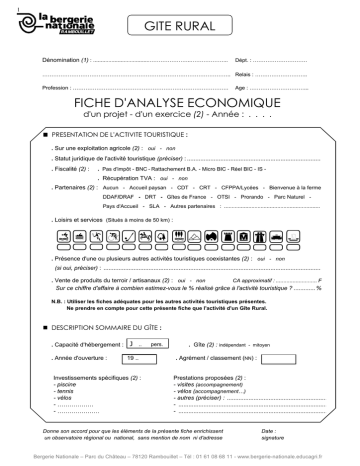 1 GITE RURAL Dénomination (1) : .....................................…………………..………………... Dépt. : ………………………… ………………………………………………………………………………………….. Relais : ……………………….. Profession : ………………………………………………………………………….. Age : …………………………... FICHE D'ANALYSE ECONOMIQUE d'un projet - d'un exercice (2) - Année : . . . . PRESENTATION DE L'ACTIVITE TOURISTIQUE : . Sur une exploitation agricole (2) : oui - non . Statut juridique de l'activité touristique (préciser) : ................................................................................ . Fiscalité (2) : . Pas d'impôt - BNC - Rattachement B.A. - Micro BIC - Réel BIC - IS . Récupération TVA : oui - non . Partenaires (2) : Aucun - Accueil paysan - CDT - CRT - CFPPA/Lycées - Bienvenue à la ferme DDAF/DRAF - DRT - Gîtes de France - OTSI - Prorando - Parc Naturel Pays d'Accueil - SLA - Autres partenaires : ............................................................... . Loisirs et services (Situés à moins de 50 km) : . Présence d'une ou plusieurs autres activités touristiques coexistantes (2) : oui - non (si oui, préciser) : .................................................................................................................................. . Vente de produits du terroir / artisanaux (2) : oui - non CA approximatif : ........................... F Sur ce chiffre d'affaire à combien estimez-vous le % réalisé grâce à l'activité touristique ? ............. % N.B. : Utiliser les fiches adéquates pour les autres activités touristiques présentes. Ne prendre en compte pour cette présente fiche que l'activité d'un Gîte Rural. DESCRIPTION SOMMAIRE DU GÎTE : . Capacité d'hébergement : . Année d'ouverture : J .. 19 .. Investissements spécifiques (2) : - piscine - tennis - vélos - ……………… - ………………… pers. . Gîte (2) : indépendant - mitoyen . Agrément / classement (NN) : Prestations proposées (2) : - visites (accompagnement) - vélos (accompagnement…) - autres (préciser) : ................................................................ - ................................................................................................ - ................................................................................................ Donne son accord pour que les éléments de la présente fiche enrichissent un observatoire régional ou national, sans mention de nom ni d'adresse Date : signature Bergerie Nationale – Parc du Château – 78120 Rambouillet – Tél : 01 61 08 68 11 - www.bergerie-nationale.educagri.fr 2 INVESTISSEMENT ET FINANCEMENT I - COUT DES INVESTISSEMENTS en €.TTC (3) ET AMORTISSEMENT. Ne prendre en compte que les investissements liés au Gîte Rural étudié, donc le surcoût occasionné par la création de l'activité. Certains investissements (ex. piscine) sont à estimer au prorata de l'utilisation pour le gîte. L'amortissement annuel (coût réel investissement divisé par la durée) n'est pas à prendre en compte si le poste est déjà amorti. • Achat terrain/bâti pour l'activité concernée (2) oui - non (si oui, reporter la valeur dans la catégorie Gros œuvre) Nature Année Par qui ? (4) Coût réel Investissement Amortissement Durée Montant / an Gros œuvre, Toiture, VRD (5) 20 ans Aménagements extérieurs (6) 10 ans Deuxième œuvre (7) 10 ans Equipements spécifiques (8) 5 à 10 ans Travaux de finition (9) 5 ans Mobilier de base (10) 10 ans Electroménager et divers (11) 5 ans dont piscine : ………………………….€ A Total B Total tennis : ……………………..…….€ € € ……………………………………. € II - FINANCEMENT . Autofinancement : ............................... € . Subventions : ............................... € . Total emprunts : ............................... € € TOTAL ( = à total A) III - REMBOURSEMENT EMPRUNT Capital et Frais financiers (12) Année Durée Remboursement capital Taux Frais financiers Emprunt 1................................ ........... ............................ .......... ........................... ....... .......................... ............................... Emprunt 2 .......... ........................... ....... .......................... ............................... .......... Montant ............................ Emprunt 3................................ ........... ............................ .......... ........................... ....... (les annuités D sont les remboursements annuels des emprunts, ne représentant qu'une partie du financement) Totaux Total annuités .......................... ............................... C D € IV - CHARGES D'INVESTISSEMENT . Amortissement annuel : B . Frais financiers annuels : C € € E . Total des charges d'investissement (B + C) = € (Les charges d'investissement E sont le reflet annuel de l'ensemble du coût de l'investissement) € 3 GITE RURAL Dénomination (1) : .....................................…………………..……………….…………………………………………… CHARGES DE FONCTIONNEMENT V - CHARGES FIXES ou charges de structure affectables à l'activité du Gîte, hors charges d'investissement Chiffres réels ou estimés en €. TTC. (3). A) FRAIS POUR SERVICES EXTERIEURS : - Assurances : incendie, tempête, R.C, etc. ..................................... ............................... € - Publicité, promotion, cotisations ..................................................... ............................... € - Bureau : téléphone, papeterie spécifique, courrier... ..................... ............................... € - Transport et déplacement............................................................... ............................... € - Autres : 