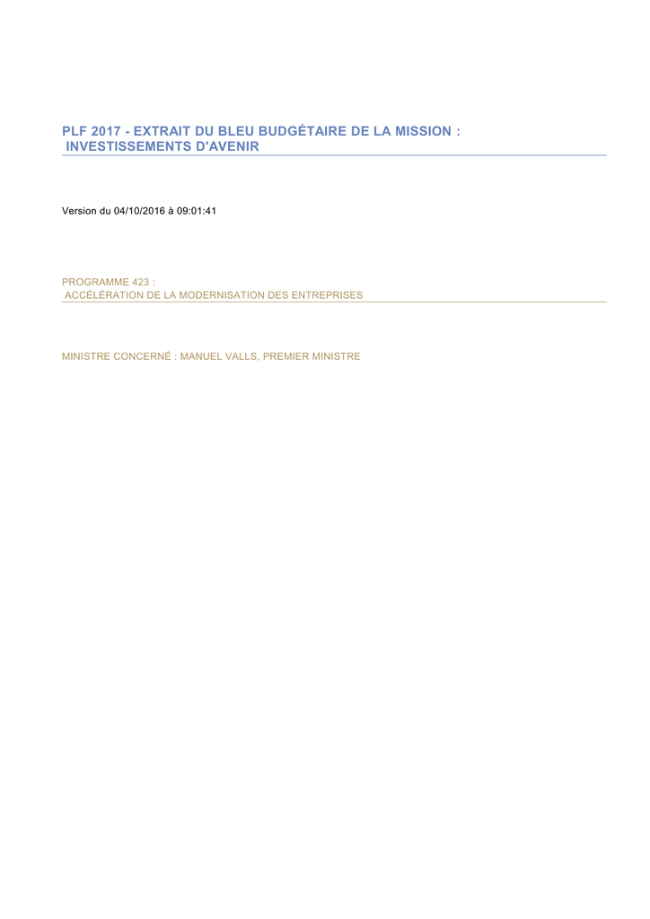 PLF 2017 - EXTRAIT DU BLEU BUDGÉTAIRE DE LA MISSION : INVESTISSEMENTS D'AVENIR Version du 04/10/2016 à 09:01:41 PROGRAMME 423 : ACCÉLÉRATION DE LA MODERNISATION DES ENTREPRISES MINISTRE CONCERNÉ : MANUEL VALLS, PREMIER MINISTRE TABLE DES MATIÈRES Programme 423 : Accélération de la modernisation des entreprises Présentation stratégique du projet annuel de performances Objectifs et indicateurs de performance Présentation des crédits et des dépenses fiscales Justification au premier euro 3 5 8 10 3 PLF 2017 Accélération de la modernisation des entreprises P ROJET ANNUEL DE PERFORMANCES Programme n° 423 PRÉSENTATION STRATÉGIQUE DU PROJET ANNUEL DE PERFORMANCES Louis SCHWEITZER Commissaire général à l’investissement Responsable du programme n° 423 : Accélération de la modernisation des entreprises La nécessité de conduire une montée en gamme de l’offre de l’industrie française pour gagner en compétitivité n’est plus à démontrer. Elle suppose un effort considérable et continu de productivité, d’innovation, de qualité et de service. Cet effort, engagé dans le cadre du PIA 1 et 2, doit être poursuivi et amplifié dans le cadre du PIA 3. La triple nécessité (i) de poursuivre l’adaptation des entreprises française aux mutations de l’environnement économique global – en particulier la montée en puissance de l’économie numérique ; (ii) de renforcer la compétitivité de l’industrie nationale par rapport à ses principaux concurrents ; (iii) de maintenir une base industrielle ancrée sur le territoire national, qui est une condition nécessaire du maintien et de la croissance de l’emploi, impose la poursuite, le renforcement et l’adaptation, dans le cadre du PIA 3, des actions engagées en faveur des entreprises dans les PIA 1 et 2. Si la compétitivité de l’industrie demeure un facteur déterminant de croissance économique, elle dépend des autres secteurs de l’économie, des services et de l’énergie en particulier, mais aussi des infrastructures sous-jacentes, qui, par leurs innovations, contribuent au renforcement de la compétitivité de l’économie nationale. Au sein du PIA 3, les actions en faveur des entreprises doivent désormais être plus nettement élargies au domaine des services, qui représente une part croissante de la valeur ajoutée nationale. Les priorités stratégiques poursuivies par les PIA 1 et 2 ne sont pas remises en causes dans le cadre du PIA 3 : la transition énergétique et écologique restera un défi pour le pays, les technologies numériques un vecteur de transformation de l’économie et de la société, la santé une aspiration profonde de nos concitoyens et un gisement économique important pour notre pays, les transports un secteur stratégique largement affecté par la numérisation de l’économie, la ville intelligente une nécessité en France comme dans le monde du fait de l’accroissement de la population urbaine. A côté de ces domaines issus du PIA 1 et 2, les secteurs des industries culturelles, du tourisme, de l’agro-alimentaire, de la construction ou encore de la silver économie sont des secteurs majeurs de l’économie nationale qui ont peu ou partiellement bénéficié du PIA 1 et 2 mais qui ont vocation à faire l’objet d’une attention plus particulière dans le cadre du PIA 3. Le PIA 3 dans le domaine de l’industrie et des services se propose d’accompagner les entreprises dans leurs réponses aux grands défis économiques auxquels elles sont confrontées : innovation, investissement, évolution des modèles d’affaires, structuration des filières, internationalisation, renforcement de la qualification des salariés. Chacun de ces défis économiques est le vecteur d’une action du PIA 3. La globalité de ces actions ne signifie pas uniformité d’approche, puisque, au sein de chacune de ces actions, les spécificités de chaque secteur seront pleinement reconnues, notamment dans le cadre d’appels à projets dédiés. TABLEAU DES INTERVENTIONS DES DIFFERENTS OPERATEURS PIA ET GRANDES LIGNES DES CONVENTIONS OU AVENANTS QUI LIERONT L’ÉTAT ET LES OPÉRATEURS Opérateurs Subventions Dotations décennales Avances remboursables Prises de participation Total AE CDC 100 000 000 900 000 000 1 000 000 000 Bpifrance 900 000 000 650 000 000 1 400 000 000 2 950 000 000 4 PLF 2017 Accélération de la modernisation des entreprises Programme n° 423 P ROJET Opérateurs ADEME ANNUEL DE PERFORMANCES Subventions 100 000 000 Dotations décennales Avances remboursables Prises de participation 50 000 000 Total AE 150 000 000 Outre les objectifs stratégiques du programme, les conventions qui lieront l’État à la Caisse des dépôts et consignations, à Bpifrance et l’ADEME préciseront : - la composition des comités de pilotage qui superviseront le processus de sélection des projets et le travail des comités d’experts.Les comités de pilotage proposeront les décisions d’engagement, qui seront transmises pour décision formelle du Premier ministre sur avis du Commissaire général à l’investissement. Ils coordonneront les opérations de suivi des projets sélectionnés, en lien avec la Caisse des dépôts et consignations et les porteurs de projets ; - le rôle de la Caisse des dépôts et consignations, de Bpifrance et de l’ADEME, en charge notamment du suivi administratif et financier des ressources et des conventions de subvention conclues avec les porteurs de projets ainsi que du versement des subventions à leur profit. RÉCAPITULATION DES OBJECTIFS ET INDICATEURS DE PERFORMANCE OBJECTIF 1 Accélérer la croissance des PME et des ETI INDICATEUR 1.1 Taux de pérennité des entreprises soutenues INDICATEUR 1.2 Chiffre d'affaires à l'export des entreprises soutenues par rapport à celui des entreprises françaises INDICATEUR 1.3 Pour information : investissements en capital innovation en proportion du PIB INDICATEUR 1.4 Pour information : progressi