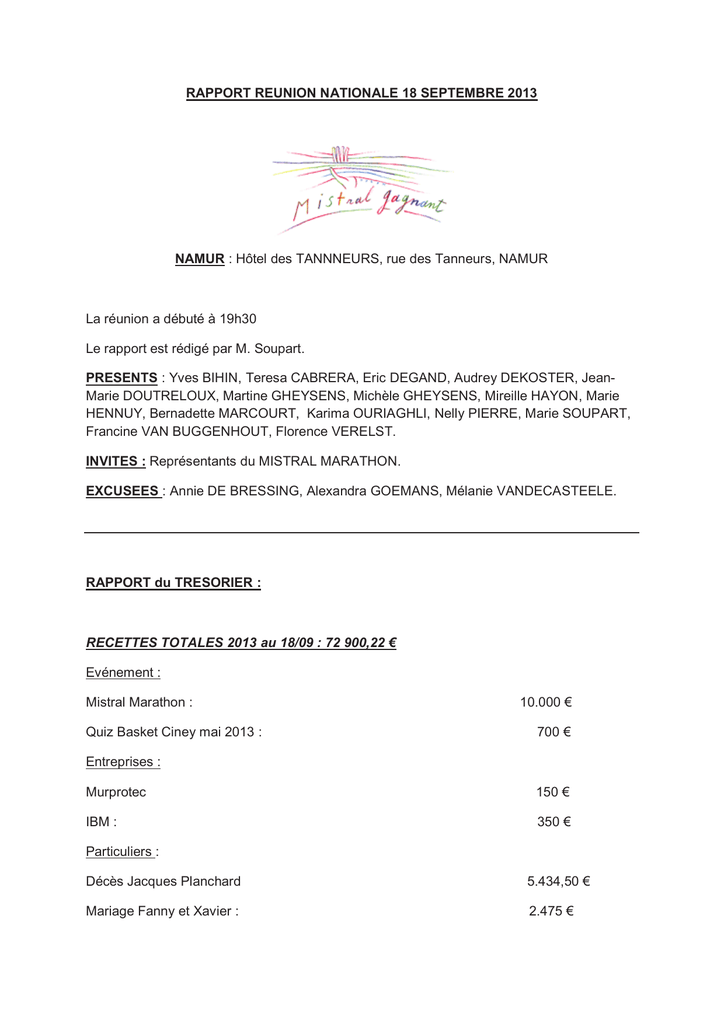 RAPPORT REUNION NATIONALE 18 SEPTEMBRE 2013 NAMUR : Hôtel des TANNNEURS, rue des Tanneurs, NAMUR La réunion a débuté à 19h30 Le rapport est rédigé par M. Soupart. PRESENTS : Yves BIHIN, Teresa CABRERA, Eric DEGAND, Audrey DEKOSTER, JeanMarie DOUTRELOUX, Martine GHEYSENS, Michèle GHEYSENS, Mireille HAYON, Marie HENNUY, Bernadette MARCOURT, Karima OURIAGHLI, Nelly PIERRE, Marie SOUPART, Francine VAN BUGGENHOUT, Florence VERELST. INVITES : Représentants du MISTRAL MARATHON. EXCUSEES : Annie DE BRESSING, Alexandra GOEMANS, Mélanie VANDECASTEELE. RAPPORT du TRESORIER : RECETTES TOTALES 2013 au 18/09 : 72 900,22 € Evénement : Mistral Marathon : Quiz Basket Ciney mai 2013 : 10.000 € 700 € Entreprises : Murprotec 150 € IBM : 350 € Particuliers : Décès Jacques Planchard 5.434,50 € Mariage Fanny et Xavier : 2.475 € Josyane Astori . 5.000 € DEPENSES TOTALES 2013 au 18/09 : 65 626,97 € Rêves : 3 rêves Disney : 1.256,40 € Rêve Olivier (voilier) : 1.000 € Rêve Semi 714 949,54€ Rêve Guillaume Cabane : 4.209,47 € Rêve Mathis Rihanna + rêve Legoland 1.125,96€ Rêve Yen chambre chevalier 1.128,90 € Frais généraux Divers routes et fournitures Belgacom : 666,16 € 71,30 € RESULTAT : +7.273,25 € RAPPORT ANTENNE LIEGE-NAMUR Rêve réalisé : 768 : Olivier : est parti en Croatie du 29 juin au 6 juillet pour une croisière sur un voilier. Tout s’est bien passé. Nous attendons toujours des nouvelles et des photos. Rêves en attente : 745 : Keljanah : Nous avons eu un contact avec la responsable de la maison de disque (Indochine) ; la rencontre devrait être possible en octobre 2013 750 : Berkan : Voudrait rencontrer Lionel Messi à Barcelone : transmis à Make a Wish 767 : Bryan : Chambre Méga blocks. Le projet pour la chambre avance. Un nouveau devis va être réalisé. 777 : NADIA : Aimerait recevoir une tablette Divers : Marie H s’est rendue avec Françoise Héger ce mardi 17 septembre au Rotary d’Andenne pour présenter MG dans le cadre du prochain rallye Roses des Sables. Le parrainage est relancé pour soutenir MG ainsi que les deux dames qui participeront au rallye. Le blind test au profit de MG aura lieu le 15 mars 2014 à Huy. La vente de chocolats Galler va reprendre à St Quirin. RAPPORT ANTENNE BRUXELLES Rêves réalisés : 719 : GUILLAUME : désirait une cabane dans les arbres 755 : GUILLAUME : Voulait aller à Legoland au Danemark 771 : JENNE : Désirait un lit chevalier Rêves en attente 735 : MYRIAM : Voudrait réaliser un CD pour sa maman dans un studio d’enregistrement. 736 : VALENTIN : Voudrait se rendre à Disneyland Floride. En attente pour raison de santé. 743 : ADIL : Voudrait se rendre sur les lieux du tournage d’un film. Proposition d’un nouveau tournage. Plusieurs pistes sont évoquées. 751 : ISABELLE : Voudrait soigner les animaux dans un centre hospitalier pour animaux en Afrique. Aurore doit se faire opérer pendant les grandes vacances 2013. Rêve postposé. 763 : AYMERIC : Rencontrer Mme Mercotte et faire de la pâtisserie. Mme Mercotte s’est retractée. On contacte un autre patissier 775 : BRYAN : Rêve d’un ordinateur Jugernaut V2 pour faire des vidéo sur Youtube. 773 : MAXIME : Disneyland Paris 774 : AYOUB : Voiture recevoir une voiture électronique « Cars » de Disney Nouveaux rêves : ??? : PALOMA : 2 ans : trop jeune, ne répond pas aux critères ??? : LIZA-MARIE : 2 ans : trop jeune : Ne répond pas aux critères ??? : MOHSSINE : rêve sera transmis à Make-a-Wish. Divers : Soirée Mistral Gagnant : 16 novembre 2014 au Brussels Lawn Tennis Club, chée de Waterloo, 1180 à Uccle. (nombre de places limités) : PAF : 35,00 € à verser au compte IBAN BE92 8270 8254 0023 avec la mention « soirée du 16 novembre et noms des participants » RAPPORT ANTENNE LUXEMBOURG : Rêves en attente 753 : Elia : rêve d’aller à Disneyland Paris. Le rêve est reporté et se fera en septembre 2014. 769 : Baptiste : Disneyland Paris avec toute sa famille. 772 : Nicolas : rêve d’une chasse aux trésors. On attend le feu vert des parents. 778 : Renaud : Disneyland Paris Divers : Nous avons reçu une invitation de TV LuX le 15 juin pour un reportage sur un enfant malade dont le rêve a été réalisé par Mistral Gagnant. Mathias avait assisté à l’émission « C’est pas sorcier » et avait rencontré Jamy. Le Mistral Marathon s’est déroulé le 20 juillet à Halanzy. Des membres du Mistral Marathon seront présents lors de la prochaine réunion. Le 15 septembre, certaines d’entre nous ont participé à la marche de 5 kms à Messancy organisée par le foot en salle (souvenir d’Eva) RAPPORT ANTENNE HAINAUT : Rêves réalisés : 758 . MOHAMED AMINE : A été Disneyland Paris fin août 2013. 765 : MATHYS : A été au concert de Rihanna fin juillet 2013 au Grand Stade de Lille. Rêves en attente 716 : LUCA : Voudrait aller à NY avec toute sa famille. Le voyage était prévu à NYC du 26 au 29 juillet 2013. Vu son état de santé actuel qui s’est aggravé, il doit postposer son voyage. Le montant avancé par les parents pour la participation a été remboursé. 748 : BRANDON : Voir un match de catch à NY et y rencontrer son idole. Ai pris contact avec la secrétaire de son médecin traitant qui confirme qu’il VEUT à tout prix aller à NY voir ses idoles et ce malgré son état de santé alarmant. J’ai reçu l’autorisation médicale signée mais le médecin signale uniquement que Brandon est soigné en oncologie ! Je me renseigne auprès de notre contact aux EU pour connaître les prochaines dates des combats de ses idoles. 756 : ANTHONY : Rencontrer Lionel Messi. Le rêve est transmis chez Make-a-wish.. 764 : ROMANE : Frédérique a rencontré Romane, elle voudra sans doute partir en Floride voir les dauphins en 2014. 776 : FIONA : Voudrait faire du shopping à Barcelone avec sa Maman et sa cousine. Elles partent les 23, 24 et 25 septembre 2013. La prochaine réunion se tiendra à Namur, Centre A