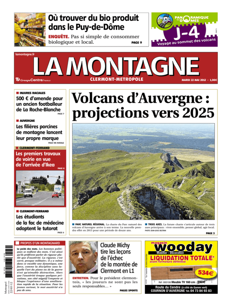 Où trouver du bio produit dans le Puy-de-Dôme m Voyage au so 084273 J-4 ENQUÊTE. Pas si simple de consommer biologique et local. PAGE 9 ans met des volc LAMONTAGNE lamontagne.fr CLERMONT-METROPOLE ■ INJURES RACIALES 500 € d’amende pour un ancien footballeur de La Roche-Blanche PAGE 7 ■ AUVERGNE MARDI 22 MAI 2012 - 1,00€ Volcans d’Auvergne : projections vers 2025 Les filières porcines de montagne lancent leur propre marque PAGE VIE RURALE ■ CLERMONT-FERRAND Les premiers travaux de voirie en vue de l’arrivée d’Ikea PAGE 8 ■ CLERMONT-FERRAND 22/05/12 ISSN 2109-1560 Metropol Le poids des mots. Les hommes politi ques se méfient des mots. C’est ainsi qu’ils préfèrent parler de rigueur plu tôt que d’austérité. La rigueur, c’est carré, presque militaire ; il y a même dans ce vocable une dynamique, une force, comme la discipline sans la quelle l’art du piano ou de la guerre n’est qu’aimable distraction. Alors que l’austérité évoque quelques pri vations, son côté négatif l’emporte et bloque l’espérance d’une améliora tion rapide de la situation. Pour les jeunes surtout, le mot austérité n’a pas de sens. Claude Michy tire les leçons de l’échec de la montée de Clermont en L1 ENTRETIEN. Pour le président clermon tois, « les joueurs ne sont pas les seuls responsables… » PAGES SPORTS ■ TROIS AXES. La future charte s’articule autour de trois axes principaux : vivre ensemble, penser global, agir local. PHOTO JEAN-LOUIS BELTRAN PAGE 3 wooday magasin Mobilier - Décoration LIQUIDATION TOTALE* avant fermeture définitive 534 Réf. 000106 Meuble TV 160 cm : 890 Route du Cendre (à côté de Gamm vert) COURNON D’AUVERGNE Tél. 04 73 84 93 83 N° arrêté préfectoral 2012/15 M 0394 1,00 EUR ■ PROPOS D’UN MONTAGNARD volcans d’Auvergne arrive à son terme. La nouvelle pren dra effet en 2013 pour une période de douze ans. *Sur l’ensemble des stocks disponibles PAGE 6 ■ PARC NATUREL RÉGIONAL. La charte du Parc naturel des 059162 Les étudiants de la fac de médecine adoptent le tutorat 2 MARDI 22 MAI 2012 LA MONTAGNE D É C O U V E R T E . J e t ez - v o u s à l’eau ! Auvergne Nouveau Mon de propose les 26 et 27 mai, un weekend de découverte des ac tivités nautiques : canoëkayak, voile, randonnée aquatique. www.auvergneoutdoor.fr ■ Votre météo Toujours des nuages et de la pluie au menu du jour. Les températures restent frisquettes pour la saison. L’appel de la philo 18 juin. Ce jour-là les lycéens de terminale affronteront la philo du bac. L'essentiel ■ Le journal en 2 minutes RÉGION LE HAMEAU DE COURBEFY ADJUGÉ. C’est à l’artiste photographe d’origine sudcoréenne Ahae, par l’intermédiaire de sa société ba sée dans l’État de New York, que le hameau abandonné de Cour befy, en HauteVienne, a été adju gé hier pour un montant de 520.000 €. La mise à prix était fixée à 330.000 € et l’évolution s’ e f f e c t u a i t p a r t ra n c h e s d e 5.000 €. ■ L’image du jour Lorsque les oies défilent en attendant Noël MILITAIRES CLERMONTOIS EN AFGHANISTAN. Quelque 400 militaires du 92 e régiment d’infanter ie de ClermontFerrand sont en par tance pour l’Afghanistan. Ils de vraient partir pour une durée de six mois mais la date du retour risque d’être modifiée par la vo lonté de François Hollande de re tirer les troupes françaises de ce pays avant la fin de l’année. ■ TUTORAT UNIVERSITAIRE. À la facul té de médecine, des étudiants de première année sont encadrés par leurs aînés. Tutorat et classe préparatoire constituent deux dé marches radicalement différentes dans un paysage universitaire où on a parfois l’impression que l’ar gent prend de plus en plus de place. ■ Pour en savoir plus PAGES RÉGION PONTGIBAUD. Le public est attentif et préfère rester assis sans broncher car ces cinq oies impressionnent. PHOTO PASCAL CHAREYRON PUYDEDÔME JUSTICE. Un joueur de football de La RocheBlanche a été condam né, hier, à 500 € d’amende et 1.000 € de dommages et intérêts pour injures raciales et discrimi natoires. ■ Pour en savoir plus PAGE 7 CIRCULATION. Dans la perspective de l’implantation prochaine de l’enseigne suédoise Ikea, au nord est de ClermontFerrand, le Con seil général va engager des tra vaux de voirie. ■ Pour en savoir plus PAGE 8 CONSOMMATION. C’est bon, c’est bio, de surcroît de terroir, encore fautil savoir où et comment s’ap provisionner et surtout à quel prix. Tour d’horizon sur le bio d’ici, un commerce voulu équita ■ C’EST VOTRE AVIS Sportifs non solidaires Depuis des mois, on nous tire les larmes sur les « pauvres » Grecs qui sont réduits au régime sec et l’on prédit le pire si la Grèce sortait de l’euro. Mais à l’heure où le pays vacille, les sportifs grecs se gavent car les nouveaux champions d’Europe de basket ontils réduit leurs salaires ? Et de plus il n’y avait pas un club mais deux clubs grecs dans le « Final Four ». Ontils fait cadeau de leurs salaires, de leurs primes, les spectateurs avaientils le transport et l’accès gratuits à ce « Final Four » ? Je ne le crois pas, comme je ne crois pas que tous les « valeureux » sportifs espagnols apportent leur part au redressement de leur pays. Au contraire, les clubs de football vivent à crédit, à gros crédits sans que personne ne s’émeuve […] ■ Max Lavaron, Bellerive-sur-Allier, Allier (courriel) ble tant pour la nature que pour la santé. Peutêtre un peu moins pour les finances. ■ Pour en savoir plus PAGE 9 RENCONTRE. Tryo n’a pas fini son chemin : Mali et Manu sont pas sés par Clermont pour parler du nouveau CD et du concert au Zé nith en octobre. Ladilafé ! ■ Pour en savoir plus PAGE 12 Pas tous malheureux J’habite un petit village situé à deux cents mètres de l’A75 non loin de l’aire Lafayette. Pour le pont du jeudi de l’Ascension, à partir du mercredi soir jusqu’au 