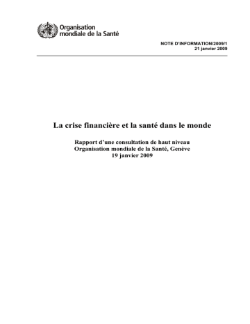 NOTE D’INFORMATION/2009/1 21 janvier 2009 La crise financière et la santé dans le monde Rapport d’une consultation de haut niveau Organisation mondiale de la Santé, Genève 19 janvier 2009 Note d’information/2009/1 INTRODUCTION 1. Face aux préoccupations exprimées par les Etats Membres, le Directeur général a convoqué avant l’ouverture de la cent vingt-quatrième session du Conseil exécutif une consultation de haut niveau sur les effets de la crise financière et économique mondiale. Les objectifs étaient les suivants : a) mieux faire prendre conscience de la façon dont le ralentissement de l’activité économique peut affecter les dépenses consacrées à la santé, les services de santé, la demande de soins et les résultats en matière de santé ; b) sensibiliser l’opinion à l’importance du maintien des investissements en faveur de la santé ; et c) définir des mesures – y compris la surveillance de signes avant-coureurs – qui peuvent contribuer à atténuer les effets négatifs du ralentissement de l’activité économique. 2. La note d’information préparée pour la réunion est jointe en annexe 1, tandis que le programme et la liste des intervenants figurent à l’annexe 2. La présente note récapitule les principaux aspects du débat et les conclusions de la réunion. Tous les pays seront touchés mais certains le seront plus que d’autres 3. Du fait de la crise financière dans les pays de l’OCDE, le monde risque de faire face au plus grave ralentissement de l’activité économique depuis les années 1930. On estime que, du fait des augmentations passées du coût des denrées alimentaires et de l’énergie, plus de 100 millions de personnes ont replongé dans la pauvreté. Le défi que doit relever le monde aujourd’hui est d’éviter que la crise économique ne se transforme en crise sociale et sanitaire. 4. Les crises antérieures survenues dans les années 1980 et 1990 avaient débuté dans les pays en développement. Dans le cas actuel, la crise a débuté dans le monde industrialisé ; il est donc possible que l’ensemble de ses effets ne se soit pas encore fait sentir dans les pays en développement. En même temps, pour les nombreux pays à faible revenu confrontés à des difficultés financières chroniques, le problème n’est pas nouveau. Une grave crise sévit déjà sur le plan humain. Le problème vient de ce que leur situation risque d’empirer à mesure qu’ils seront touchés par le ralentissement, pour des raisons totalement indépendantes d’eux. 5. Certains pays sont particulièrement exposés. Il s’agit notamment de pays développés qui ont eu besoin d’une aide d’urgence du Fonds monétaire international et où des restrictions budgétaires pourraient être imposées durant le remboursement des prêts. De nombreux pays en développement sont dans une situation budgétaire bien meilleure que lors des crises antérieures et la plupart d’entre eux vont continuer à connaître une croissance économique, bien qu’à un rythme plus lent. Cependant, ceux qui dépendent fortement des financements de donateurs dans le domaine de la santé risquent de voir ces aides diminuer. La population des pays touchés par un conflit ou se trouvant au sortir d’un conflit est particulièrement vulnérable puisque les réserves financières sont très limitées, les institutions fragilisées et les infrastructures endommagées. D’autres, en particulier les petits Etats insulaires en développement, doivent affronter un ralentissement de l’activité économique tout en étant menacés par l’impact imminent du changement climatique. 3 Note d’information/2009/1 6. Malgré tout, dans les pays à revenu élevé ou les pays à faible revenu, ce sont les pauvres – et les personnes paupérisées par une perte de revenu ou de logement – qui seront les plus durement touchés. Il est tout aussi important de repérer les populations vulnérables que les pays vulnérables. Solidarité en temps de crise : sauvegarder les progrès, honorer les engagements et tenir les promesses 7. Ces dernières années, les gouvernements de nombreux pays à faible revenu ont augmenté leurs dépenses consacrées à la santé. L’aide en faveur de la santé a doublé entre 2000 et 2006 et les engagements globaux dans ce domaine se sont accrus. Bien des pays ont réalisé des progrès remarquables en vue de la réalisation des objectifs du Millénaire pour le développement. Avancer sensiblement vers une réduction des taux de pauvreté absolue est désormais une possibilité réelle. 8. Pour éviter que la crise financière et économique ne réduise à néant ces aspirations et ces réalisations, il faut que s’instaure une véritable solidarité : a) entre les gouvernements bailleurs de fonds et les pays qui ont besoin de leur appui : garantir les niveaux promis d’aide au développement ; b) entre les gouvernements et la population : promouvoir une dimension éthique dans les politiques publiques – et, en particulier, maintenir les services sanitaires et sociaux essentiels ; et c) entre citoyens : partager les risques et responsabilités, ce qui est la base d’un système de santé solide. 9. La société civile doit maintenir la vigilance en ce qui concerne les engagements des gouvernements, des donateurs et des organismes internationaux. 10. Pour résumer les choses, la crise financière a suscité un examen des valeurs sociétales à travers le monde. De même, la riposte dans le domaine de la santé devrait s’inscrire dans la perspective d’une transformation et promouvoir la justice sociale en tant qu’idée-force. On peut faire beaucoup pour atténuer les répercussions de la crise financière 11. Les effets de la crise se font de plus en plus sentir dans de nombreux pays à faible revenu et à revenu intermédiaire : les flux financiers privés diminuent (de US $1000 milliards, ils sont revenus à la moitié de ce mont