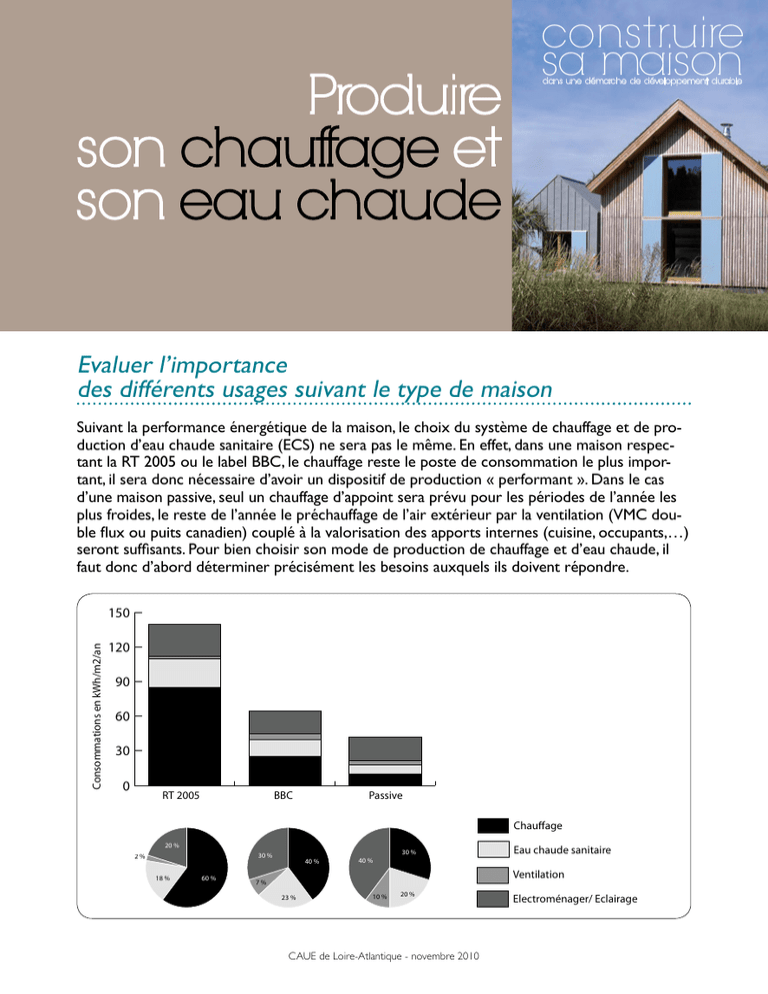 construire sa maison Produire son chauffage et son eau chaude dans une démarche de développement durable Evaluer l’importance des différents usages suivant le type de maison Suivant la performance énergétique de la maison, le choix du système de chauffage et de production d’eau chaude sanitaire (ECS) ne sera pas le même. En effet, dans une maison respectant la RT 2005 ou le label BBC, le chauffage reste le poste de consommation le plus important, il sera donc nécessaire d’avoir un dispositif de production « performant ». Dans le cas d’une maison passive, seul un chauffage d’appoint sera prévu pour les périodes de l’année les plus froides, le reste de l’année le préchauffage de l’air extérieur par la ventilation (VMC double flux ou puits canadien) couplé à la valorisation des apports internes (cuisine, occupants,…) Consommations d'énergie en fonction du type de maison Consommations d'énergie fonction du type de maison seront suffisants. Pourenbien choisir son mode de production de chauffage et d’eau chaude, il faut donc d’abord déterminer précisément les besoins auxquels ils doivent répondre. Consommations d'énergie en fonction du type de maison 150 Consommations en kWh/m2/an 120 150 90 60 30 0 Consommations en kWh/m2/an Consommations en kWh/m2/an 150 120 90 60 des consommations par usage Répartition des consommations parRépartition usage des consommations parRépartition usage --> l'exemple d'une maison RT2005--> l'exemple d'une maison bbc --> l'exemple d'une maison passive RT 2005 Electroménager/ Eclairage 20 % Ventilation 2 % ECS 18 % BBC30 Chauffage 0 Electroménager/ Eclairage 30 % 90 60 30 0 Ventilation RT 2005 BBC 30 % Eclairage Chauffage Electroménager/ Chauffage Electroménager/ 40 % 40 % Eclairage Eau chaude sanitaire 60 % Passive 120 Chauffage Chauffage 7% Ventilation 23 % ECS BBC ECS CAUE de Loire-Atlantique - novembre 2010 Passive Chauffage Ventilation Passive Eau chaude sanitaire Electroménager/ Eclai Ventilation 20 % % Eau10chaude sanitaire Ventilation RT 2005 Electroménager/ Eclairage Produire son chauffage Le chauffage est le poste de consommation énergétique le plus important dans une maison classique (respectant la RT 2005 ou antérieure). Dans une maison BBC, les consommations peuvent encore représenter jusqu’à 20 ou 30 kWh/m2/an, soit entre 40 et 50 % des consommations totales. Il est donc primordial de bien choisir le système de chauffage de sa maison et de trouver un dispositif adapté à ses usages. On distingue deux stratégies de chauffage : le chauffage central et le chauffage pièce par pièce. Le chauffage central Dans ce cas, la chaleur est produite à un seul endroit et distribuée ensuite par un réseau relié à des émetteurs. On distingue plusieurs systèmes de production de chaleur : • les chaudières : • Chaudières gaz ou fioul : Il faudra privilégier les chaudières à haut rendement telles que les chaudières « basse température », et « à condensation » qui consomment peu. Par ailleurs, le système de chaudière à ventouse présente l’avantage de ne pas nécessiter de conduit de cheminée puisque les produits de combustion peuvent être directement extraits en façade. Ces chaudières seront optimisées en étant reliées à un plancher chauffant « basse température » ou à des radiateurs « chaleur douce ». • Chaudières bois : il existe des chaudières manuelles telles que les chaudières à combustion inversée, et à tirage forcé, mais également des chaudières à alimentation automatique dont le rendement est particulièrement intéressant. • le système solaire combiné (SSC) : ce dispositif utilise des capteurs solaires thermiques pour transformer le rayonnement solaire en chaleur. Cette chaleur est ensuite transférée à un fluide caloporteur (« porteur de chaleur »). On distingue deux solutions : • le fluide alimente un réseau de tubes noyés dans la dalle. La chaleur est stockée dans la dalle béton et diffusée lentement dans la maison. Ce système est appelé Plancher Solaire Direct (PSD). • le fluide réchauffe l’eau d’un réservoir permettant de stocker la chaleur et d’alimenter un réseau de distribution classique de chauffage central (émetteurs basse température,...). Ce dispositif fournit également l’eau chaude sanitaire. Les capteurs peuvent avoir une orientation allant du sud-est au sud-ouest, et une inclinaison comprise entre 30° et 60° (45° étant optimal). Attention toutefois, ce dispositif peut couvrir de 25 à 60 % des besoins de chauffage et nécessite donc un système d’appoint : dans le cas d’une petite maison ou d’une région ensoleillée, cet appoint peut être indépendant (poêle à bois, convecteurs électriques,…) ; dans le cas d’une grande maison ou d’une région peu ensoleillée, l’appoint sera de préférence couplé au système (chaudière). CAUE de Loire-Atlantique - novembre 2010 • les pompes à chaleur (PAC) : elles utilisent la chaleur du sol (géothermie), de l’air (aérothermie) ou encore de l’eau d’une nappe pour alimenter en chaleur le logement. La chaleur est ensuite distribuée dans toutes les pièces par un émetteur de chaleur de type radiateur « chaleur douce » ou « plancher chauffant basse température » (tubes noyés dans la dalle, bien adapté aux grands volumes à chauffer). Elles peuvent également être réversibles et servir de climatisation pour le logement en été (cette solution ne devant être envisagée que dans de rares cas pour une maison individuelle). Sachez également que les PAC consomment de l’énergie électrique, elles disposent d’un coefficient de performance (COP) qui indique le rapport entre la chaleur produite et l’électricité consommée. Dans le cas d’une maison BBC, il est recommandé de choisir des PAC dont le COP annuel est au moins égal ou supérieur à 3,5. NB : Pour les PAC géothermiques à capteurs horizontaux, pensez à l