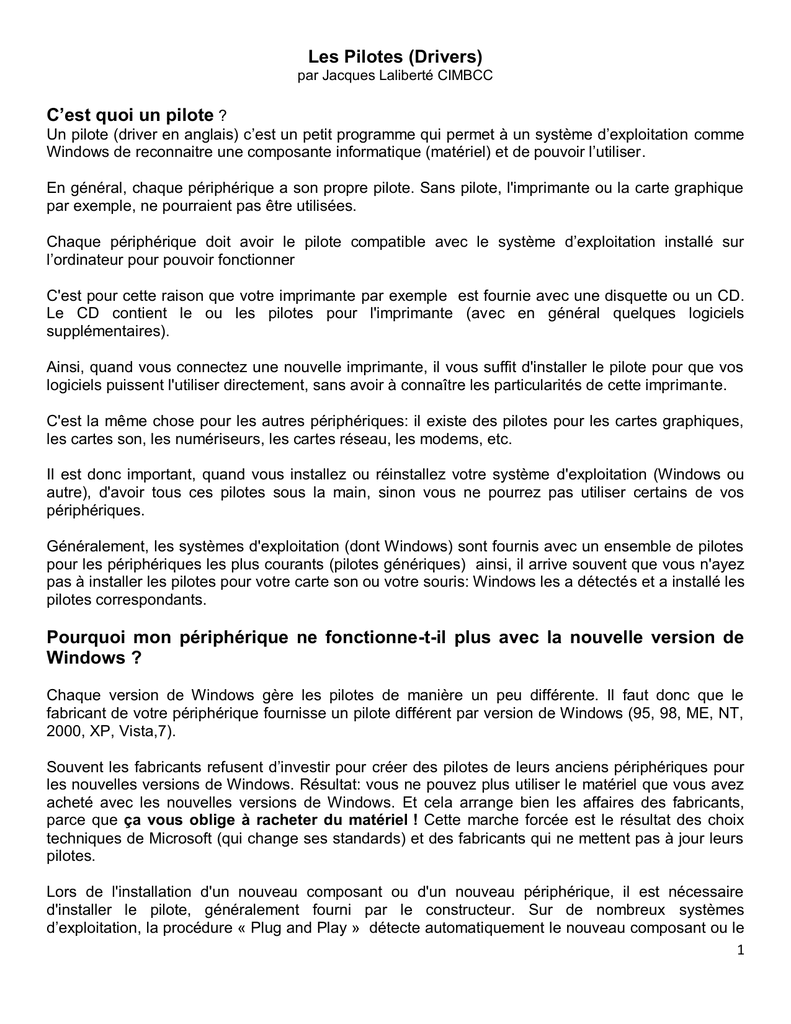 Les Pilotes (Drivers) par Jacques Laliberté CIMBCC C’est quoi un pilote ? Un pilote (driver en anglais) c’est un petit programme qui permet à un système d’exploitation comme Windows de reconnaitre une composante informatique (matériel) et de pouvoir l’utiliser. En général, chaque périphérique a son propre pilote. Sans pilote, l'imprimante ou la carte graphique par exemple, ne pourraient pas être utilisées. Chaque périphérique doit avoir le pilote compatible avec le système d’exploitation installé sur l’ordinateur pour pouvoir fonctionner C'est pour cette raison que votre imprimante par exemple est fournie avec une disquette ou un CD. Le CD contient le ou les pilotes pour l'imprimante (avec en général quelques logiciels supplémentaires). Ainsi, quand vous connectez une nouvelle imprimante, il vous suffit d'installer le pilote pour que vos logiciels puissent l'utiliser directement, sans avoir à connaître les particularités de cette imprimante. C'est la même chose pour les autres périphériques: il existe des pilotes pour les cartes graphiques, les cartes son, les numériseurs, les cartes réseau, les modems, etc. Il est donc important, quand vous installez ou réinstallez votre système d'exploitation (Windows ou autre), d'avoir tous ces pilotes sous la main, sinon vous ne pourrez pas utiliser certains de vos périphériques. Généralement, les systèmes d'exploitation (dont Windows) sont fournis avec un ensemble de pilotes pour les périphériques les plus courants (pilotes génériques) ainsi, il arrive souvent que vous n'ayez pas à installer les pilotes pour votre carte son ou votre souris: Windows les a détectés et a installé les pilotes correspondants. Pourquoi mon périphérique ne fonctionne-t-il plus avec la nouvelle version de Windows ? Chaque version de Windows gère les pilotes de manière un peu différente. Il faut donc que le fabricant de votre périphérique fournisse un pilote différent par version de Windows (95, 98, ME, NT, 2000, XP, Vista,7). Souvent les fabricants refusent d’investir pour créer des pilotes de leurs anciens périphériques pour les nouvelles versions de Windows. Résultat: vous ne pouvez plus utiliser le matériel que vous avez acheté avec les nouvelles versions de Windows. Et cela arrange bien les affaires des fabricants, parce que ça vous oblige à racheter du matériel ! Cette marche forcée est le résultat des choix techniques de Microsoft (qui change ses standards) et des fabricants qui ne mettent pas à jour leurs pilotes. Lors de l'installation d'un nouveau composant ou d'un nouveau périphérique, il est nécessaire d'installer le pilote, généralement fourni par le constructeur. Sur de nombreux systèmes d’exploitation, la procédure « Plug and Play » détecte automatiquement le nouveau composant ou le 1 nouveau périphérique. Il est cependant parfois nécessaire de lui fournir le support du pilote (CDROM, DVD ou emplacement), puis de procéder à l'installation et au paramétrage. La qualité des pilotes est souvent essentielle pour obtenir de bons résultats sur le fonctionnement des composants ou des périphériques. On peut trouver sur le Web des pilotes plus ou moins généralistes pour un type de matériel donné, ou au contraire capables d'améliorer les performances générales du composant ou du périphérique, ou même d'utiliser des fonctions cachées. Cependant, pour un maximum de sécurité, il est préférable d'utiliser les pilotes fournis par les constructeurs et d'utiliser les versions les plus récentes. Ces versions sont généralement disponibles sur leurs sites Web respectifs.(voir les adresses à la fin du document) Q. -Comment aller vérifier si les pilotes de nos composantes sont installés, compatibles et approuvés WHQL. R. – Avec le gestionnaire de périphériques Vista et Sept : Démarrer / Clic droit sur Ordinateur / Propriétés / Gestionnaire de périphériques XP : Démarrer / Clic droit sur Poste de travail / Propriétés / Gestionnaire de périphériques Les drivers certifiés WHQL (Windows Hardware Quality Laboratories) : ces pilotes ont été testés par Microsoft et ont été jugés comme étant stables, c'est à dire ne comportant pratiquement aucun bogue. Cette certification ne doit pas vous obséder. Un pilote non certifié fonctionnera tout aussi bien, parfois mieux. Pour savoir si votre pilote est certifié, allez dans le panneau de configuration. Cliquez ensuite sur l'icône système, puis sur l'onglet matériel. Cliquez enfin sur gestionnaire de périphériques et sélectionnez votre périphérique. Faites un clic droit dessus, cliquez sur propriétés puis sur l'onglet pilote. Si aucune signature numérique n'est présente ("non signé numériquement"), votre pilote n'est pas certifié. Comment identifier ou connaître son matériel Les manuels et la facture remis à l’achat Avec des logiciels de détection tels que Aida, Everest, SIW etc. À partir du NIP numéro d’identification de son matériel Chaque composante possède son propre NIP (numéro d’identification personnelle) Ce NIP permet aux systèmes plug and play de reconnaitre le matériel et de lui attribuer un pilote Lors d’une nouvelle installation, Windows installe des pilotes génériques en se basant sur les numéros de matériel. Pour trouver la marque, modèle du matériel installé sur le PC, avec Windows 7 ou Vista procéder comme ceci: Clic sur Démarrer. 1. Clic droit sur Ordinateur et choisir Propriétés. 2. Clic sur Gestionnaire de périphériques en haut à gauche. 3. Accepter le message qui suit. 4. Dans le gestionnaire, développer la branche correspondante au matériel que vous voulez. Exemple: J'ai choisi la carte graphique de mon portable.(Valable aussi pour un autre périphérique) 1. Clic sur la croix à gauche de Cartes graphiques. 2. Clic droit sur la carte graphique et choisir Propriétés. 3. Clic sur l'onglet Détails. 4. Dans la barre déroulante Propriét