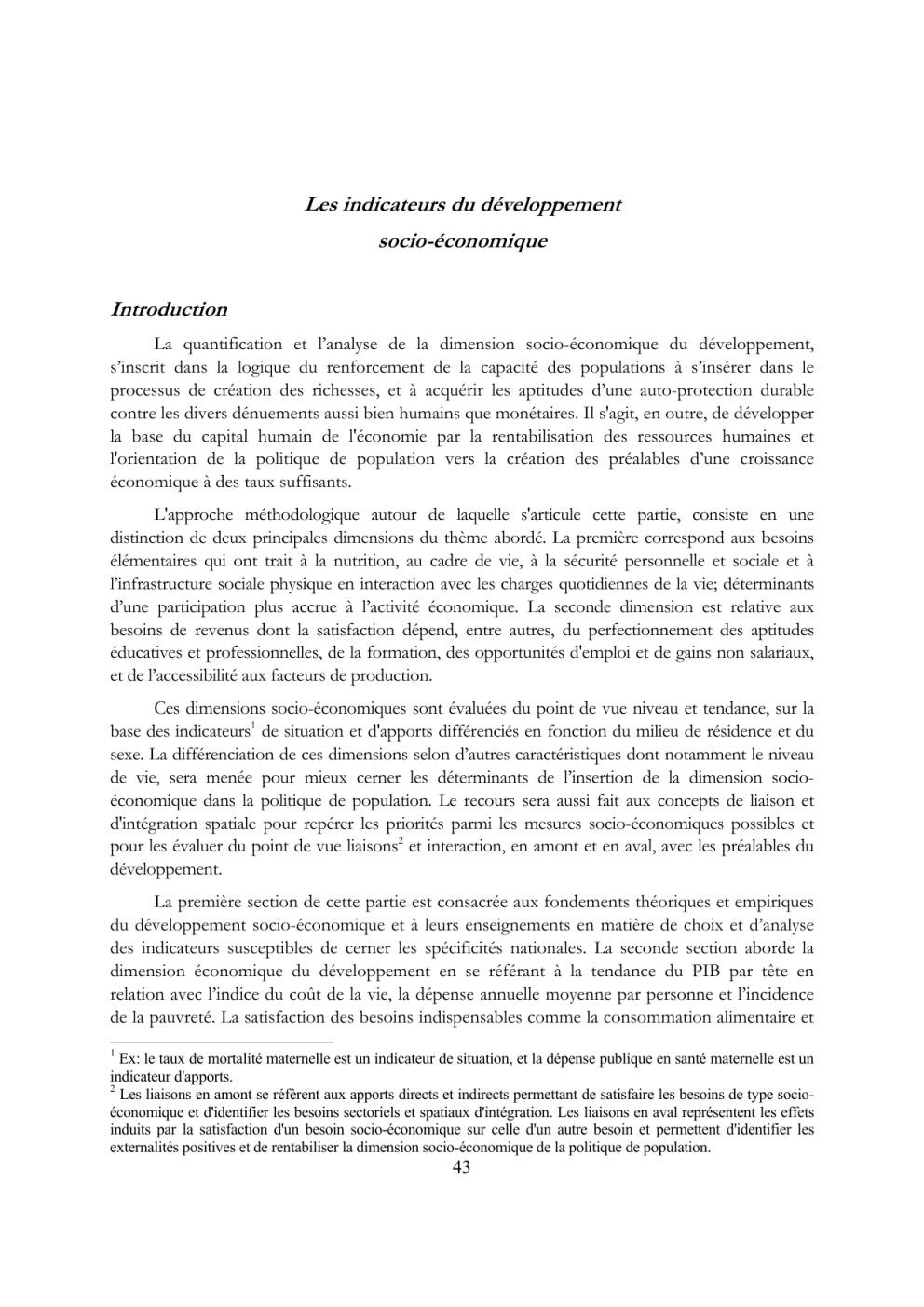 Les indicateurs du développement socio-économique Introduction La quantification et l’analyse de la dimension socio-économique du développement, s’inscrit dans la logique du renforcement de la capacité des populations à s’insérer dans le processus de création des richesses, et à acquérir les aptitudes d’une auto-protection durable contre les divers dénuements aussi bien humains que monétaires. Il s'agit, en outre, de développer la base du capital humain de l'économie par la rentabilisation des ressources humaines et l'orientation de la politique de population vers la création des préalables d’une croissance économique à des taux suffisants. L'approche méthodologique autour de laquelle s'articule cette partie, consiste en une distinction de deux principales dimensions du thème abordé. La première correspond aux besoins élémentaires qui ont trait à la nutrition, au cadre de vie, à la sécurité personnelle et sociale et à l’infrastructure sociale physique en interaction avec les charges quotidiennes de la vie; déterminants d’une participation plus accrue à l’activité économique. La seconde dimension est relative aux besoins de revenus dont la satisfaction dépend, entre autres, du perfectionnement des aptitudes éducatives et professionnelles, de la formation, des opportunités d'emploi et de gains non salariaux, et de l’accessibilité aux facteurs de production. Ces dimensions socio-économiques sont évaluées du point de vue niveau et tendance, sur la base des indicateurs1 de situation et d'apports différenciés en fonction du milieu de résidence et du sexe. La différenciation de ces dimensions selon d’autres caractéristiques dont notamment le niveau de vie, sera menée pour mieux cerner les déterminants de l’insertion de la dimension socioéconomique dans la politique de population. Le recours sera aussi fait aux concepts de liaison et d'intégration spatiale pour repérer les priorités parmi les mesures socio-économiques possibles et pour les évaluer du point de vue liaisons2 et interaction, en amont et en aval, avec les préalables du développement. La première section de cette partie est consacrée aux fondements théoriques et empiriques du développement socio-économique et à leurs enseignements en matière de choix et d’analyse des indicateurs susceptibles de cerner les spécificités nationales. La seconde section aborde la dimension économique du développement en se référant à la tendance du PIB par tête en relation avec l’indice du coût de la vie, la dépense annuelle moyenne par personne et l’incidence de la pauvreté. La satisfaction des besoins indispensables comme la consommation alimentaire et 1 Ex: le taux de mortalité maternelle est un indicateur de situation, et la dépense publique en santé maternelle est un indicateur d'apports. 2 Les liaisons en amont se réfèrent aux apports directs et indirects permettant de satisfaire les besoins de type socioéconomique et d'identifier les besoins sectoriels et spatiaux d'intégration. Les liaisons en aval représentent les effets induits par la satisfaction d'un besoin socio-économique sur celle d'un autre besoin et permettent d'identifier les externalités positives et de rentabiliser la dimension socio-économique de la politique de population. 43 non alimentaire et la nutrition, est abordée en interaction avec le niveau de vie. La description des schémas de consommation permettra, par la suite, d’explorer les conditions sous lesquelles le pouvoir d’achat des populations à revenu limité peut-être sauvegardé ou renforcé. La troisième section évalue le potentiel national en ressources humaines et le degré de son insertion dans le processus de formation et de production de biens et services ; dimension approchée par la composition socioprofessionnelle des ménages, le niveau et les formes d’emploi, le risque du chômage et les sources de revenu. Cette dimension est complétée par l’analyse des schémas d’investissement et de production des ménages, et ce dans le but d’appréhender le moyen par lequel les activités génératrices de revenu peuvent être rentabilisées et utilisées comme support d’amélioration des niveaux de vie déficients. Comme il serait plutôt absurde de supposer qu’un développement économique puisse se déclencher en l’absence d’une infrastructure sociale physique, particulièrement en milieu rural, le besoin déclaré des populations en équipements communautaires socio-économiques, est analysé à la quatrième section en termes d’équipements des douars ruraux et de priorités sociales aussi bien urbaines que rurales. La garantie des revenus durables passe aussi par le renforcement des circuits formels de sécurité sociale protégeant les populations de la dégradation excessive des conditions de vie induite par les chocs externes comme l’invalidité du soutien économique, l’inflation, la sécheresse et les inondations. Cette dimension est explorée à la cinquième section où les mesures socioéconomiques d’accompagnement du développement, sont abordées à travers l’accès des populations aux transferts en espèces et en nature, aux emprunts à usage domestiques et à la sécurité sociale et publique. La sixième section est consacrée à la tendance des indicateurs composites en comparaison avec des pays de même niveau de développement que le Maroc. Cette section propose, en outre, une sélection d’indicateurs de suivi et de contrôle de la dimension socio-économique de la politique de développement. Telles qu’elles se dégagent de l’analyse de diverses dimensions abordées par cette partie, les mesures socio-économiques susceptibles d’aider à la formulation d’une politique intégrée de développement sont présentées en synthèse générale. L’annexe est consacrée aux concepts et définitions des indicateurs socio-économiques et à leur tendance 