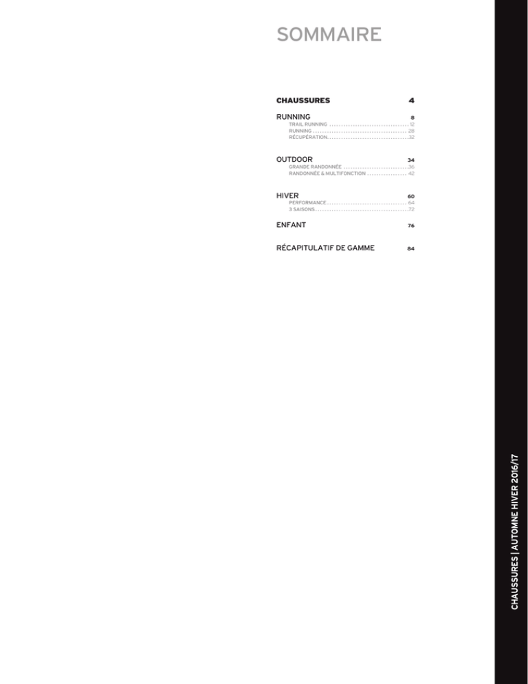 SOMMAIRE CHAUSSURES 4 RUNNING 8 TRAIL RUNNING . . . . . . . . . . . . . . . . . . . . . . . . . . . . . . . . . . . 12 RUNNING . . . . . . . . . . . . . . . . . . . . . . . . . . . . . . . . . . . . . . . . . 28 RÉCUPÉRATION . . . . . . . . . . . . . . . . . . . . . . . . . . . . . . . . . . 32 OUTDOOR 34 GRANDE RANDONNÉE . . . . . . . . . . . . . . . . . . . . . . . . . . . 36 RANDONNÉE & MULTIFONCTION . . . . . . . . . . . . . . . . . . 42 HIVER ENFANT 76 RÉCAPITULATIF DE GAMME 84 CHAUSSURES | AUTOMNE HIVER 2016/17 60 PERFORMANCE . . . . . . . . . . . . . . . . . . . . . . . . . . . . . . . . . . 64 3 SAISONS . . . . . . . . . . . . . . . . . . . . . . . . . . . . . . . . . . . . . . . 72 TECHNOLOGIES CLÉS Les fondamentaux des chaussures Salomon SENSIFIT™ Enveloppe le pied pour le maintenir de manière précise et sûre. Le Sensifit™ enveloppe le pied depuis l’intercalaire jusqu’aux œillets du système de laçage, offrant un fit à la fois précis et confortable. ACCROCHE ET DURABILITÉ Le Contagrip® est une association précise de géométrie, de densité et de gomme, optimisée pour des disciplines et des types de surface spécifiques. QUICKLACE™ Chaussage et déchaussage aisés, pour un fit sûr et précis Le Quicklace™ est un cordon en polyester exclusif, extrêmement résistant, qui passe dans une succession d’œillets coulissants. Lorsque l’on tire dessus, il se resserre de manière équilibrée des deux côtés. Il n’y a plus qu’à verrouiller avec le bloqueur et à glisser l’excédent dans la pochette prévue à cet effet. GÉOMÉTRIE SPÉCIFIQUE À LA DISCIPLINE DENSITÉ SPÉCIFIQUE À LA DISCIPLINE GOMME SPÉCIFIQUE À LA DISCIPLINE 3D SENSIFLEX™ Une technologie exclusive Salomon HIME GÉOMÉTRIE Crampons multidirectionnels très marqués de formes variées et canaux d’évacuation de la neige. Évacuation de l’eau au niveau des crampons centraux GOMME Gommes double densité à adhérence élevée sur terrain humide et haute résistance à l’abrasion FOCUS Accroche sur la neige et la glace, évite l’accumulation de neige GÉOMÉTRIE Crampons multidirectionnels peu profonds haute densité GOMME Gomme à adhérence élevée sur terrain humide, avec appui latéral en gomme à durabilité accrue FOCUS Stabilité et confort sur surfaces planes, accroche sur surfaces urbaines, mouillées ou sèches WATERPROOF Protection imperméable contre les intempéries Les randonneurs dynamiques ont besoin d’une construction avec chausson souple, léger et imperméable. IMPERMÉABILITÉ RESPIRABILITÉ SOUPLESSE POIDS GÉOMÉTRIE Adaptée aux surfaces urbaines, profil abaissé et espace pour le flex GOMME High Abrasion and Wet Traction Contagrip® FOCUS Accroche et durabilité sur surfaces urbaines dures, mouillées ou sèches SPEEDCROSS IMPERMÉABILITÉ RESPIRABILITÉ SOUPLESSE POIDS WINGS PRO 2 Conçue en GORE-TEX® offrant une protection durable contre l’eau, un flex accru, un meilleur amorti et une plus grande légèreté. Les coureurs actifs ont besoin sur l’avant-pied d’une membrane légère, respirante et qui sèche rapidement, afin de les protéger contre la boue et l’humidité sans retenir la transpiration. SONIC PRO Construction de flex Salomon GÉOMÉTRIE Adaptée aux surfaces urbaines, profil abaissé et espace pour le flex GOMME High Abrasion and Wet Traction Contagrip® de très haute qualité FOCUS Accroche et légèreté à vitesse élevée sur surfaces urbaines dures, mouillées ou sèches GÉOMÉTRIE Crampons profonds, à arêtes vives et en biais, de forme carrée GOMME High Abrasion and Wet Traction Contagrip® FOCUS Adhérence extrême axée sur la descente en terrain technique GÉOMÉTRIE Crampons profonds en forme de chevrons bien prononcés et à arêtes vives GOMME Simple densité, gomme souple FOCUS Adhérence performante en conditions humides et boueuses, autonettoyage pour diminuer le poids CHAUSSURES | AUTOMNE HIVER 2016/17 GÉOMÉTRIE Profil multidirectionnel, motifs profonds en forme de vague, avec évacuation de l’eau et appui latéral solide GOMME Contagrip® simple densité hautement résistant à l’abrasion FOCUS Accroche et durabilité sur surfaces variées, mouillées ou sèches Protection respirante contre les intempéries X-SCREAM 3D CHAUSSURES | AUTOMNE HIVER 2016/17 Une technologie performante pour chaque type de météo 4 QUEST GÉOMÉTRIE Crampons multidirectionnels à arêtes vives, crampons profonds GOMME Double densité, crampons extérieurs souples, crampons centraux plus résistants FOCUS Adhérence et stabilité en montée et en descente sur surfaces mouillées ou sèches TECHNOLOGIES DE PROTECTION CONTRE LES INTEMPÉRIES TOUNDRA Manchon interne servant à maintenir fermement le milieu du pied et à améliorer le ressenti du terrain. X ULTRA Combinaison optimale de liberté de mouvement et de maintien 5 CHAUSSURES | AUTOMNE HIVER 2016/17 CHAUSSURES | AUTOMNE HIVER 2016/17 RUNNING TRAIL RUNNING RUNNING 8 9 SEGMENTATION DU RUNNING TRAIL RUNNING RUNNING HORS SENTIER LÉGÈRETÉ Tout coureur à l’esprit aventurier quitte inévitablement les sentiers battus. Nos chaussures HORS SENTIER sont conçues pour vous offrir le meilleur maintien et la meilleure protection sur n’importe quel terrain. Avec leur fit exceptionnel, leur déroulé fluide et leur adhérence qui les font sortir du lot, nos chaussures de running LÉGÈRES vous aident à garder un rythme soutenu en terrain urbain. 3D ADVANCED CHASSIS Stabilité et protection maximales dans un ensemble léger pour affronter des terrains imprévisibles. ENERGY CELL Un matériau d’intercalaire qui atténue les chocs pour des impacts tout en douceur. SONIC PRO AMORTI SENTIERS TECHNIQUES Avec leur fit adaptatif, une adhérence multisurface et une bonne réactivité, nos chaussures amortissantes vous aident à explorer les différents terrains urbains qui s’offrent à vous en tout confort. CHAUSSURES | AUTOMNE HIVER 2016/17 Imprévisibles, certains s