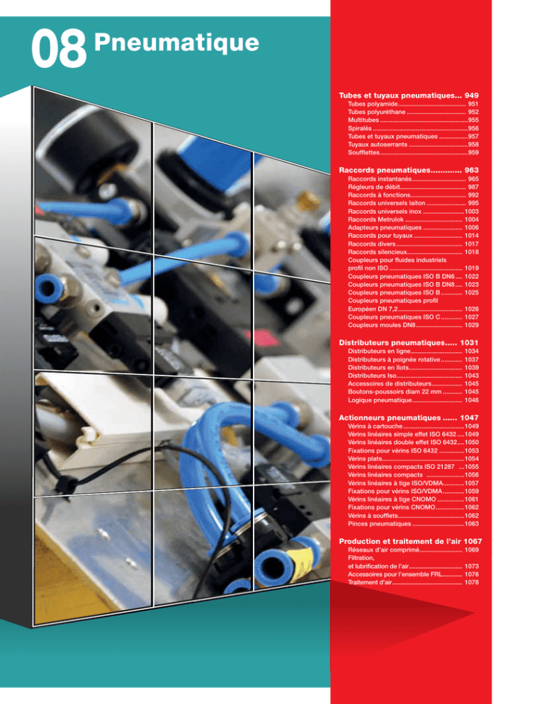 08 Pneumatique Tubes et tuyaux pneumatiques... 949 Tubes polyamide ...................................... 951 Tubes polyuréthane ................................. 952 Multitubes .................................................955 Spiralés .....................................................956 Tubes et tuyaux pneumatiques ................957 Tuyaux autoserrants .................................958 Soufflettes .................................................959 Raccords pneumatiques ............. 963 Raccords instantanés .............................. 965 Régleurs de débit..................................... 987 Raccords à fonctions............................... 992 Raccords universels laiton ...................... 995 Raccords universels inox .......................1003 Raccords Metrulok ................................ 1004 Adapteurs pneumatiques ...................... 1006 Raccords pour tuyaux ........................... 1014 Raccords divers ..................................... 1017 Raccords silencieux............................... 1018 Coupleurs pour fluides industriels profil non ISO ......................................... 1019 Coupleurs pneumatiques ISO B DN6 .... 1022 Coupleurs pneumatiques ISO B DN8 .... 1023 Coupleurs pneumatiques ISO B ............ 1025 Coupleurs pneumatiques profil Européen DN 7,2 .................................... 1026 Coupleurs pneumatiques ISO C ............ 1027 Coupleurs moules DN8 .......................... 1029 Distributeurs pneumatiques ..... 1031 Distributeurs en ligne ............................. Distributeurs à poignée rotative ............ Distributeurs en îlots.............................. Distributeurs Iso..................................... Accessoires de distributeurs ................. Boutons-poussoirs diam 22 mm ........... Logique pneumatique ............................ 1034 1037 1039 1043 1045 1045 1046 Actionneurs pneumatiques ...... 1047 Vérins à cartouche ..................................1049 Vérins linéaires simple effet ISO 6432 ....1049 Vérins linéaires double effet ISO 6432....1050 Fixations pour vérins ISO 6432 ..............1053 Vérins plats..............................................1054 Vérins linéaires compacts ISO 21287 ...1055 Vérins linéaires compacts .....................1056 Vérins linéaires à tige ISO/VDMA............1057 Fixations pour vérins ISO/VDMA ............1059 Vérins linéaires à tige CNOMO ...............1061 Fixations pour vérins CNOMO ................1062 Vérins à soufflets.....................................1062 Pinces pneumatiques .............................1063 Production et traitement de l’air 1067 Réseaux d’air comprimé ........................ Filtration, et lubrification de l’air ................................ Accessoires pour l’ensemble FRL............ Traitement d’air .......................................... 1069 régulation 1073 1076 1078 08 Pneumatique Tubes et tuyaux pneumatiques Tubes polyamide ...................................... 951 Tubes polyuréthane ................................. 952 Multitubes .................................................955 Spiralés .....................................................956 Tubes et tuyaux pneumatiques ................957 Tuyaux autoserrants .................................958 Soufflettes .................................................959 et vous présentent leur sélection ECO du moment de tubes et de tuyaux techniques... Soyons ECO-logiques Tube polyamide, alternative au PA12 avec meilleure disponibilité et prix identique : - Matériau bio sourcé, sans silicone - Bonne résistance chimique - Haute résistance en température et pression - Forte résistance aux chocs et à l’abrasion - Excellente flexibilité et petit rayon de courbure Soyons ECO-nomiques Kit soufflette prêt à l’emploi composé d’une soufflette, d’un tube spiralé longueur 4 m, diamètre ext 8 mm et une connexion R1/4’’. Économisez 10% par rapport à l’achat des éléments séparés. Nouveau conditionnement en sachet plastique individuel. Adoptez l’ECO-attitude avec Mabéo Industries et Parker ! 950 Tubes polyamide Tubes 1025P en longueur de 25 mètres Tubes polyamide semi-rigides, calibrés 25 mètres série 1025P. Offrent une excellente résistance à la pression et à la température combinée à une excellente compatibilité chimique. Diam. Diam. int. ext. (en mm) (en mm) 1,8 3 2 4 2,7 4 3,3 5 4 6 6 8 8 10 7,5 10 9 12 10 12 11 14 11 16 12 14 13 16 BLANC Réf.fab. 1025P03 00 18 1025P04 00 1025P04 00 27 1025P05 00 33 1025P06 00 1025P08 00 1025P10 00 1025P10 00 75 1025P12 00 09 1025P12 00 1025P14 00 11 1025P14 00 1025P16 00 13 Diam. Diam. NOIR int. ext. (en mm) (en mm) Réf.fab. 1,8 3 2 4 1025P04 01 2,7 4 1025P04 01 27 3,3 5 1025P05 01 33 4 6 1025P06 01 1025P08 01 6 8 1025P10 01 8 10 7,5 10 1025P10 01 75 9 12 1025P12 01 09 10 12 1025P12 01 11 14 1025P14 01 11 11 16 12 14 1025P14 01 13 16 1025P16 01 13 BLEU Code 159434W 155353H 155354S 155359V 155360G 155364Y 155371X 155372I 155374E 155373T 161461L 155375P 155378W Réf.fab. 1025P03 04 18 1025P04 04 1025P04 04 27 1025P05 04 33 1025P06 04 1025P08 04 1025P10 04 1025P10 04 75 1025P12 04 09 1025P12 04 1025P14 04 11 1025P16 04 13 1025P14 04 - Code 169861H 155355D 649818A 161460A 155365J 166139P 012950W 649830C 061978M 649835F 199926C 1164064 GRIS Code 649812M 155358K 160284M 649819L 155363N 155368Q 174876A 199918S 649831N 165073P 649836Q 1164067 199928Y - NOIR ANTIÉTINCELLES GAINÉS Réf.fab. Code 1025P06V01 1025P08V01 1025P10V01 1025P12V01 - JAUNE Réf.fab. 1025P04 06 1025P04 06 27 1025P06 06 1025P08 06 1025P10 06 - 391269X 391270I 649827V 649832Y - Code 649813X 649814I 649820W 649823D 649826K - ROUGE Réf.fab. 1025P04 03 1025P04 03 27 1025P06 03 1025P08 03 1025P10 03 1025P12 03 1025P16 03 13 VERT Réf.fab. 1025P08 05 1025P04 05 27 1025P04 05 1025P06 05 1025P10 05 - Code 155356O 155357Z 155362C 155367F 166140A 1108077 1164066 Code 155370M 157742A 