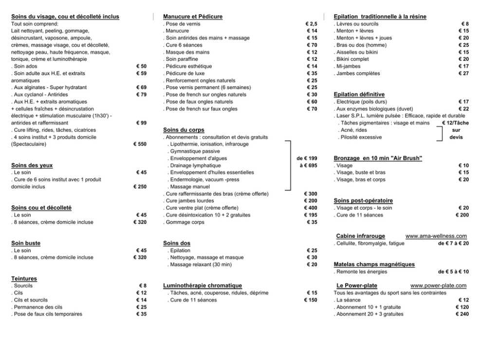 Soins du visage, cou et décolleté inclus Manucure et Pédicure Tout soin comprend: Lait nettoyant, peeling, gommage, désincrustant, vaposone, ampoule, crèmes, massage visage, cou et décolleté, nettoyage peau, haute fréquence, masque, tonique, crème et luminothérapie . Soin ados . Soin adulte aux H.E. et extraits aromatiques . Aux alginates - Super hydratant . Aux cyclanol - Antirides . Aux H.E. + extraits aromatiques + cellules fraîches + désincrustation électrique + stimulation musculaire (1h30') antirides et raffermissant . Cure lifting, rides, tâches, cicatrices . 4 soins institut + 3 produits domicile (Spectaculaire) . Pose de vernis . Manucure . Soin antirides des mains + massage . Cure 6 séances . Masque des mains . Soin paraffine . Pédicure esthétique . Pédicure de luxe . Renforcement ongles naturels . Pose vernis permanent (6 semaines) . Pose de french sur ongles naturels . Pose de faux ongles naturels . Pose de french sur faux ongles € 50 € 59 € 69 € 79 € 99 Soins du corps € 550 Soins des yeux . Le soin . Cure de 6 soins institut avec 1 produit domicile inclus € 45 € 250 Soins cou et décolleté . Le soin . 8 séances, crème domicile incluse Epilation traditionnelle à la résine € 2,5 € 14 € 15 € 70 € 12 € 12 € 14 € 35 € 25 € 25 € 30 € 60 € 70 € 45 € 320 . Abonnements : consultation et devis gratuits . Lipothermie, ionisation, infrarouge . Gymnastique passive . Enveloppement d'algues . Drainage lymphatique . Enveloppement d'huiles essentielles . Endermologie, vacuum -press . Massage manuel . Cure raffermissante des bras (crème offerte) . Cure jambes lourdes . Cure ventre plat (crème offerte) . Cure désintoxication 10 + 2 gratuites . Gommage corps de € 199 à € 695 € 300 € 200 € 400 € 195 € 35 . Lèvres ou sourcils . Menton + lèvres . Menton + lèvres + joues . Bras ou dos (homme) . Aisselles ou bikini . Bikini complet . Mi-jambes . Jambes complètes Epilation définitive . Electrique (poils durs) € 17 . Aux enzymes biologiques (duvet) € 22 . Laser S.P.L. lumière pulsée : Efficace, rapide et durable . Tâches pigmentaires : visage et mains € 12/Tâche . Acné, rides sur . Pilosité excessive devis Bronzage en 10 min "Air Brush" . Visage . Visage, buste et bras . Visage, bras et corps . Le soin . 8 séances, crème domicile incluse Soins dos € 45 € 320 . Epilation . Nettoyage, massage et masque . Massage relaxant (30 min) € 10 € 15 € 20 Soins post-opératoire . Visage et corps - le soin . Cure de 11 séances Cabine infrarouge Soin buste €8 € 15 € 20 € 25 € 15 € 20 € 17 € 27 € 20 € 200 www.ama-wellness.com . Cellulite, fibromyalgie, fatigue € 25 € 30 € 20 de € 7 à € 20 Matelas champs magnétiques . Remonte les énergies de € 5 à € 10 Teintures . Sourcils . Cils . Cils et sourcils . Permanence des cils . Pose de faux cils temporaires €8 € 12 € 14 € 25 € 35 Luminothérapie chromatique . Tâches, acné, couperose, ridules, déprime . Cure de 11 séances Le Power-plate € 15 € 150 www.power-plate.com Tous les avantages du sport sans les contraintes . La séance . Abonnement 10 + 1 gratuite . Abonnement 20 + 3 gratuites € 12 € 120 € 240 Maquillage permanent . Sourcils de € 75 à € 322 . Contour lèvres . Tracé eye-liner (supérieur ou inférieur) . Grain de beauté . Tâches de rousseur . Aréole de seins . Tatoo sur corps (de 2 à 10 ans) Centre de Soins Esthétiques Hommes et Dames € 273 € 175 € 45 de € 25 à € 100 € 150 de € 50 à € 175 Tatoo éphémère . Mendhi (1 semaine) de € 8 à € 13 Maquillage . Essai . Maquillage ampoule comprise Power-plate Cabine infrarouge € 15 € 23 Cours: maquillage et relooking Connaître toutes les astuces des mannequins (1 journée) € 125 Solo System (tunnel infrarouge) Travail en collaboration avec : . Diététicienne . Chirurgiens esthétiques . Chirurgiens vasculaires . Médecin esthétique ''Il faut soigner le corps pour que l'âme s'y plaise" (St. Vincent de Paul) Ginette HOSAY Bio-esthéticienne diplômée Conseillère en chirurgie esthétique 13, Place d'Arles 4800 VERVIERS Membre de l'Union Nationale des Esthéticiennes Belges (UNEB) Tél/Fax : +32 (0) 87 22 72 21 Email : [email protected] Site : www.ginettehosay.be Tél/Fax : +32 (0) 87 22 72 21 A OFFRIR OU A S'OFFRIR Rituel Détente (1h) JOURNEES DE DETENTE . Massage coréen manuel du cuir chevelu ou du visage + cabine Infrarouge . 1/2 jour BEAUTE . Soin visage prestige . Gommage du corps . Manucure . Pédicure . Maquillage personnalisé € 150 . 1/2 jour COCOON . Soin visage prestige . Manucure . Massage relaxant du dos . Séance cabine Infrarouge . Drainage lymphatique des jambes € 160 Chèque CADEAU : Valeur à votre convenance - Valable 3 mois . Massage mains, pieds et tête Calme, détente et intimité Rituel Anti-stress (1h30) Pour une personne, 30 minutes dans la cabine Infrarouge Rituel des extrêmes € 20 (Elimination des métaux lourds du corps) Pour 2 personnes Pour 3 personnes € 35 € 22 € 25 € 40 . Massage relaxant du dos + cataplasme d'algues + cabine Infrarouge € 45 Rituel Détoxination : Le Thalatherm (1h) . Peeling corps . Cataplasme algues . Sauna - Hammam . Ozonothérapie . Aromathérapie . Multi-jets € 50 Nettoie Détoxine Oxygénise Revitalise Détend en profondeur Rituel Energétique (1h30) Soins "Câlins" . Massage des pieds et des mollets . Soin hydratant des mains avec massage et bain paraffine . Réflexologie plantaire . Massage cuir chevelu, visage (30 min) . Massage relaxant du dos aux huiles essentielles (30 min) . Massage dos et cataplasme (1 h) . Massage complet du corps relaxant, lympho-énergétique manuel aux huiles essentielles (1 h) . Soin visage complet personnalisé € 15 € 12 € 20 € 20 € 20 € 30 Excellent contre le stress, la fatigue, la déprime . Thalatherm complet (voir ci-dessus) + massage coréen manuel cuir chevelu ou du visage € 65 . 1 