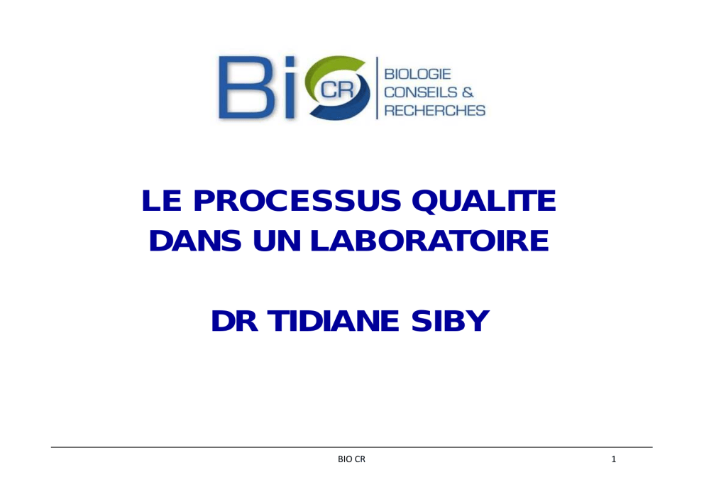 LE PROCESSUS QUALITE DANS UN LABORATOIRE DR TIDIANE SIBY BIO CR 1 LES SPECIFICITES DES LABORATOIRES DE BIOLOGIE MEDICALE ISO 15189 ACCREDITATION CERTIFICATION RECONNAISSANCE DE LA CONFORMITE D ’UN SYSTEME A UN REFERENTIEL (EX: ISO 9001) ACCREDITATION RECONNAISSANCE DE LA COMPETENCE ATTESTE PAR DES PAIRS (COMPETENCES EN TERMES ORGANISATIONNELS ET TECHNIQUES) (EX: ISO 15189) BIO CR AGREMENT RECONNAISSANCE DU RESPECT D ’UNE NORME OU REGLEMENT PAR LES POUVOIRS PUBLICS (EX: GBEA) 2 LES SPECIFICITES DES LABORATOIRES DE BIOLOGIE MEDICALE Approche processus Système organisé en processus interactifs dépendants les uns des autres dans une relation client / fournisseur interne et dont l'origine et l'aboutissement est le client externe. BIO CR 3 LES SPECIFICITES DES LABORATOIRES DE BIOLOGIE MEDICALE LES PROCESSUS OPERATIONNELS (CLES) Processus Pré analytique Processus Analytique Processus Post analytique LES PROCESSUS SUPPORTS Ressources Humaines, finances, maintenance, métrologie… BIO CR 4 LES SPECIFICITES DES LABORATOIRES DE BIOLOGIE MEDICALE Le pré analytique: Les conditions pré analytiques Le recueil de l’échantillon Le transport Le tri au laboratoire Le traitement et stockage pré analytique La gestion de l’information BIO CR 5 LES SPECIFICITES DES LABORATOIRES DE BIOLOGIE MEDICALE L’analytique: L’entretien et mise en route des appareils Le calibrage, Le contrôle Le passage des séries La validation technique L’entretien post-utilisation La gestion des pannes BIO CR 6 LES SPECIFICITES DES LABORATOIRES DE BIOLOGIE MEDICALE Le post analytique: La validation biologique La communication des résultats Le stockage des échantillons L’élimination des déchets BIO CR 7 ORGANISATION ET MANAGEMENT •Responsabilité de la direction du LABM pour la mise en œuvre, le maintien et l’amélioration du SMQ: Soutien à l’ensemble du personnel : mise à disposition de l’autorité et des ressources Mettre le personnel à l’abri des pressions ou influences internes ou externes (commerciales, financières ou autres) Politiques et procédures de confidentialité Politiques et procédures garantissant la confiance, l’impartialité, le jugement et l’intégrité opérationnelle BIO CR 8 ORGANISATION ET MANAGEMENT •Responsabilité de la direction du LABM pour la mise en œuvre, le maintien et l’amélioration du SMQ: Établissement de la structure organisationnelle et directionnelle du LABM Définition des responsabilités, autorités et interrelations pour l’ensemble du personnel Formation et encadrement (par des personnes compétentes) adéquats du personnel Mise en place d’un encadrement technique du LABM La nomination d’un Responsable Qualité La nomination de responsables adjoints pour toutes les fonctions clés BIO CR 9 SYSTEME DE MANAGEMENT DE LA QUALITE MAITRISE DES DOCUMENTS •Définir, documenter et mettre à jour les procédures de maîtrise de tous les documents et informations (de sources internes et externes): Revue et approbation des documents par le personnel habilité avant diffusion Tenue d’une liste ou d’un registre de contrôle des documents identifiant les versions valides Disponibilité sur les lieux d’utilisation des versions autorisées des documents appropriés Revue périodique des documents Retrait immédiat des documents obsolètes BIO CR 10 SYSTEME DE MANAGEMENT DE LA QUALITE MAITRISE DES DOCUMENTS •Définir, documenter et mettre à jour les procédures de maîtrise de tous les documents et informations (de sources internes et externes): Identification adéquate des documents périmés conservés ou archivés Maîtrise des modifications manuscrites de documents (si le SMQ du LABM le permet) Contrôle des modifications effectuées sur support informatique Identification des documents du SMQ de manière univoque (titre, date d’édition ou de révision, numéro de révision, nombre de pages, autorité responsable de l’édition, identification des sources) BIO CR 11 SYSTEME DE MANAGEMENT DE LA QUALITE Prestation de conseils Les biologistes doivent conseiller les prestataires en matière de choix des analyses et d'utilisations des prestations du laboratoire Il convient que les biologistes participent à des rencontres scientifiques portant sur les prestations du laboratoire et la délivrance de conseils Qu’ils participent à des visites médicales leur permettant ainsi de proposer des conseils… BIO CR 12 SYSTEME DE MANAGEMENT DE LA QUALITE Amélioration continue (PDCA) Non conformités Réclamations Retour d’informations Audits Internes Actions correctives et préventives Mise en place d’indicateurs qualité surveiller et d’évaluer BIO CR 13 SYSTEME DE MANAGEMENT DE LA QUALITE Audits internes • Audits internes de tous les éléments du SMQ, qualité et techniques • Fréquence annuelle • Personnel qualifié et indépendant • Avec un auditeur extérieur, contrat de prestation et équipe d’audit ‘mixte’ SYSTEME DE MANAGEMENT DE LA QUALITE Revue de direction • Fréquence: 1 fois par an minimum • Ordre du jour: plusieurs points • Les conclusions de la revue et les mesures prises doivent être communiquées au personnel du laboratoire. BIO CR 15 LES EXIGENCES TECHNIQUES Méthode des 5 « M » Main d’œuvre (personnel) Méthode Méthode (technique) Moyen ou matériel (instrument de mesure, automate) Matière (échantillon) Milieu (environnement) Diagramme d’ISHIKAWA BIO CR 16 LES EXIGENCES TECHNIQUES Diagramme d’ISHIKAWA Main d’œuvre PERSONNEL Matériel AUTOMATE Mesurande Résultat Méthode TECHNIQUE Milieu Matière BIO CR Environnement 17 LES EXIGENCES TECHNIQUES PERSONNEL Main d’oeuvre Matériel AUTOMATE Résultat Mesurande Méthode TECHNIQUE Matière BIO CR Milieu Environnement 18 LES EXIGENCES TECHNIQUES Le personnel un organigramme Une politique des ressources humaines des définitions de fonctions avec les qualifications et les responsabilités pour chaque catégorie de personnel BIO CR 19 LES 